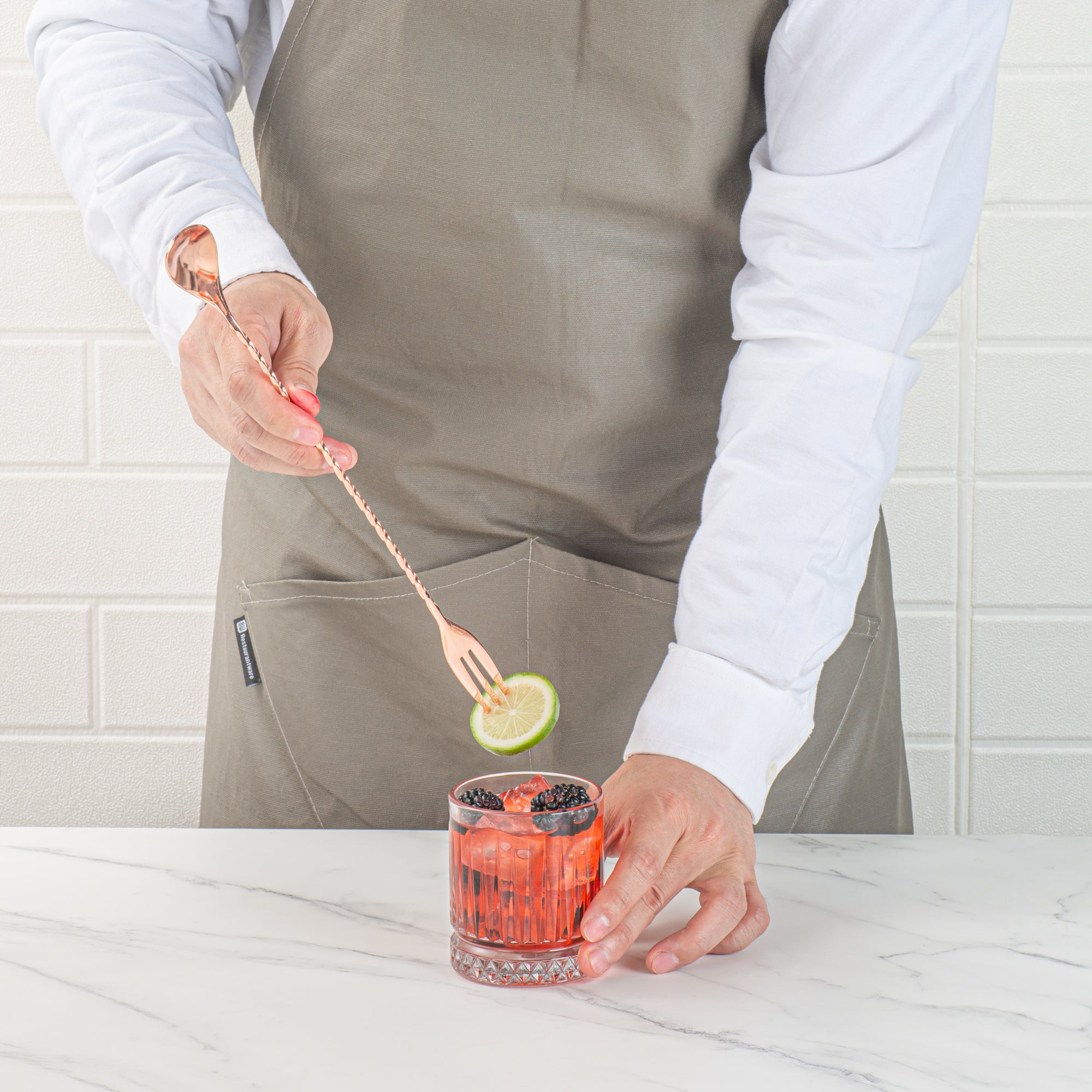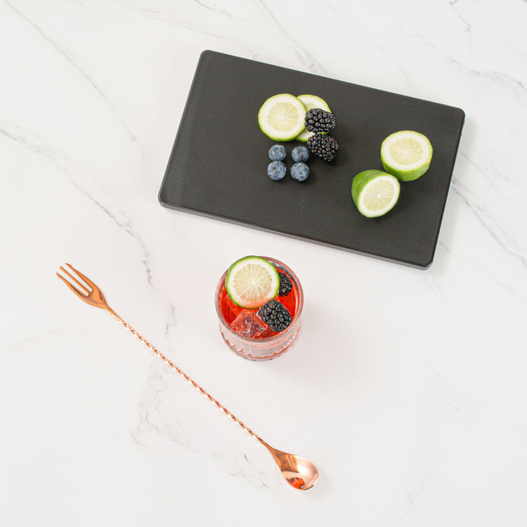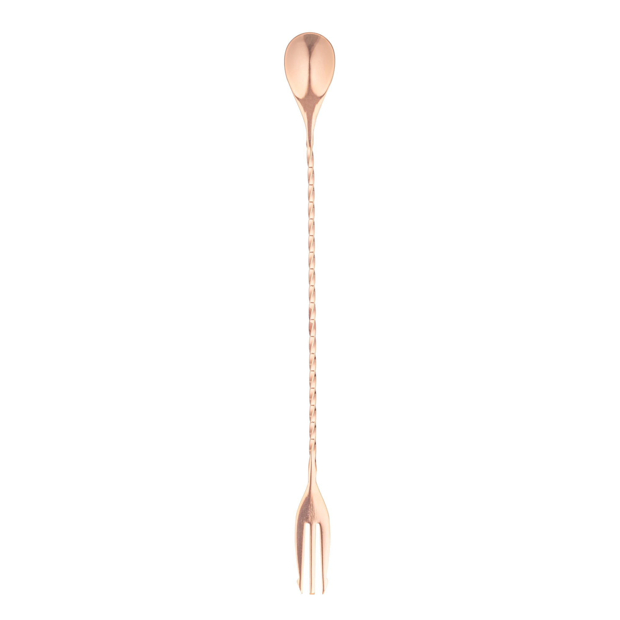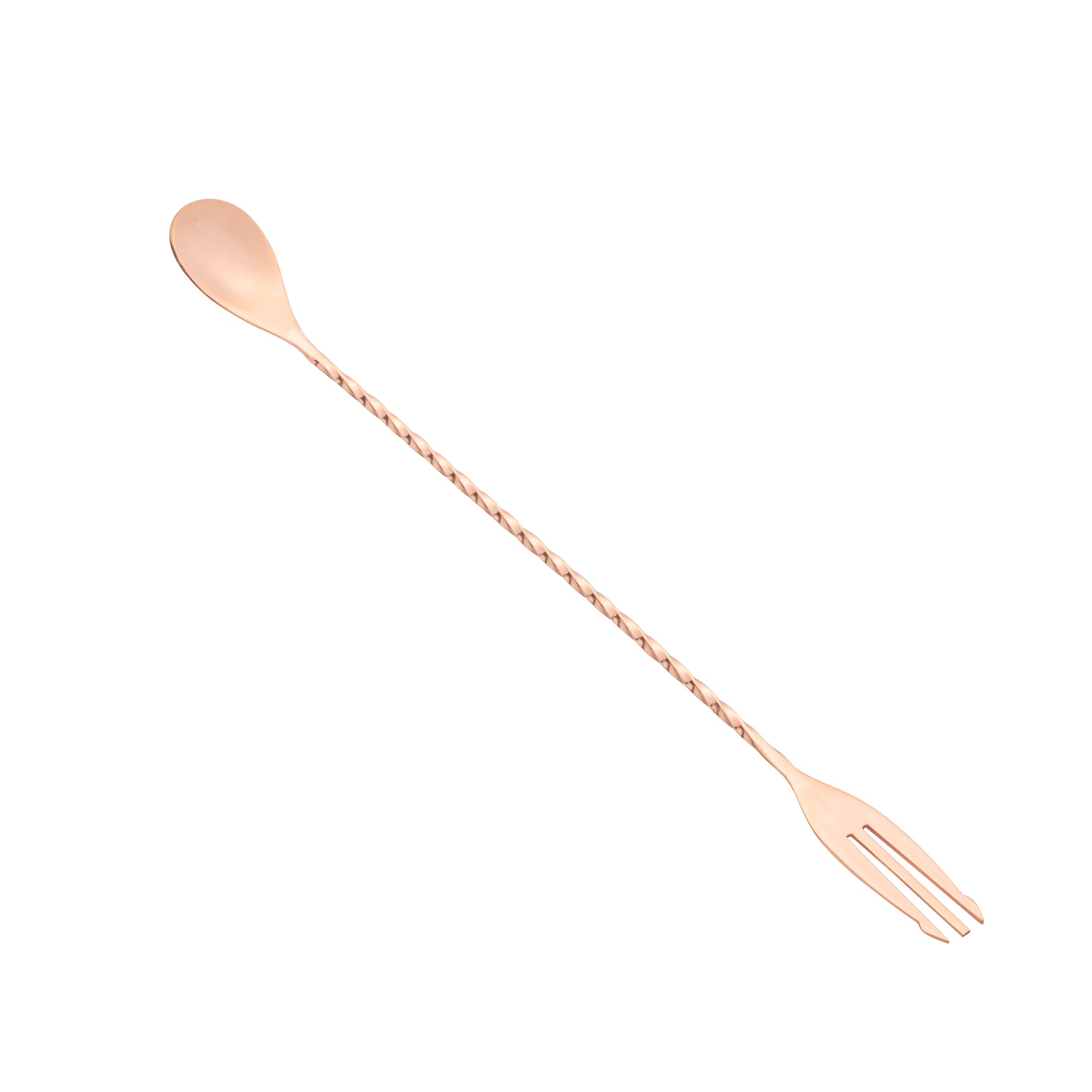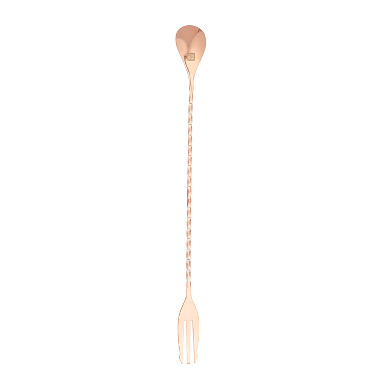 Take your cocktail expertise to the next level with our Bar Lux Copper-Plated Stainless Steel Trident Barspoon. This versatile cocktail spoon is equipped with a 3-prong fork tip, elevating your garnishing and serving capabilities to a new level. The elegantly twirled design of this cocktail stirring spoon ensures practicality, ensuring a comfortable grip for expertly mixing beverages. With its exquisite copper plating, this metal mixing spoon is the perfect addition to any upscale bar, radiating sophistication. The elongated design of this mixing spoon for bar acts as a conduit for spill-free pouring, effectively avoiding any unintended messes. This stainless steel barspoon is a reliable tool for crafting your cocktails with precision. Holding up to 2.5 milliliters of liquid and measuring 12 inches in length, this steel barspoon is a reliable tool for crafting your cocktails. Sold in a 1 count box.