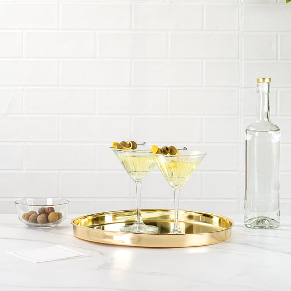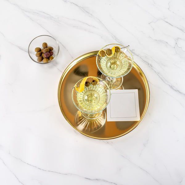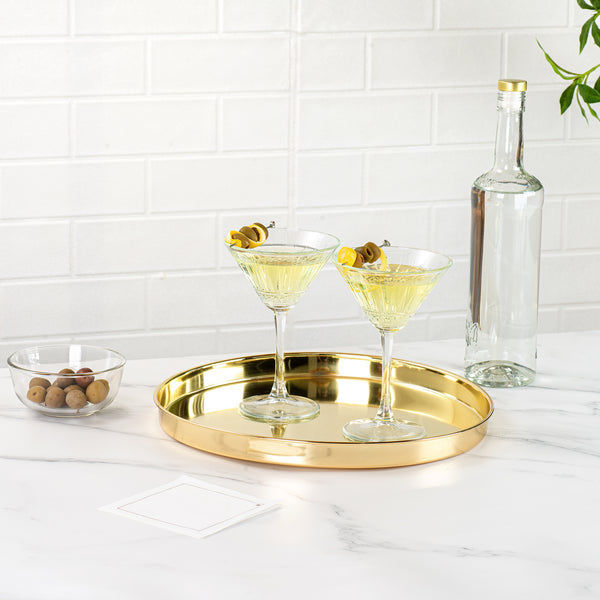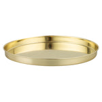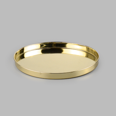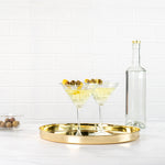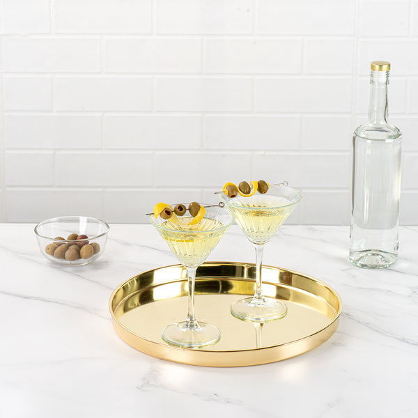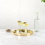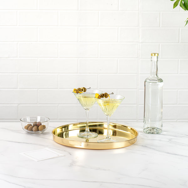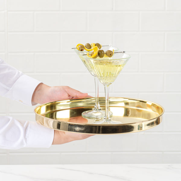 Add a sparkle of style to your serveware with this Bar Lux Gold-Plated Serving Tray. Featuring a reflective gold-plated finish, this decorative serving tray adds an exquisite touch of luxury to any bar, restaurant, or catering event. Its geometric-inspired round design instantly enhances your cocktail or appetizer presentations, while its subtly raised edges prevent annoying slipping and sliding. Measuring 12.6 inches in diameter, this round gold tray can be used to serve miniature appetizers at a cocktail party - or to pass flutes of champagne at a wedding! Each of these gold serving platters is constructed from high-quality stainless steel and designed to withstand commercial use. Browse our coordinating Bar Lux gold-plated barware to complete the look. Handwash only. This 12.6-inch Round Bar Serving Tray is shipped in a 1 count box.