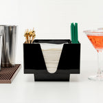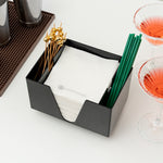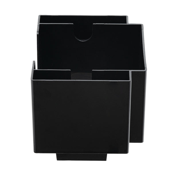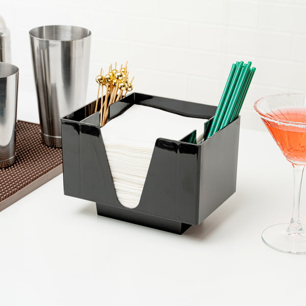 Provide guests with utensils, condiments, and napkins all in one place using our Bar Lux Rectangle Black Plastic Condiment Caddy / Napkin Holders. Equipped with 3 individual compartments, these condiment caddies are meant for multipurpose use at your restaurant, hotel, or catered events. The stylish black finish brings a sleek and simple look to tabletops at your establishment. Designed with a built-in napkin holder at the center, these napkin caddies provide guests with convenient access to napkins. The 2 compartments on the sides of these dispensers can easily hold forks, knives, straws, or condiments. Great for avoiding accidents, the sturdy base of these napkin holders provides superior stability on all surfaces. These condiment caddies are constructed with high-quality plastic and are break-resistant to withstand daily use at your restaurant. These napkin caddies measure 7.9 inches in length by 5.5 inches in width and 5.7 inches in height. Shipped in a 10 count box.