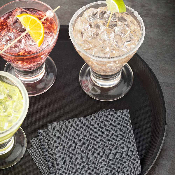 Offer guests a variety of drinks with our Bar Lux Round Black Serving Tray. Designed with a non-slip rubber lining, this food serving tray keeps glasses full of drinks from tipping over during transport. With a round shape, this drinks tray provides ample space for multiple appetizers, desserts, or samples. Equipped with raised edges, this round tray gives employees a secure grip when balancing beverages. The black finish of this food serving tray complements colorful dishes and cups. Crafted from sturdy, premium plastic, this black round serving tray endures everyday use at your restaurant, cafe, or bar. This tea tray is dishwasher-safe to shorten your cleaning process after serving a full house. This non-slip food tray measures 11 inches in diameter. Sold in a 1 count box.