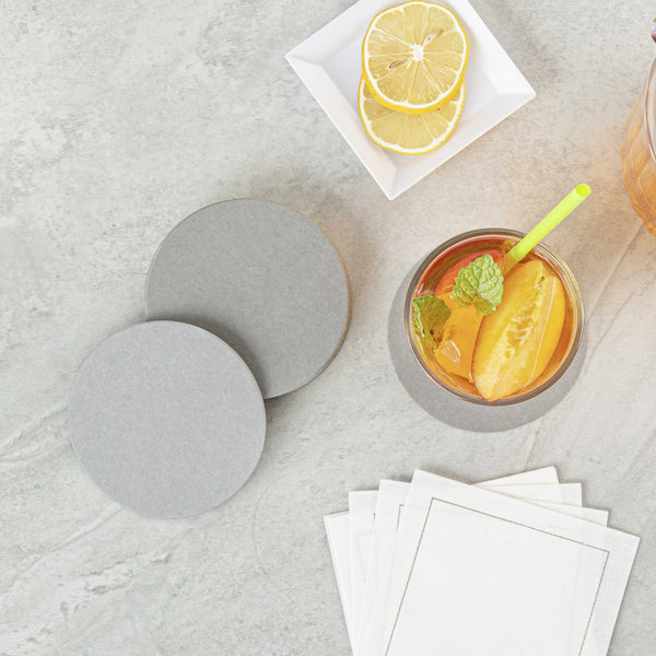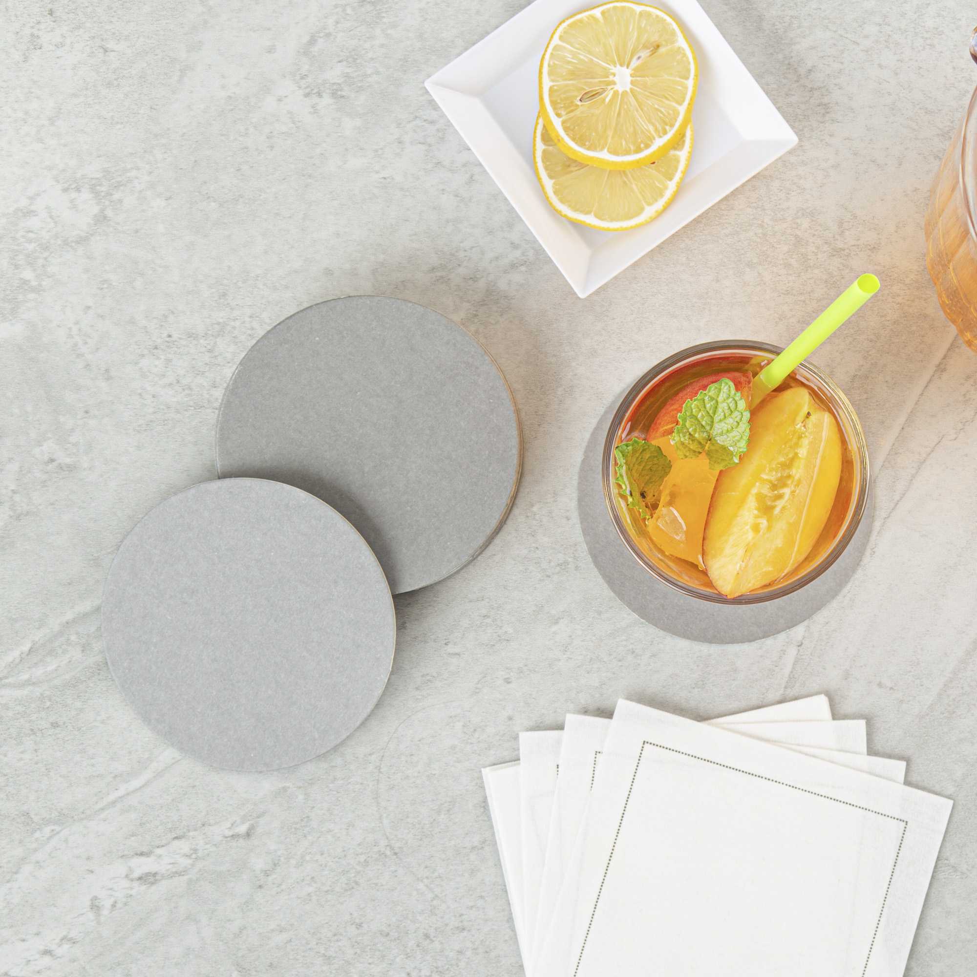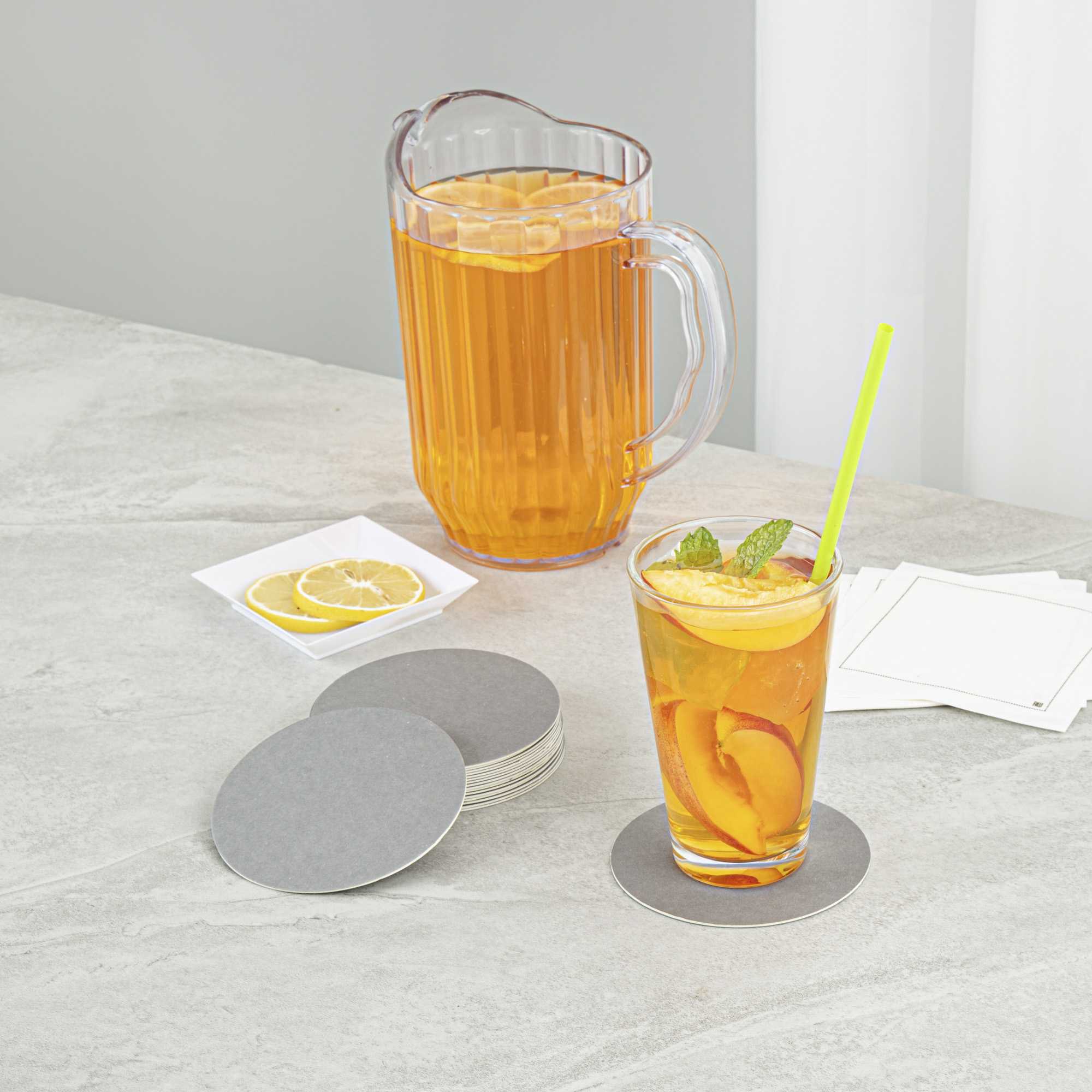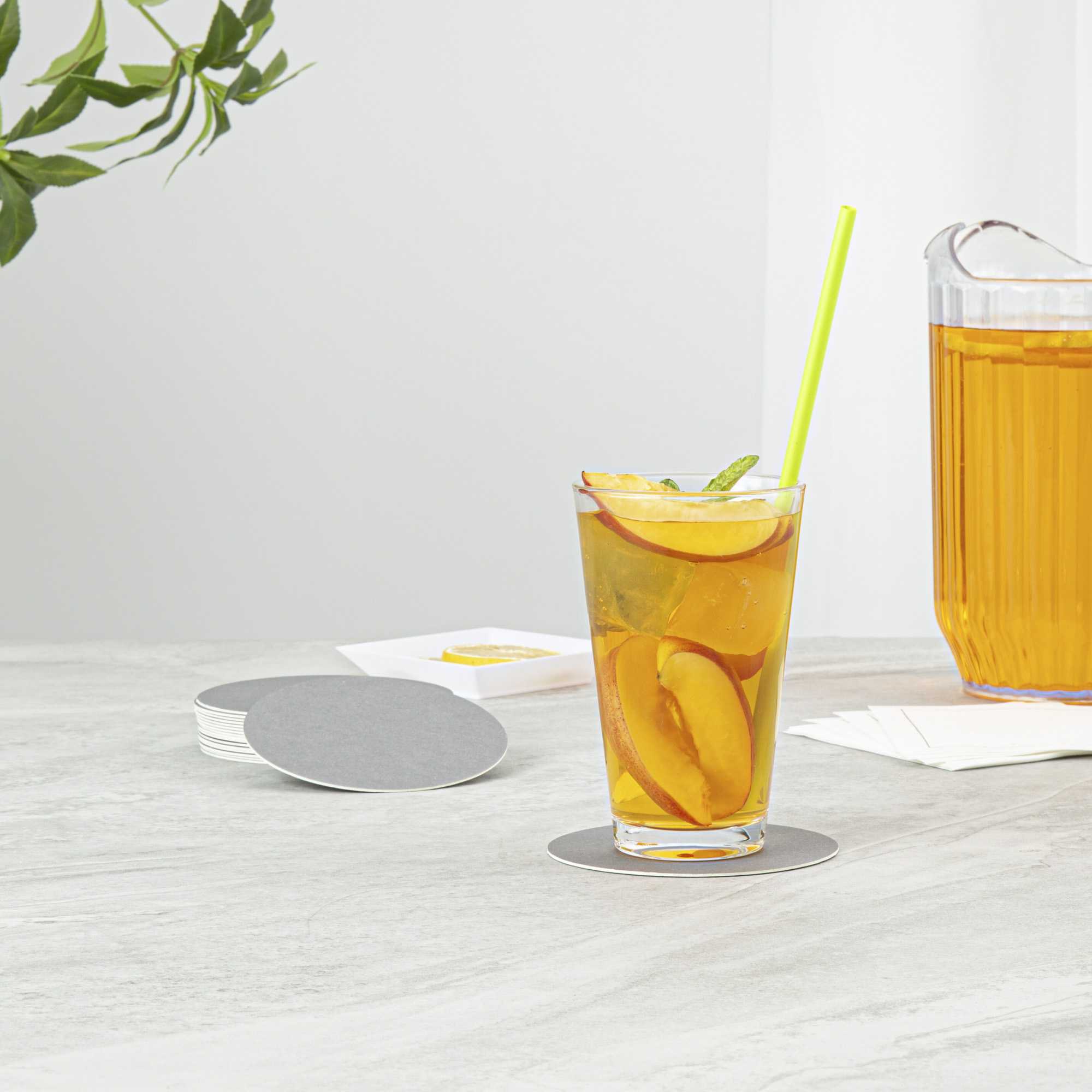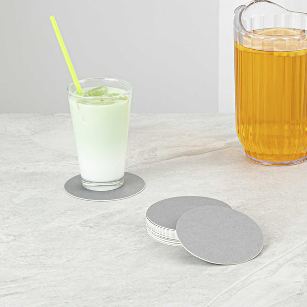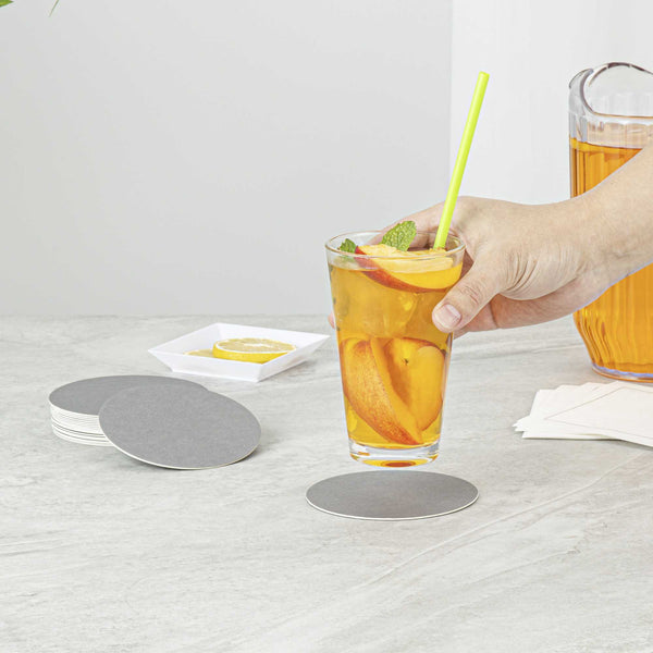 Enhance beverage service with versatile, reusable drink coasters. The Bar Lux Super Absorbent Drink Coaster features a high-density absorbent board that provides superior drying capabilities, allowing each 4-inch round coaster to be quickly reused, reducing waste and cost for busy bars and cafés. With full-color printing, these absorbent coasters offer a unique branding opportunity to showcase logos or designs, making them ideal for elevating the visual appeal of your establishment. Their tear-resistant construction holds up to both hot and cold drinks, ensuring reliability in all drink service scenarios. Made from premium paper, these pulpboard coasters offer an eco-friendly option that protects surfaces from condensation and spills while complementing any decor with their sleek gray color. Invest in these essential tabletop accessories to improve operational efficiency and customer satisfaction. Each order includes 100 Bar Lux Super Absorbent Drink Coasters.