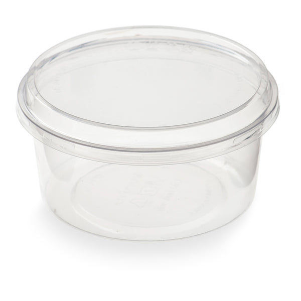 Package individual lunch orders with our Basic Nature 12-ounce Round Clear PLA Plastic To Go Deli Containers. Crafted from premium PLA plastic, these deli cups are commercially compostable to meet the eco-friendly standards of your patrons. Match these plastic to go containers with their coordinating lids to avert messy spills during transport. Featuring a crystal-clear finish, these disposable take out containers display your meals to avoid mixing up orders at your food stand, food truck, or kiosk. Suitable for cold foods only, these clear food containers are freezable to keep your fruits and salads chilled and fresh. These 12-ounce deli cups measure 4.75 inches in diameter by 2.25 inches in height. Sold in a 500 count box. Lids (SKU: RWP0176C and RWP0177C) are available and sold separately. NOTE: Store and use under 105F. Avoid prolonged exposure to direct sunlight. Suitable for cold food items only.