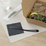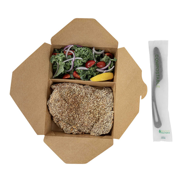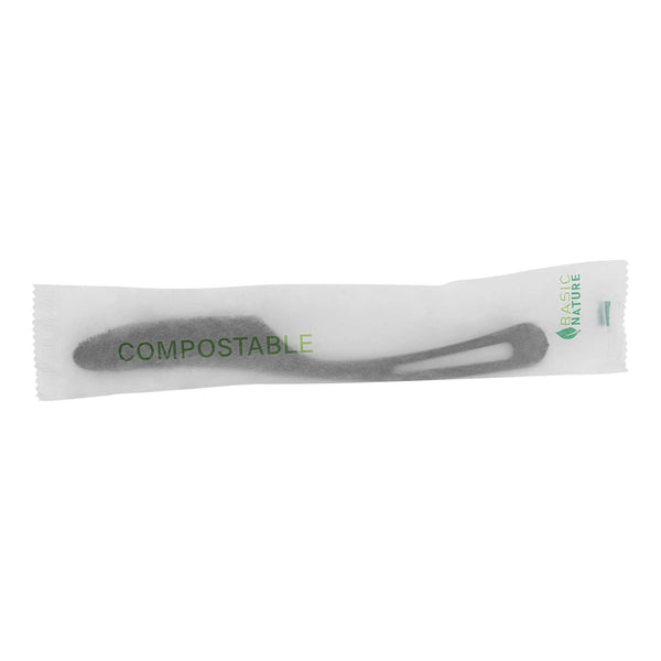 Enhance dining convenience with a reliable compostable knife. The Basic Nature Black Compostable Knife with its serrated blade ensures maximum traction, effortlessly slicing through meats and firm foods, making it essential for catering services. Crafted from premium CPLA plastic, this biodegradable black knife is heat-resistant up to 180 degrees Fahrenheit, maintaining structural integrity for serving hot meals safely and reliably. Its commercially compostable wrapper not only protects the cutlery but also minimizes your carbon footprint, aligning with eco-friendly initiatives in quick-service restaurants. The "compostable" embossment on the handle clearly distinguishes it from conventional plastic flatware, appealing to environmentally conscious patrons in eco-friendly cafés. Featuring a sleek black shade and minimalist design, this serrated plastic knife complements various table settings and occasions. Make a sustainable choice for your foodservice operations today. Each order includes 250 Basic Nature Black Compostable Knives.