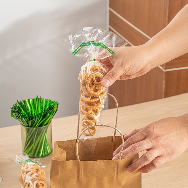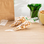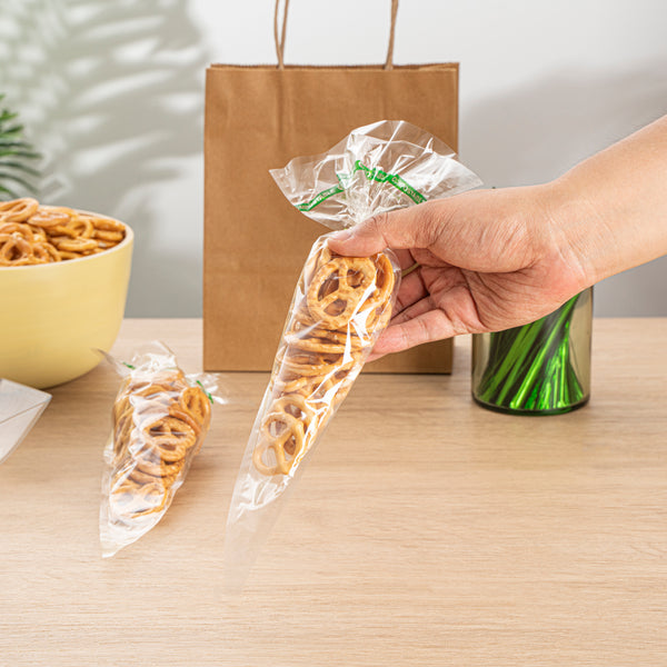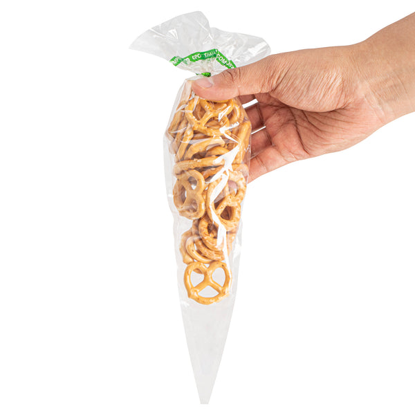Elevate your food packaging with our Basic Nature Clear Plastic Cone Bags, perfect for bakery bags and bread bags for homemade bread. These compostable bread bags are crafted from eco-conscious plastic cellophane, ensuring that your homemade bread stays fresh while being conscious of the environment. These bread packaging bags guarantee that your baked goods remain uncontaminated and wholesome. These wicker poly bags feature a dispenser that makes handling and storing bread loaf bags effortless. This unique bread freezer bag is heat sealable, providing a secure seal to keep your bread fresh even in freezer conditions. With a clear finish, these plastic bread bags showcase your delicious creations while offering easy product identification. Each of these bags for baked goods measures 12.01 inches in length by 6.02 inches in width. Sold in a 100 count box.