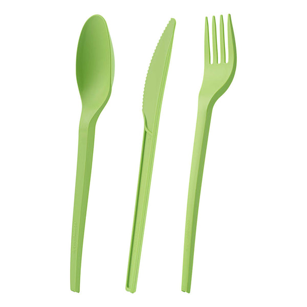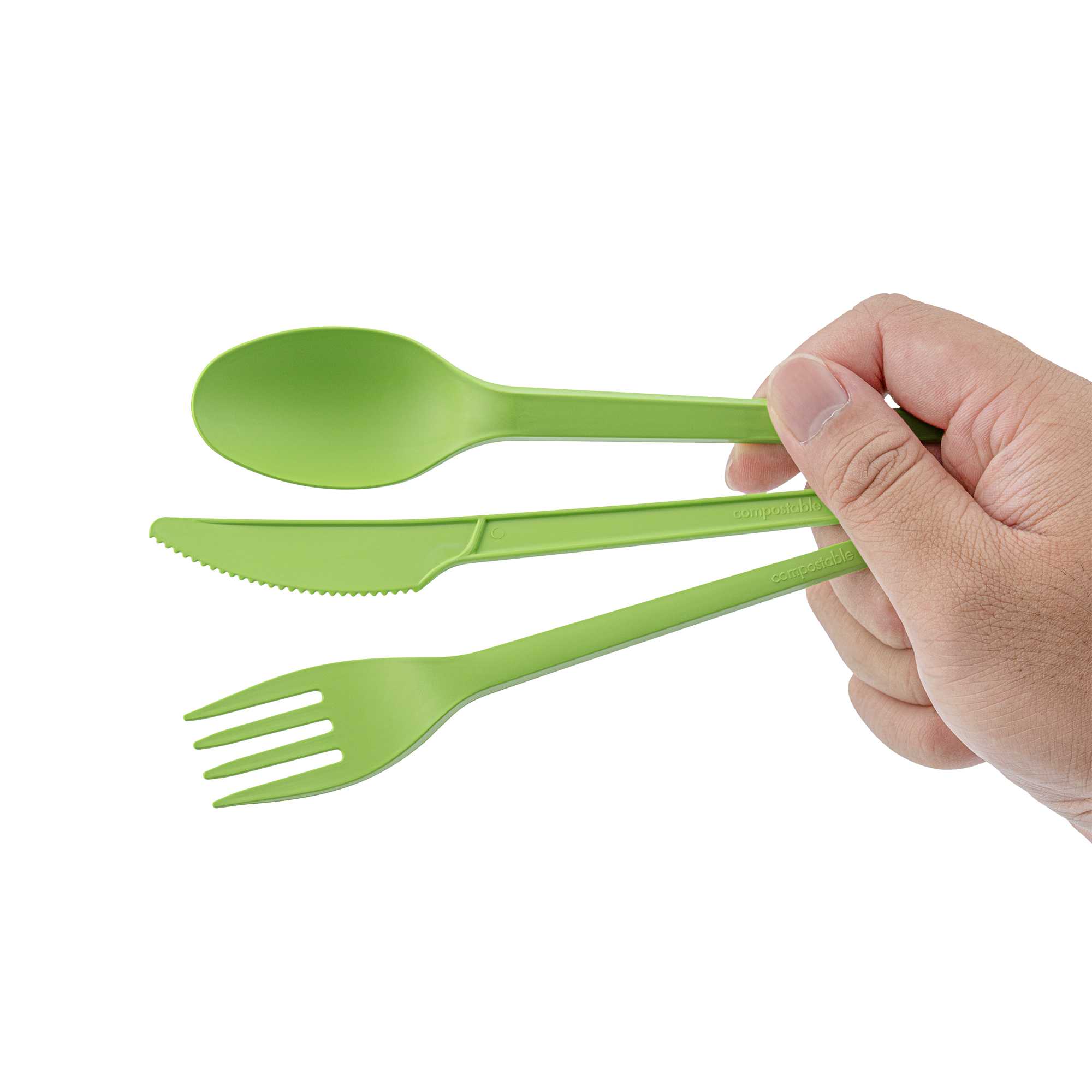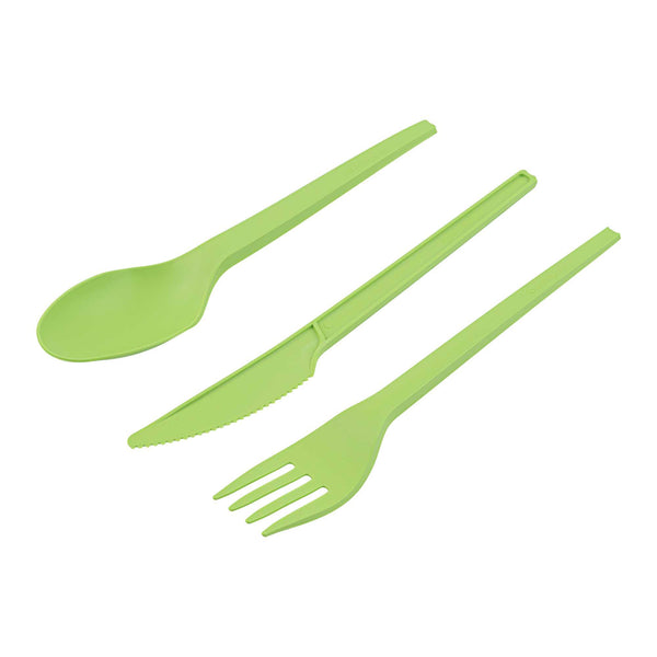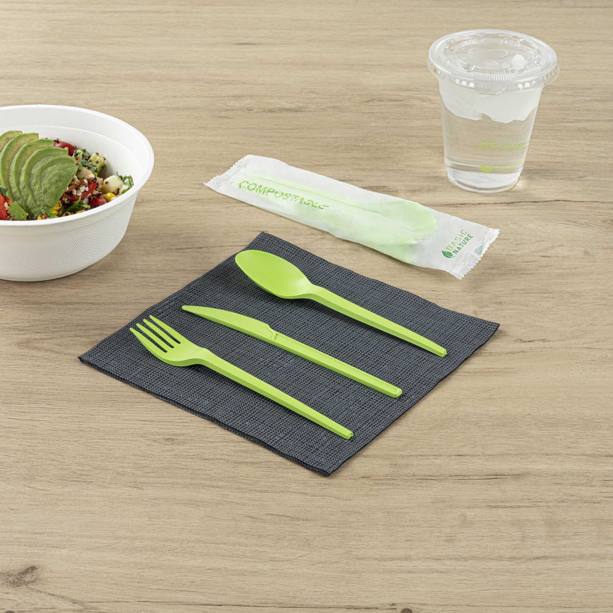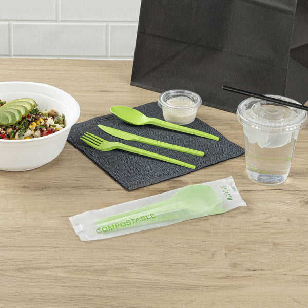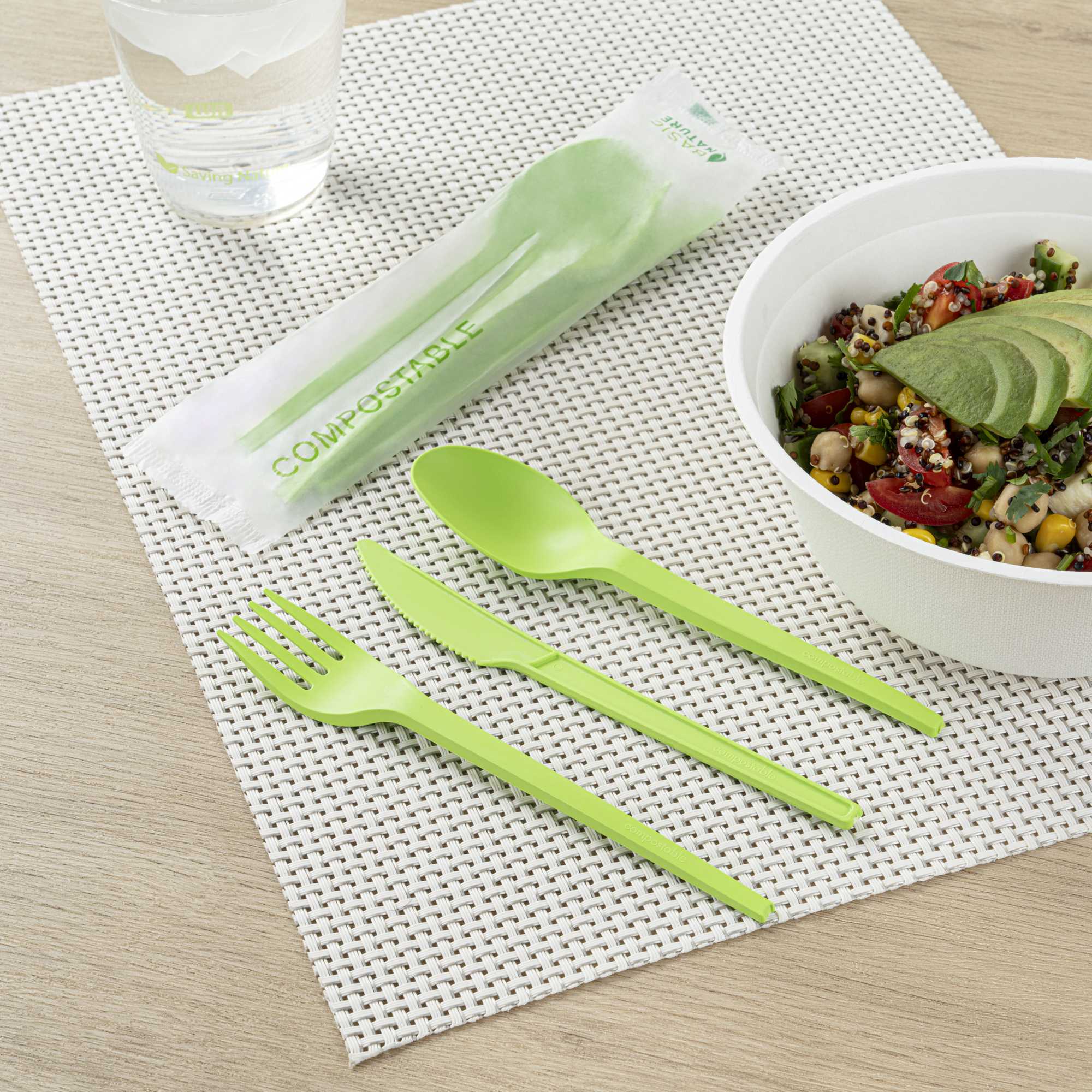 GREEN CPLA PLASTIC CUTLERY SET - COMPOSTABLE WRAPPER, HEAT-RESISTANT
