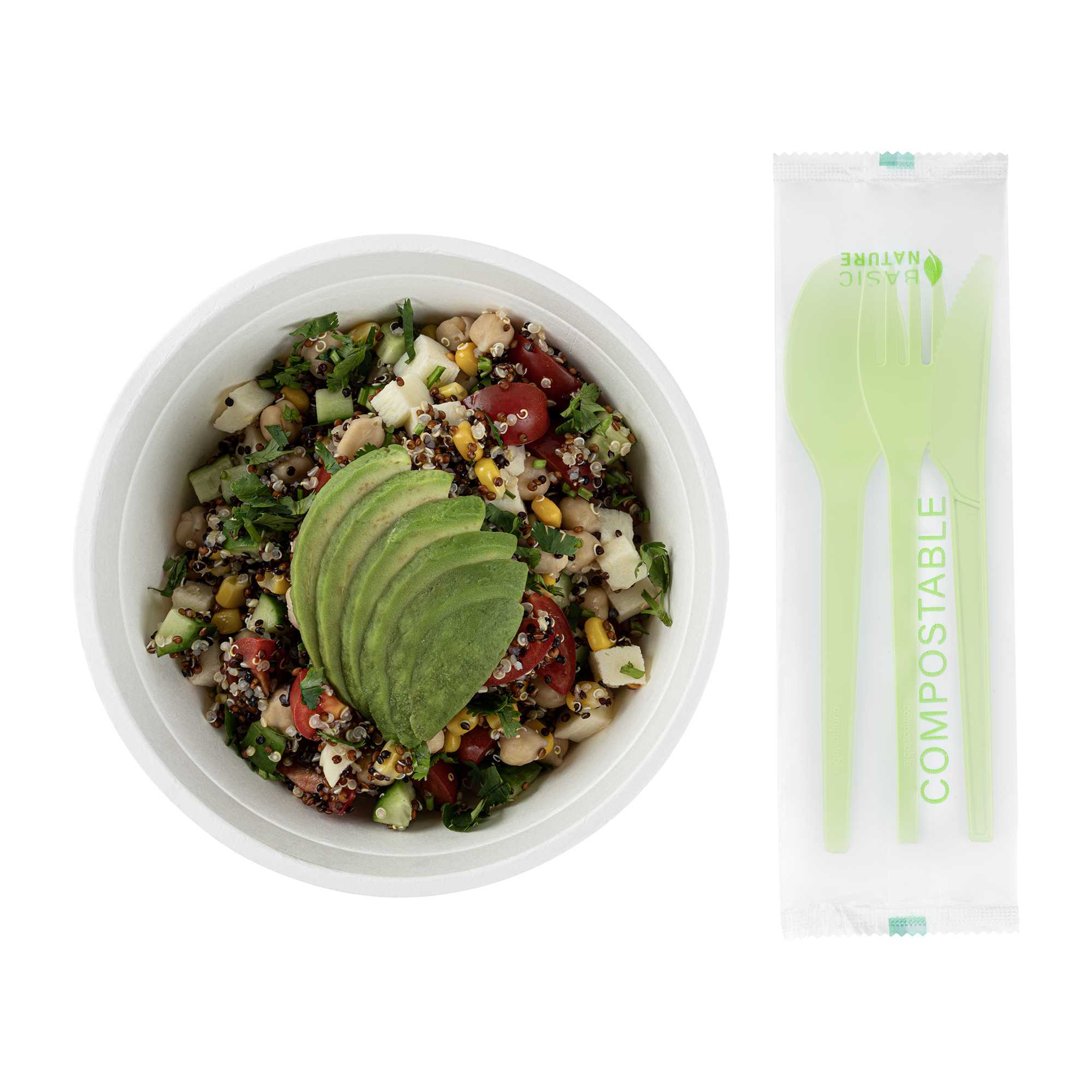 Enhance your eco-friendly dining experience with sustainable cutlery. The Basic Nature Compostable Cutlery Set boasts a reinforced handle that allows you to scoop up hefty bites without breaking, making it ideal for catering events and foodservice operations. Crafted from premium CPLA plastic, this BPI-certified compostable utensil set is heat-resistant up to 180F, letting you confidently serve hot dishes. Each piece is enveloped in a commercially compostable wrapper that protects the cutlery while significantly reducing your carbon footprint. Measuring 6.5 inches in length, these green utensils not only add a vibrant touch to table settings but also feature an embossed "compostable" label, guiding customers in proper disposal methods and supporting your sustainability initiatives. Elevate your restaurant's takeout service with this reliable, heat-resistant cutlery that prioritizes environmental responsibility. Each order includes 100 Basic Nature Compostable Cutlery Sets.