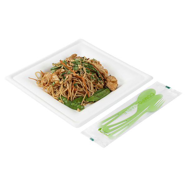 Serve meals confidently with eco-friendly cutlery that won't falter. The Basic Nature Compostable Utensil Set, crafted from premium CPLA plastic, features a reinforced handle to support hefty bites without breaking, ensuring reliability during service. This compostable utensil set is heat-resistant up to 180 degrees Fahrenheit, making it ideal for serving hot dishes without compromising safety or performance. Additionally, the biodegradable knife fork spoon set is wrapped in a commercially compostable wrapper, effectively minimizing your operation's carbon footprint and aligning with sustainable practices. With dimensions of 8.75 inches in length and 2.75 inches in width, this CPLA plastic cutlery provides a comfortable and sturdy grip for diners. Elevate your dining experience while promoting environmental responsibility with this green cutlery solution. Each order includes 100 Basic Nature Compostable Utensil Set.