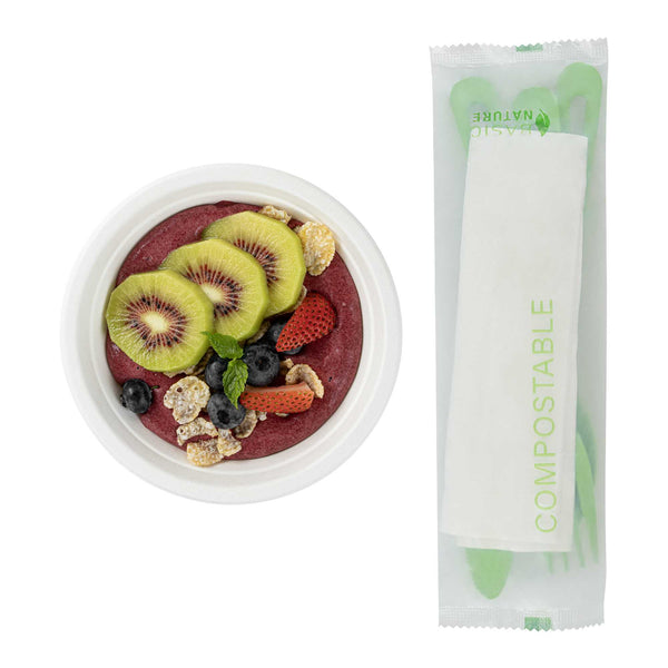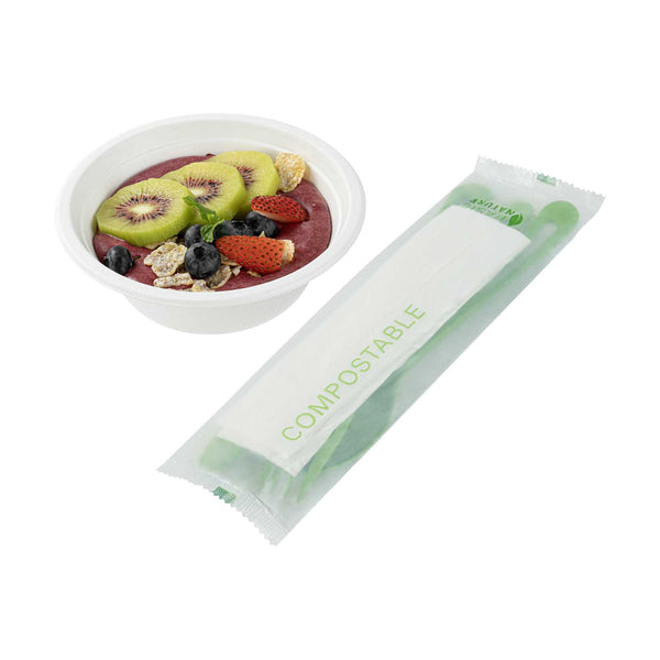 Enhance your eco-friendly dining experience effortlessly. Basic Nature Compostable Utensils feature a reinforced handle, allowing you to scoop up hefty bites without breaking, making them ideal for any busy foodservice operation. Crafted from premium CPLA plastic, these utensils are heat-resistant up to 180 degrees Fahrenheit, letting you enjoy hot dishes without worry of melting or deformation—a perfect choice for serving hot meals. Each biodegradable cutlery set is enclosed in a commercially compostable wrapper, which protects the cutlery while minimizing your carbon footprint, making it an excellent option for caterers seeking sustainable solutions. With an embossed "compostable" print on the handle, these utensils stand out as an environmentally responsible choice, distinguishing them from traditional plastic cutlery. Ideal for grab-and-go meals or catering events, this individually wrapped cutlery ensures maximum hygiene for your customers. Each order includes 100 Basic Nature Compostable Utensils.