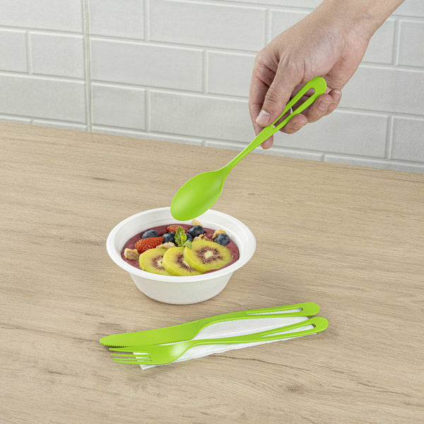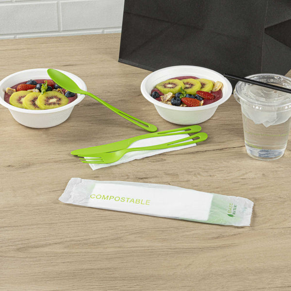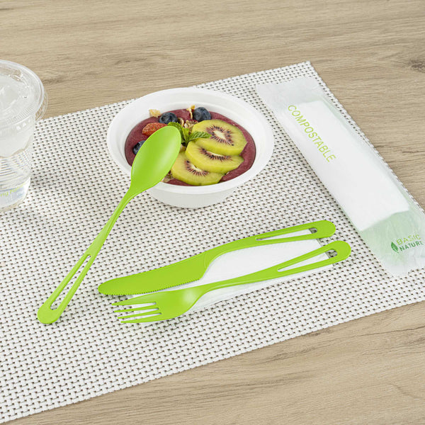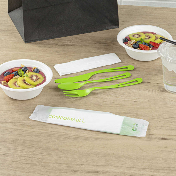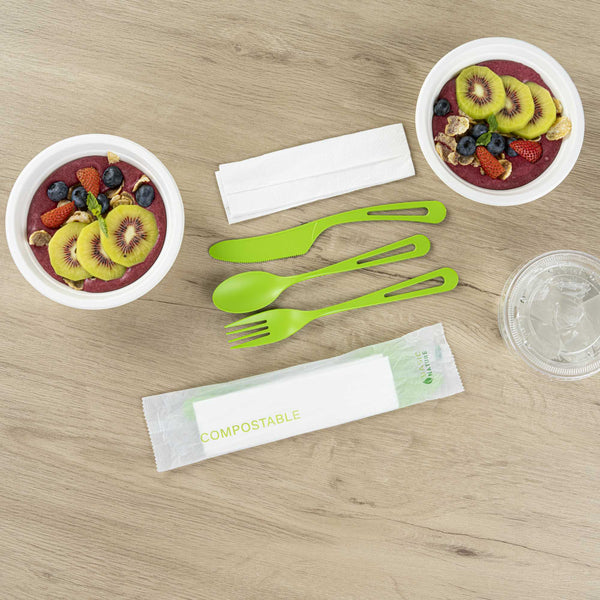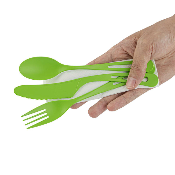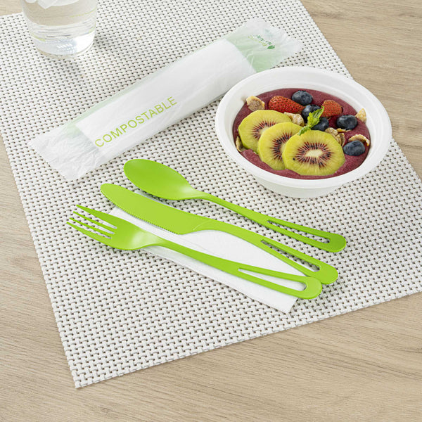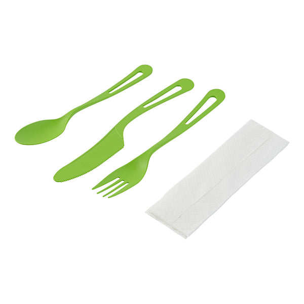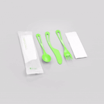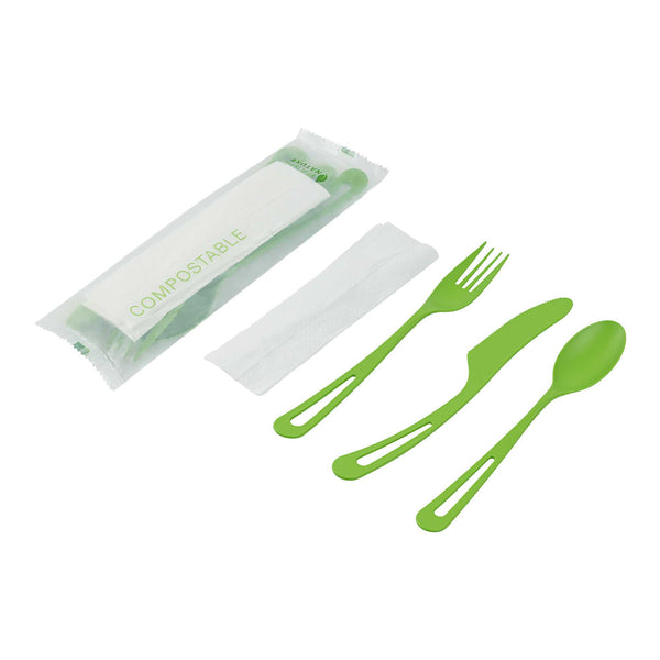 GREEN CPLA PLASTIC CUTLERY SET - WRAPPER, WHITE NAPKIN, HEAT-RESISTANT