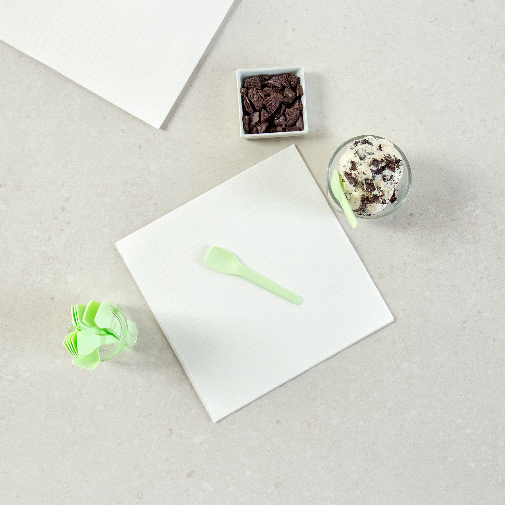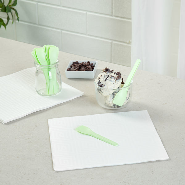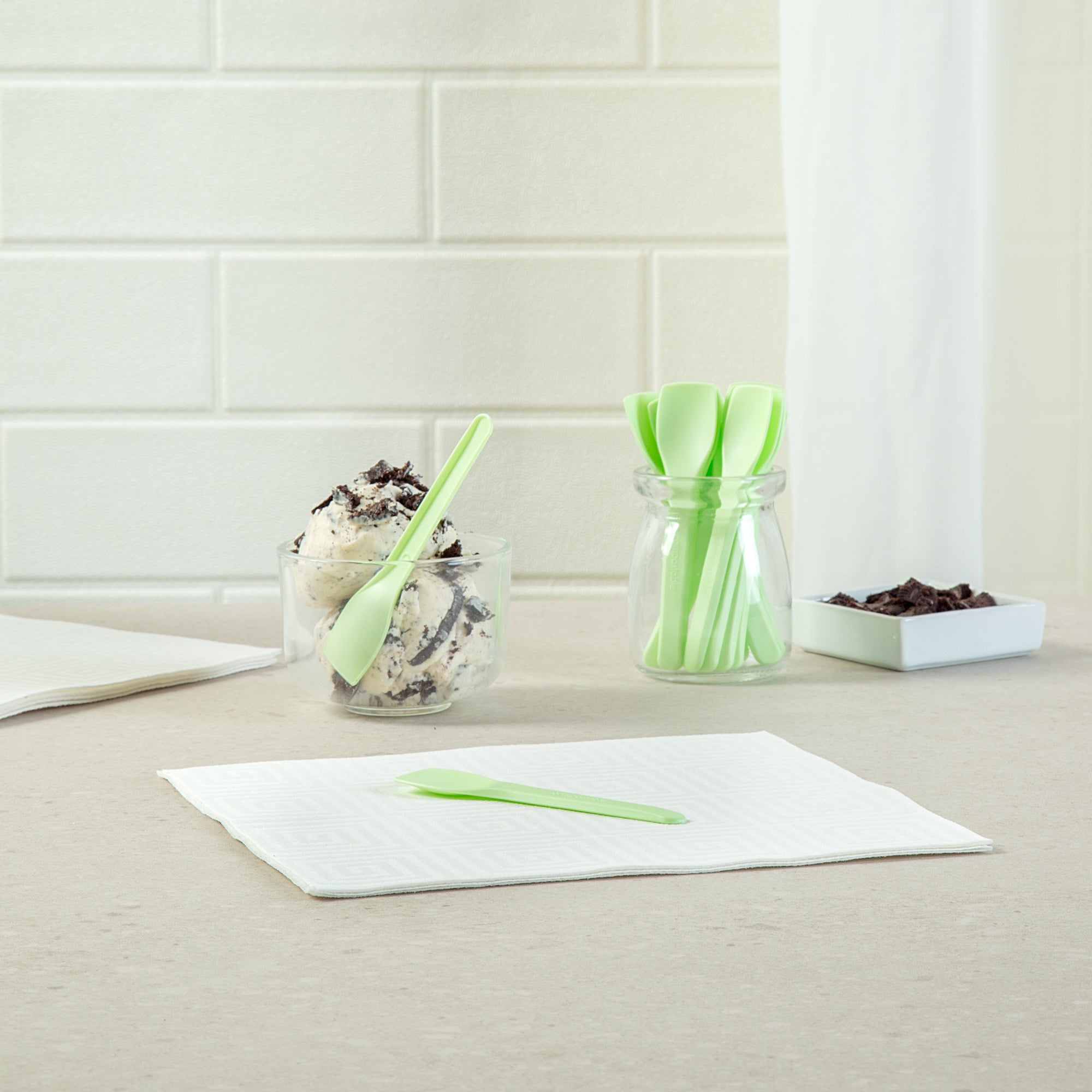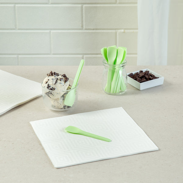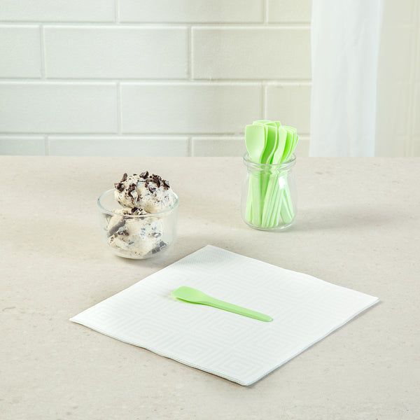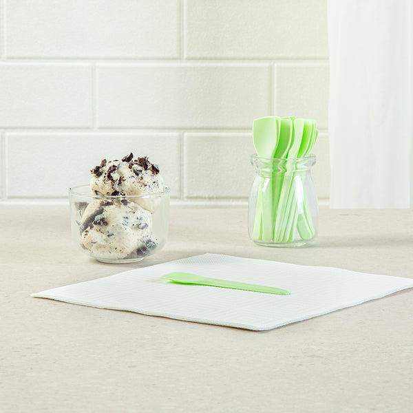 Enhance your serving solutions with versatile compostable spoons. The Basic Nature Compostable Ice Cream Sampling Spoon offers a sustainable choice for your foodservice operations, featuring a compostable material that significantly reduces landfill waste. This biodegradable dessert spoon is crafted from plant-based CPLA, a renewable resource, making it both environmentally responsible and visually appealing in its green hue. With a heat tolerance, this compostable tasting spoon ensures safe serving of both hot and cold foods, such as ice cream, yogurt, and desserts, without warping. Measuring 4 inches in length, its multipurpose design accommodates a variety of treats, providing flexibility in your menu offerings. These spoons are an excellent addition to any establishment aiming to maintain a sustainable footprint while delivering exceptional service. Each order includes 100 Basic Nature Compostable Ice Cream Sampling Spoons.