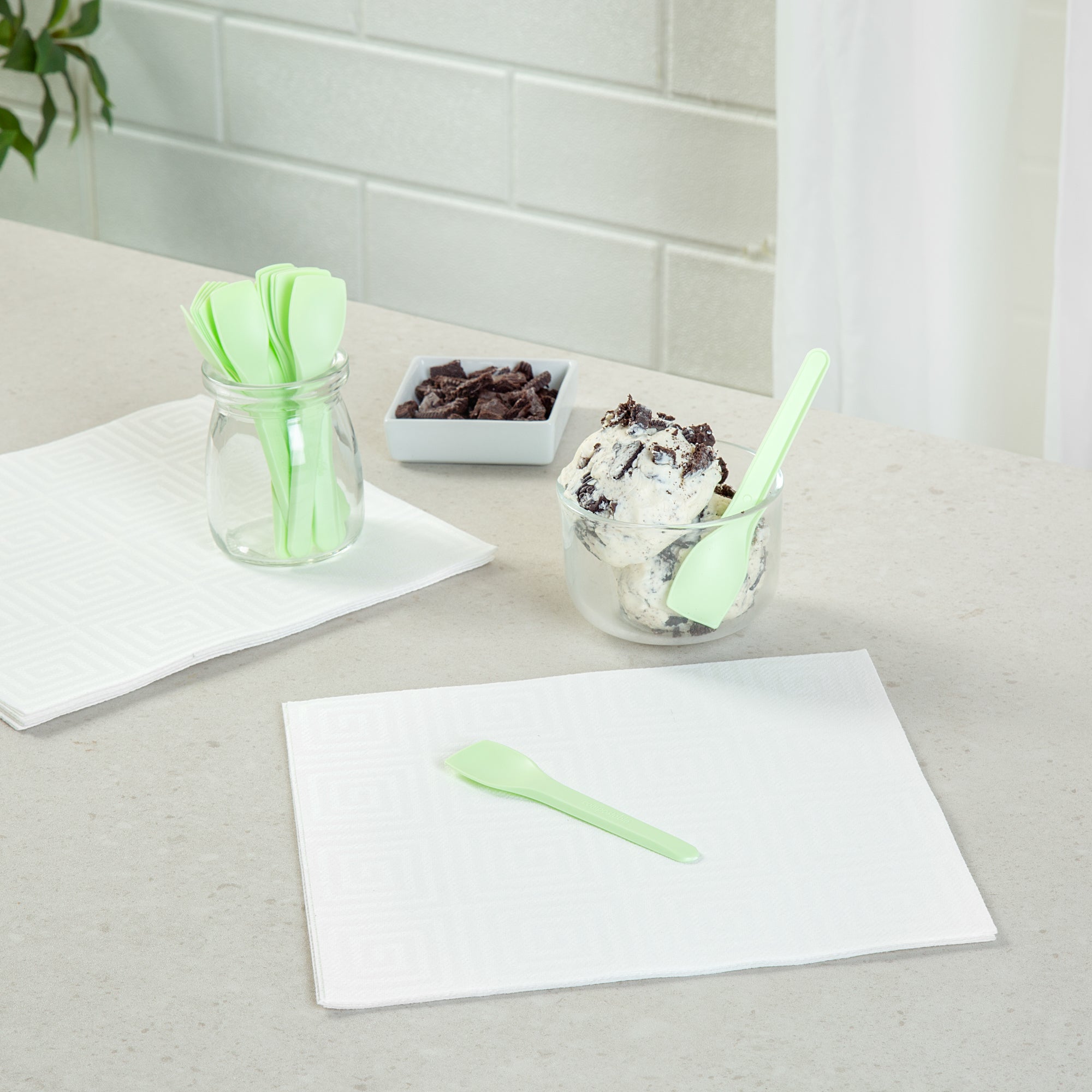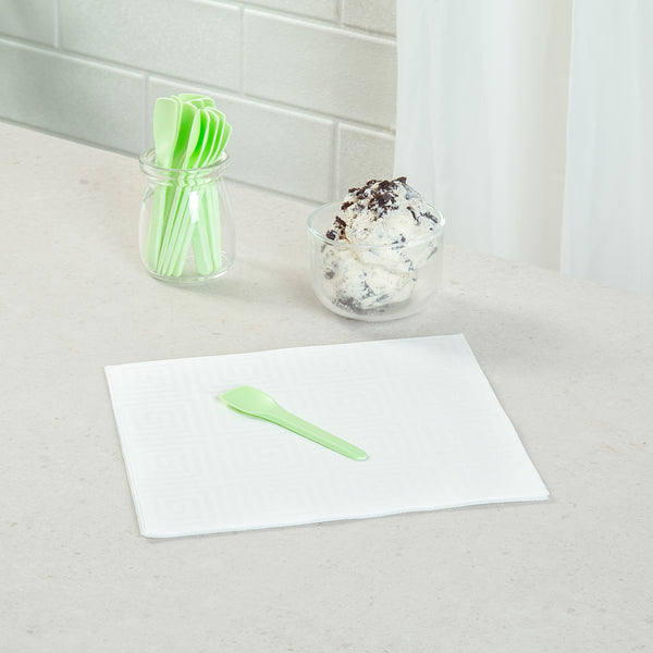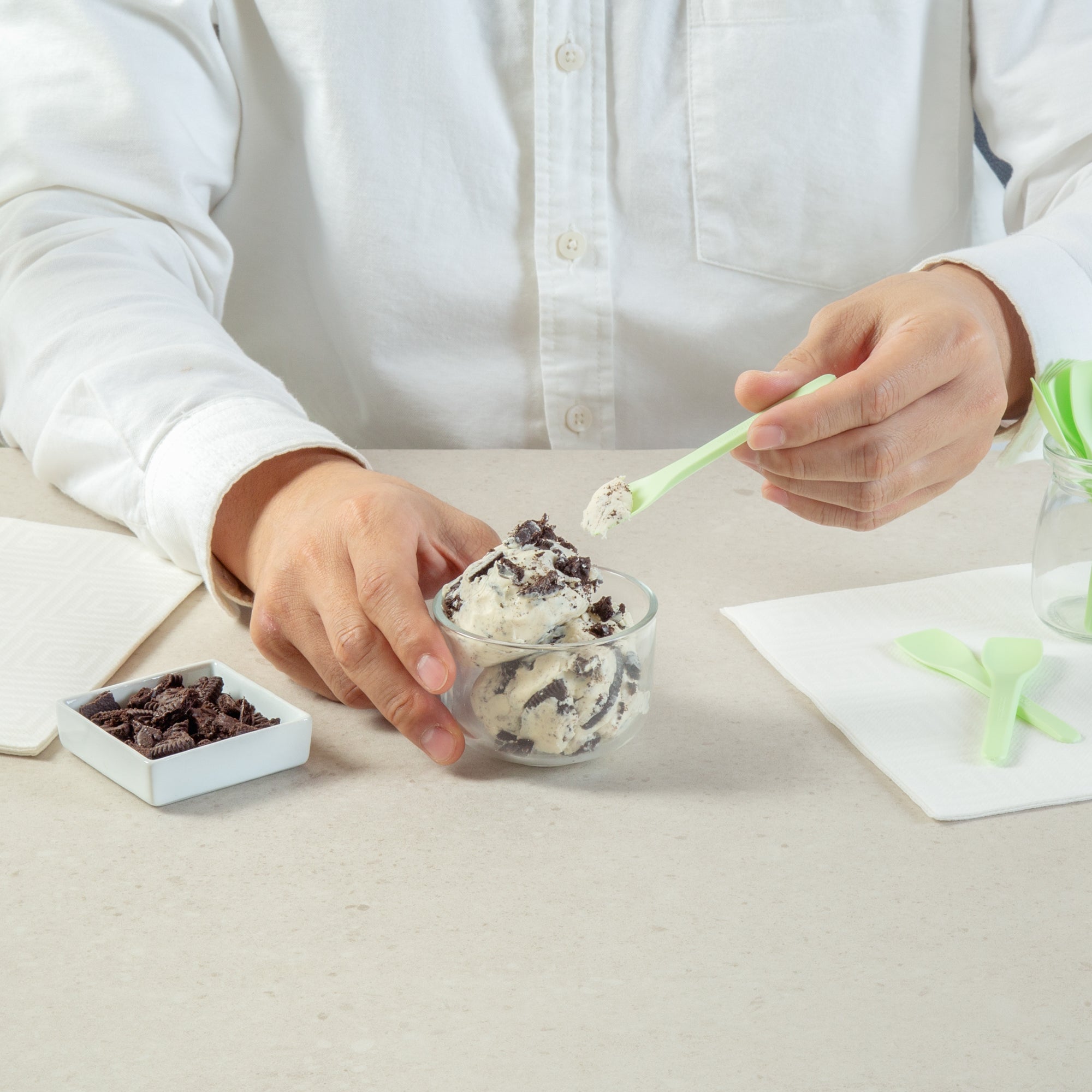 Enhance your serving solutions with versatile compostable spoons. The Basic Nature Compostable Ice Cream Sampling Spoon offers a sustainable choice for your foodservice operations, featuring a compostable material that significantly reduces landfill waste. This biodegradable dessert spoon is crafted from plant-based CPLA, a renewable resource, making it both environmentally responsible and visually appealing in its green hue. With a heat tolerance, this compostable tasting spoon ensures safe serving of both hot and cold foods, such as ice cream, yogurt, and desserts, without warping. Measuring 4 inches in length, its multipurpose design accommodates a variety of treats, providing flexibility in your menu offerings. These spoons are an excellent addition to any establishment aiming to maintain a sustainable footprint while delivering exceptional service. Each order includes 100 Basic Nature Compostable Ice Cream Sampling Spoons.