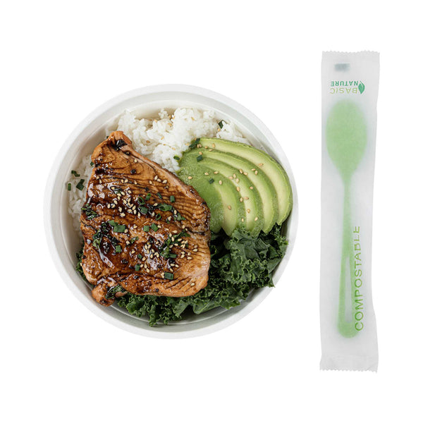 Enhance your eco-friendly service with reliable utensil choices. The Basic Nature Reinforced Handle Compostable Spoon features a reinforced handle, allowing you to scoop hefty bites without breaking, making it an ideal choice for catering events. Crafted from premium CPLA plastic, this spoon is heat-resistant up to 180 degrees Fahrenheit, ensuring that guests enjoy hot dishes without concern. The commercial compostable wrapper not only protects the cutlery but also reduces the carbon footprint, making it a top choice for biodegradable flatware. With a length of 7.2 inches, this heat-resistant spoon is perfect for takeout and delivery services, providing customers with individually wrapped, sustainable utensils. The green finish adds vibrancy to any table setting, enhancing the visual appeal in cafeterias and quick-service restaurants. Choose this compostable spoon for a dependable and sustainable cutlery solution. Each order includes 250 Basic Nature Reinforced Handle Compostable Spoons.
