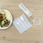 Choose from our individual forks, spoons, knives, or cutlery kits with napkins to easily set tables and clean up after meals. With these plastic cutlery wrapped sets, every guest will have clean untensils.