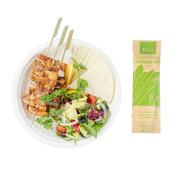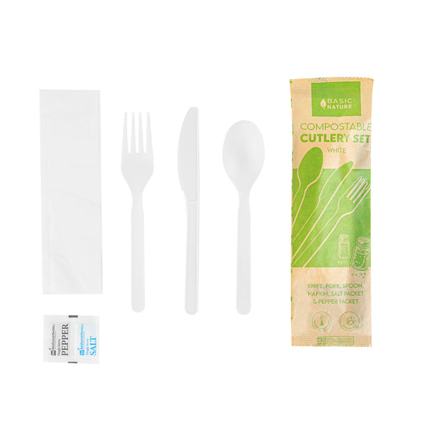 Elevate sanitation and convenience with a complete dining set solution. The Basic Nature Compostable Plastic Cutlery Set offers a full dining package with a spoon, fork, and knife, all made from cPLA, a commercially compostable material derived from renewable resources that supports sustainability initiatives. This plastic cutlery set is individually wrapped in a paper bag, ensuring hygiene for take-out by protecting utensils from contamination. Enhance meal convenience with included salt and pepper packets, making this disposable cutlery pack an ideal choice for food trucks and catering events. Measuring 6.3 inches by 2.7 inches by 1.2 inches, this set is cold and hot food friendly, providing versatility for light fare catering. Trust in its recyclable nature to meet your eco-friendly needs while delivering on reliability. Each order includes 250 Basic Nature Compostable Plastic Cutlery Set.