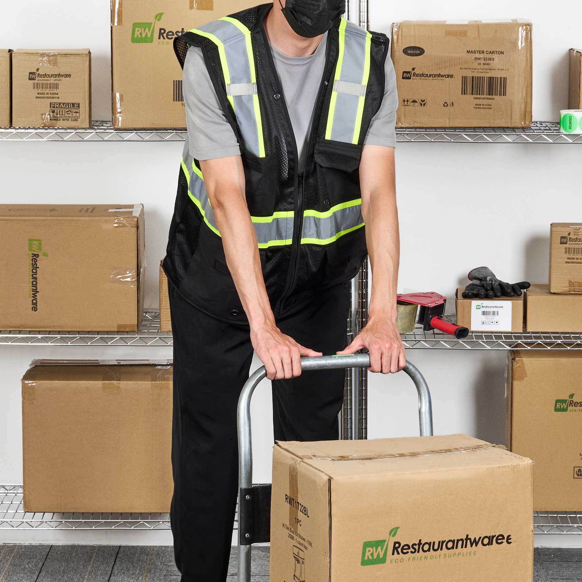 Enhance staff safety and efficiency with our high-visibility solution. The Be Safe Reflective Stripes High Visibility Vest, constructed from black plastic, is specifically designed for warehouse and event staff, ensuring they remain visible in busy environments. This high visibility vest features reflective strips that significantly enhance safety, particularly in dimly lit areas, ensuring your team is always seen. Equipped with multiple pockets, this vest efficiently organizes tools and order pads, streamlining operations and reducing downtime. A convenient zipper front closure allows for quick and secure fitting, making it an essential reflective safety vest for fast-paced settings. With a length of 29.21 inches and a width of 30.32 inches, this vest is both versatile and practical. Its machine washable design aligns with eco-friendly practices, supporting sustainability in your operations. Sold in a 1 count box.