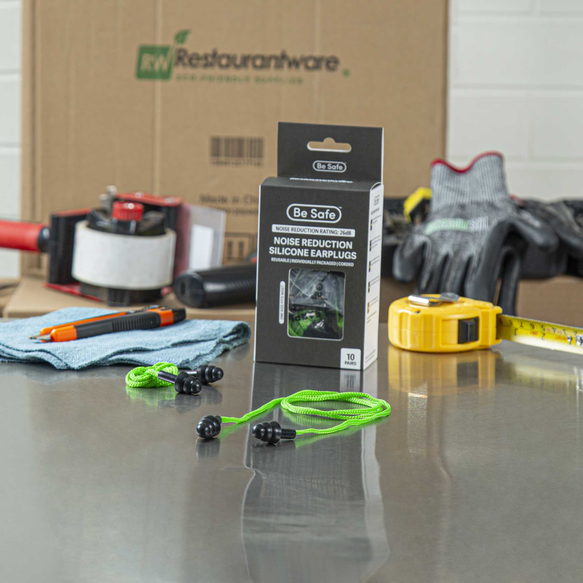 Ensure optimal kitchen efficiency with ANSI-rated noise reduction. The Be Safe Black and Green Silicone Corded Earplugs offer a precise design with their 2.76 inches length to effectively decrease ambient sound by 26dB, making them ideal noise reduction earplugs for any bustling kitchen environment. Crafted from pure silicone, these earplugs provide superior comfort and low pressure, while their humidity and sweat-resistant properties prevent moisture buildup, ensuring long-lasting wear. These shooting range ear protection earplugs feature a convenient nylon cord that keeps them secure and easily accessible during busy shifts. With their three-layered, Christmas tree design, they fit comfortably in most ear canals, offering premium protection for culinary professionals. Streamline your inventory management with 10 pairs per box.