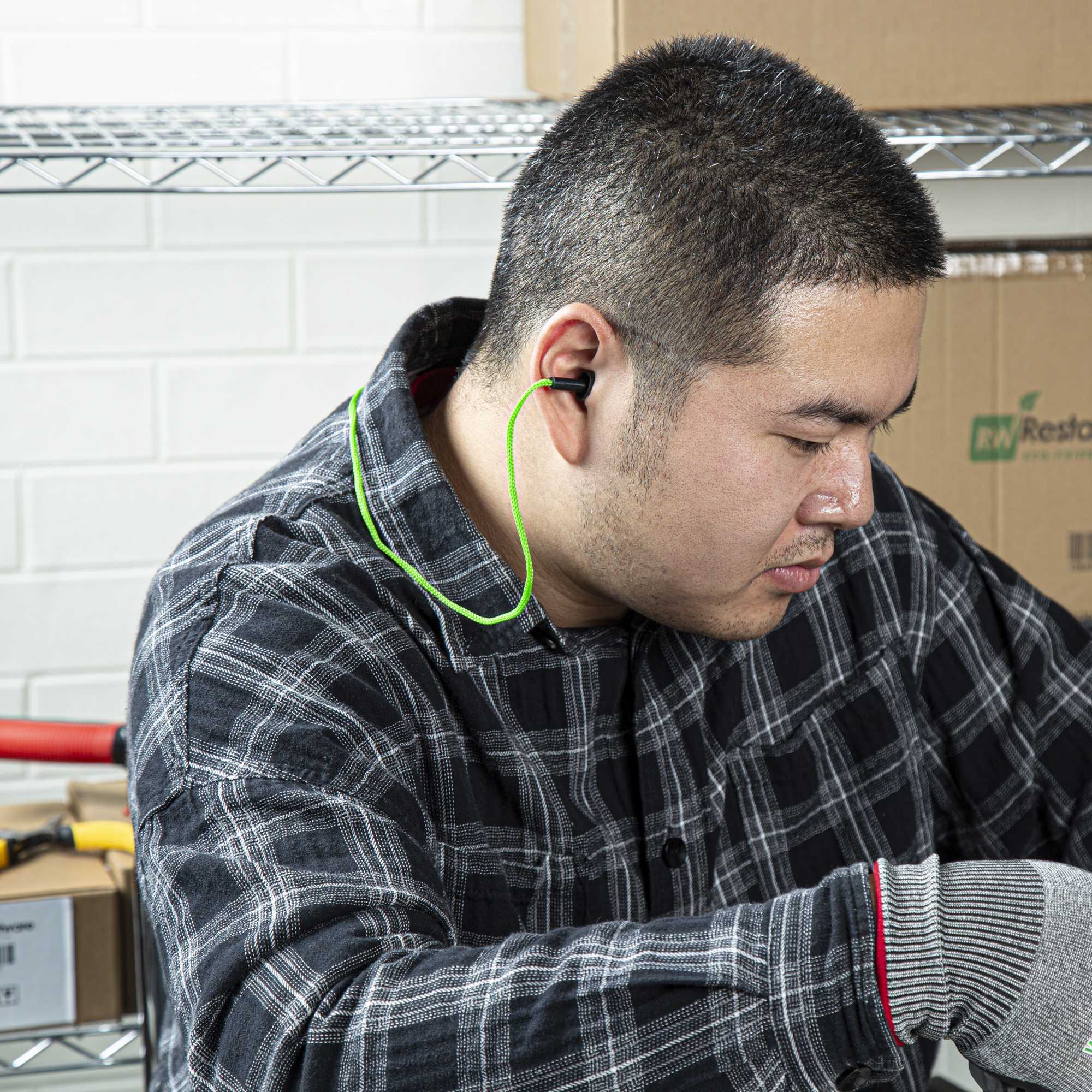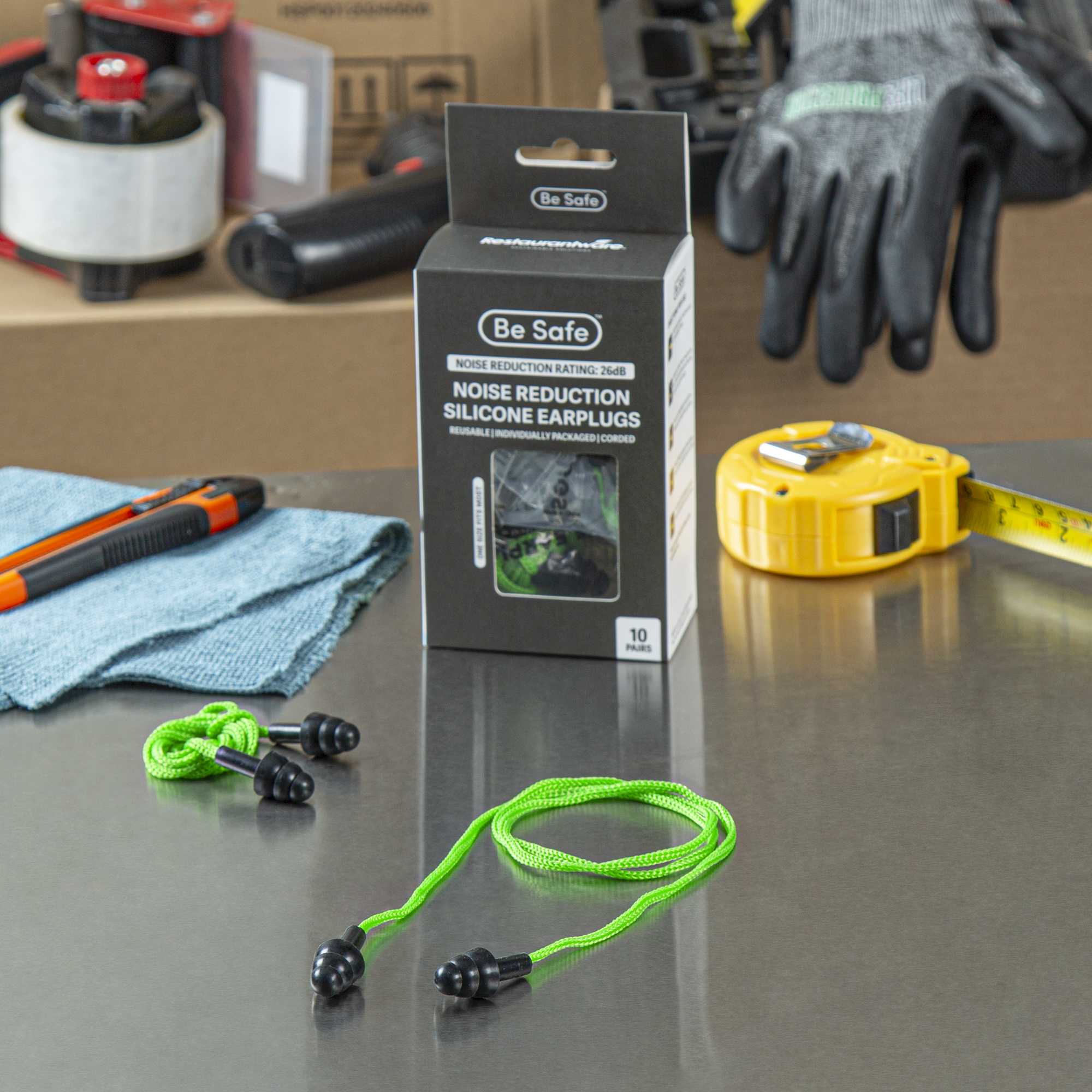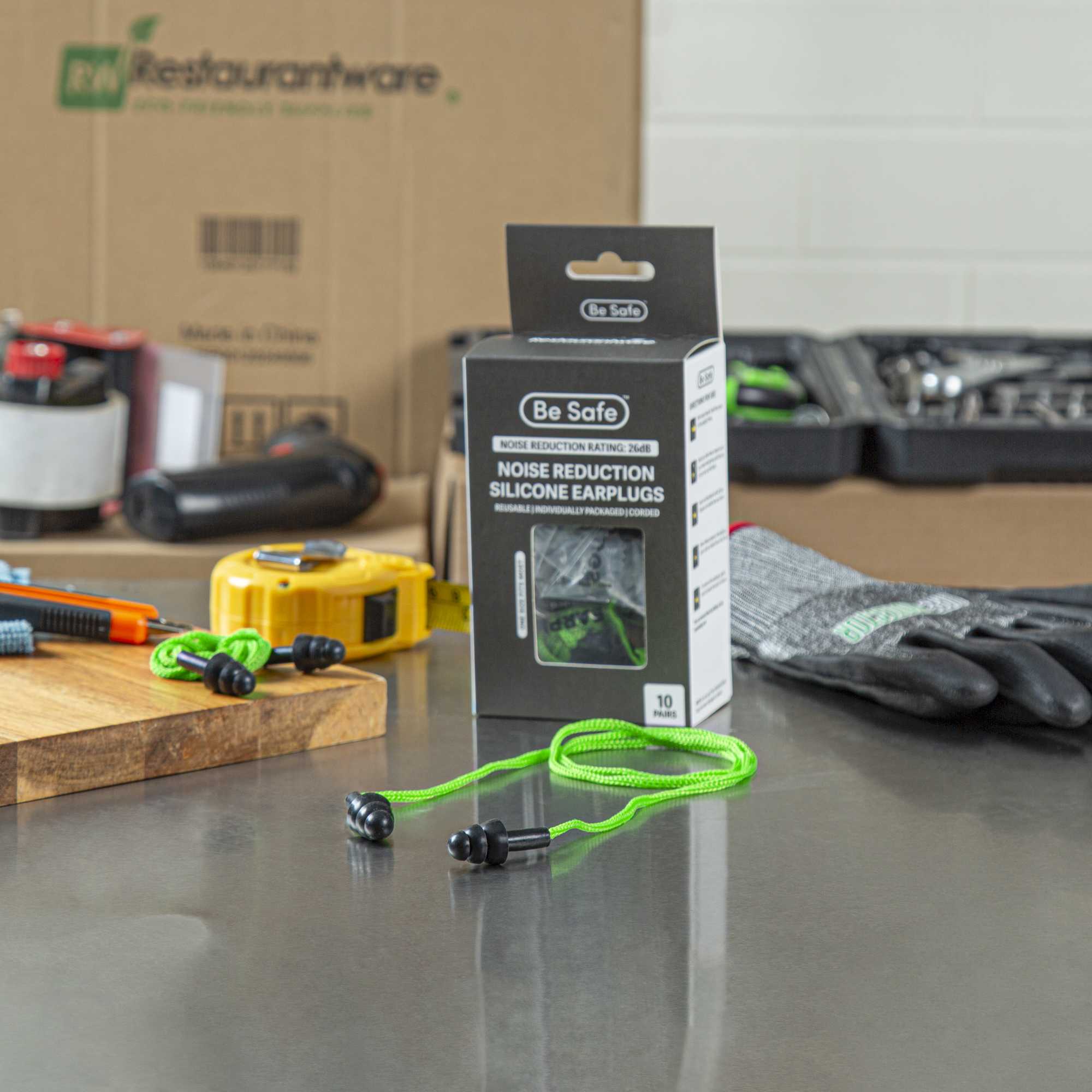 Ensure optimal kitchen efficiency with ANSI-rated noise reduction. The Be Safe Black and Green Silicone Corded Earplugs offer a precise design with their 2.76 inches length to effectively decrease ambient sound by 26dB, making them ideal noise reduction earplugs for any bustling kitchen environment. Crafted from pure silicone, these earplugs provide superior comfort and low pressure, while their humidity and sweat-resistant properties prevent moisture buildup, ensuring long-lasting wear. These shooting range ear protection earplugs feature a convenient nylon cord that keeps them secure and easily accessible during busy shifts. With their three-layered, Christmas tree design, they fit comfortably in most ear canals, offering premium protection for culinary professionals. Streamline your inventory management with 200 pairs per box.