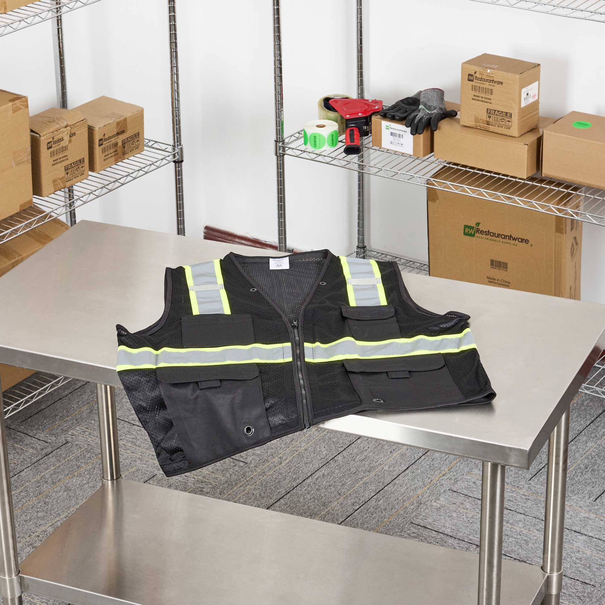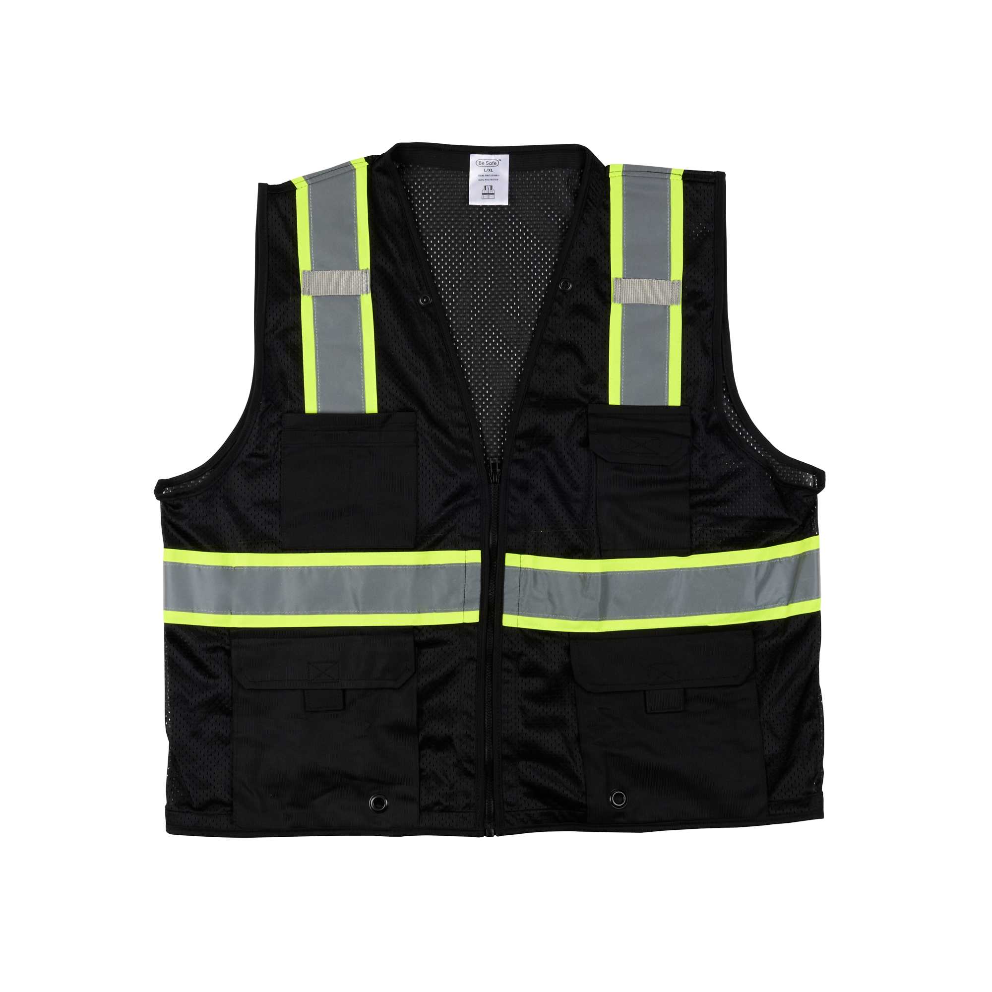 Ensure safety with our versatile zippered safety vest. The Be Safe Reflective Stripes hi-vis reflective vest in Black features high-visibility silver reflective stripes that enhance nighttime worker safety, making it ideal for warehouse and event staff. Its multiple-pocketed design efficiently organizes tools and notepads, streamlining operations for those needing a reliable mesh safety vest. The convenient zipper front closure allows quick on-and-off access, ensuring no time is wasted when transitioning between tasks. Plus, this vest is machine washable, offering easy maintenance for long-term use. Prioritize safety and efficiency with this essential addition to your safety gear collection. Constructed from durable plastic, this vest measures 27.99 inches in length and 27.56 inches in width, providing a comfortable fit without compromising mobility. Sold in a 1 count box.