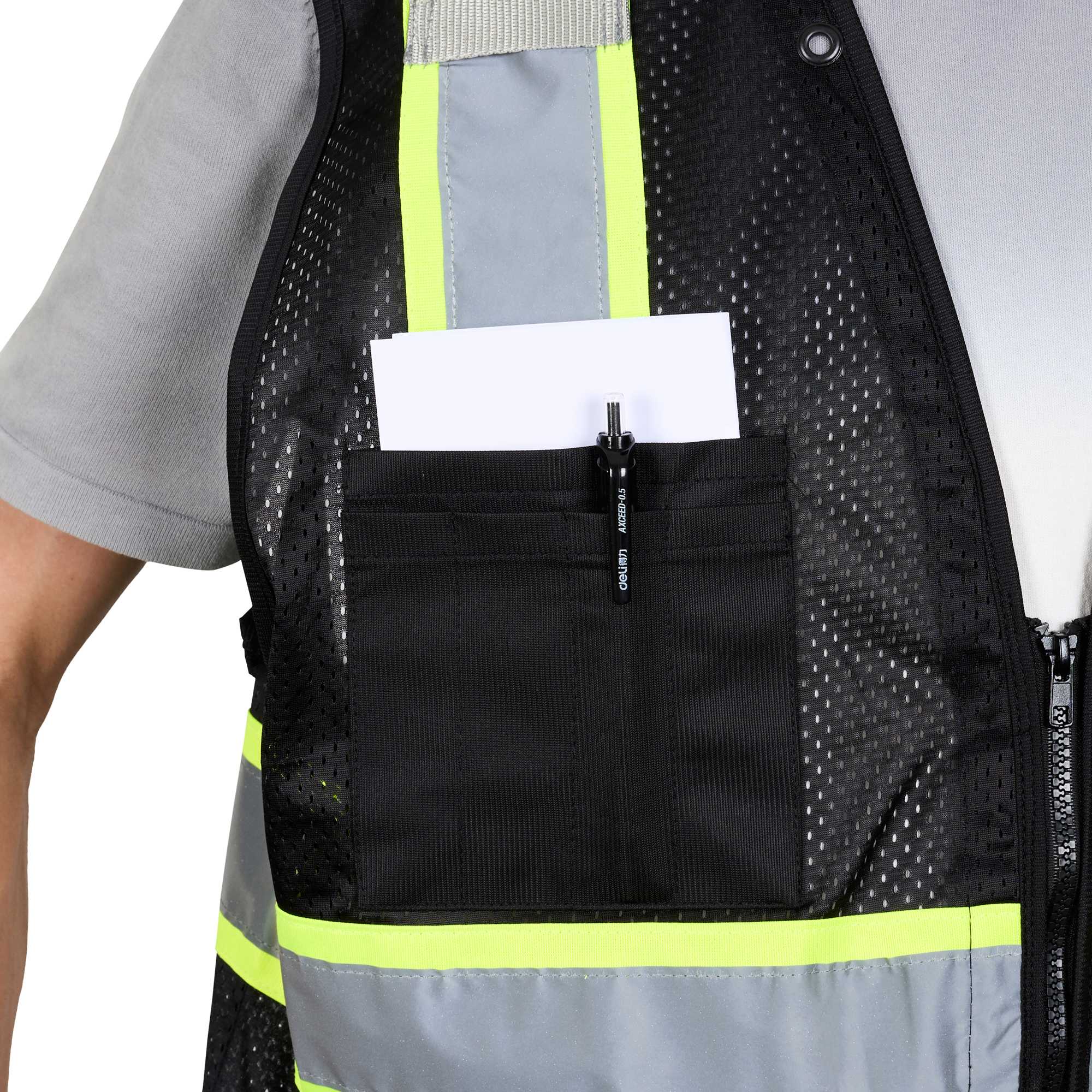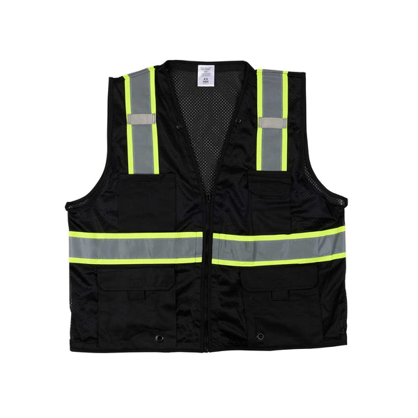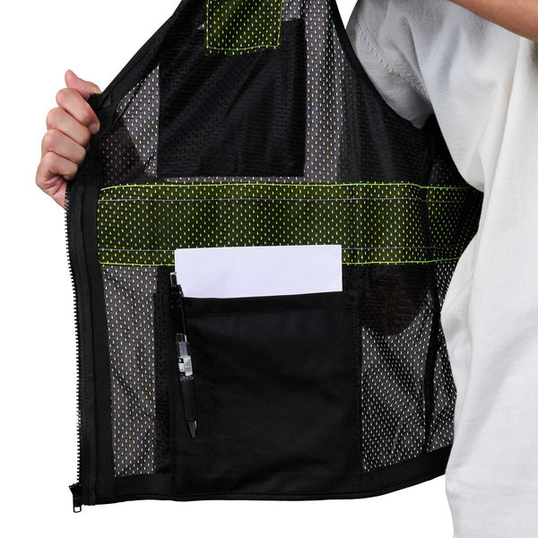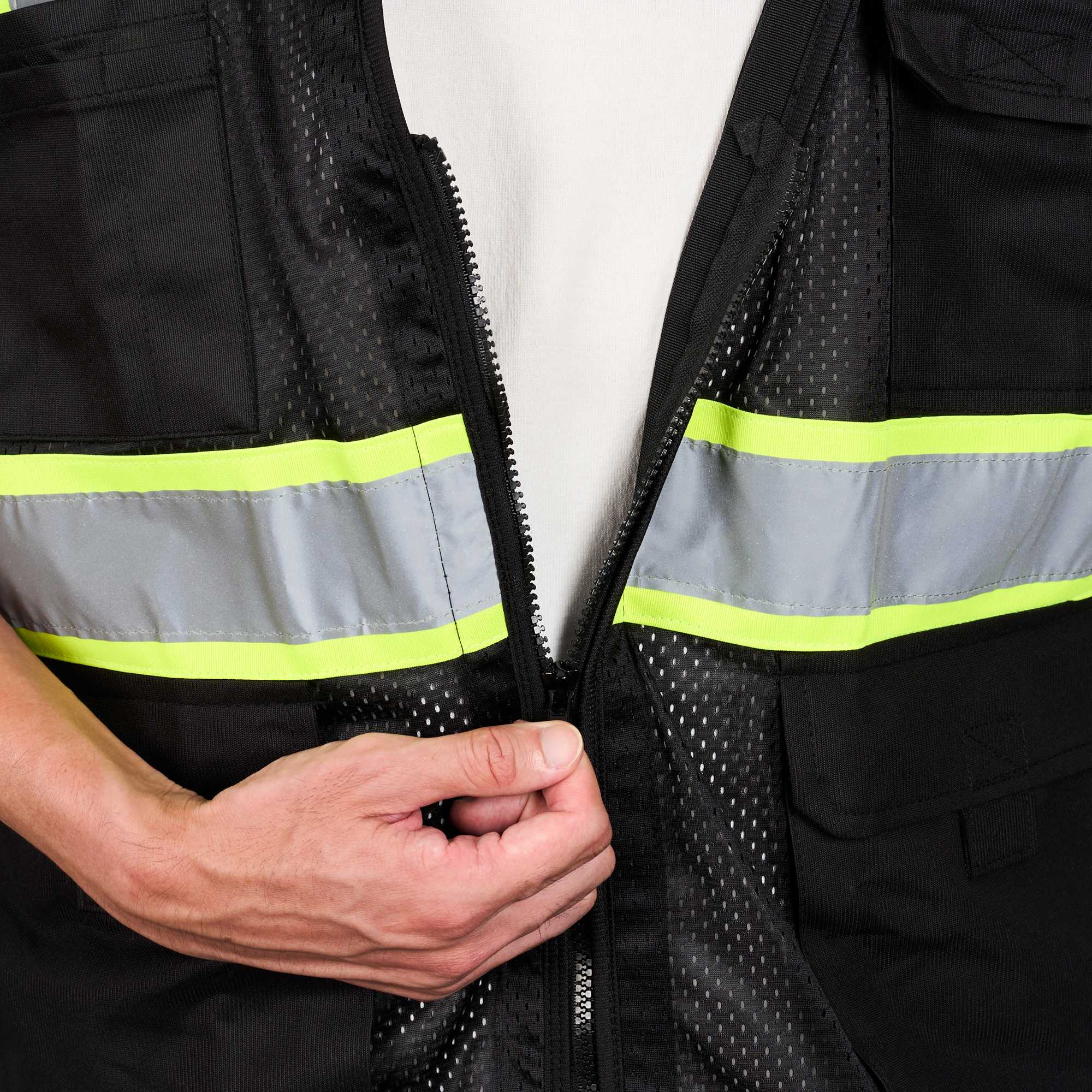 Enhance safety and visibility with our versatile mesh safety vest. The Be Safe Reflective Stripes reflective safety vest boasts silver reflective tapes that enhance visibility, ensuring optimal safety for event staff and warehouse workers. Designed with a zipper front closure, this reflective safety vest provides a secure and swift fit during busy operations. Equipped with multiple pockets, this safety vest with pockets efficiently organizes tools and accessories, streamlining workflow and accessibility. Made from black plastic, this vest is machine washable, providing easy maintenance for continuous use. Measuring 27.20 inches in length and 24.80 inches in width, this vest is both functional and comfortable for various environments. Sold in a 1 count box.