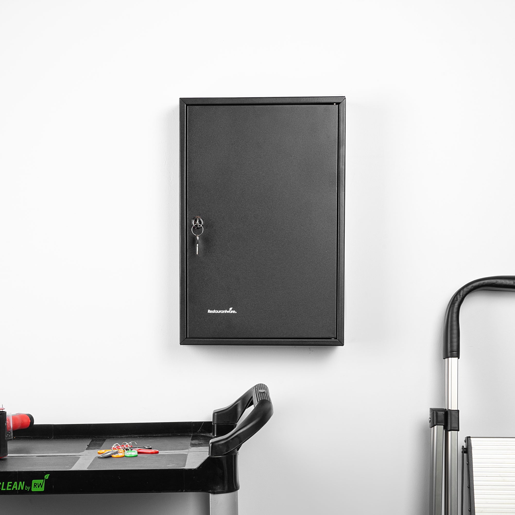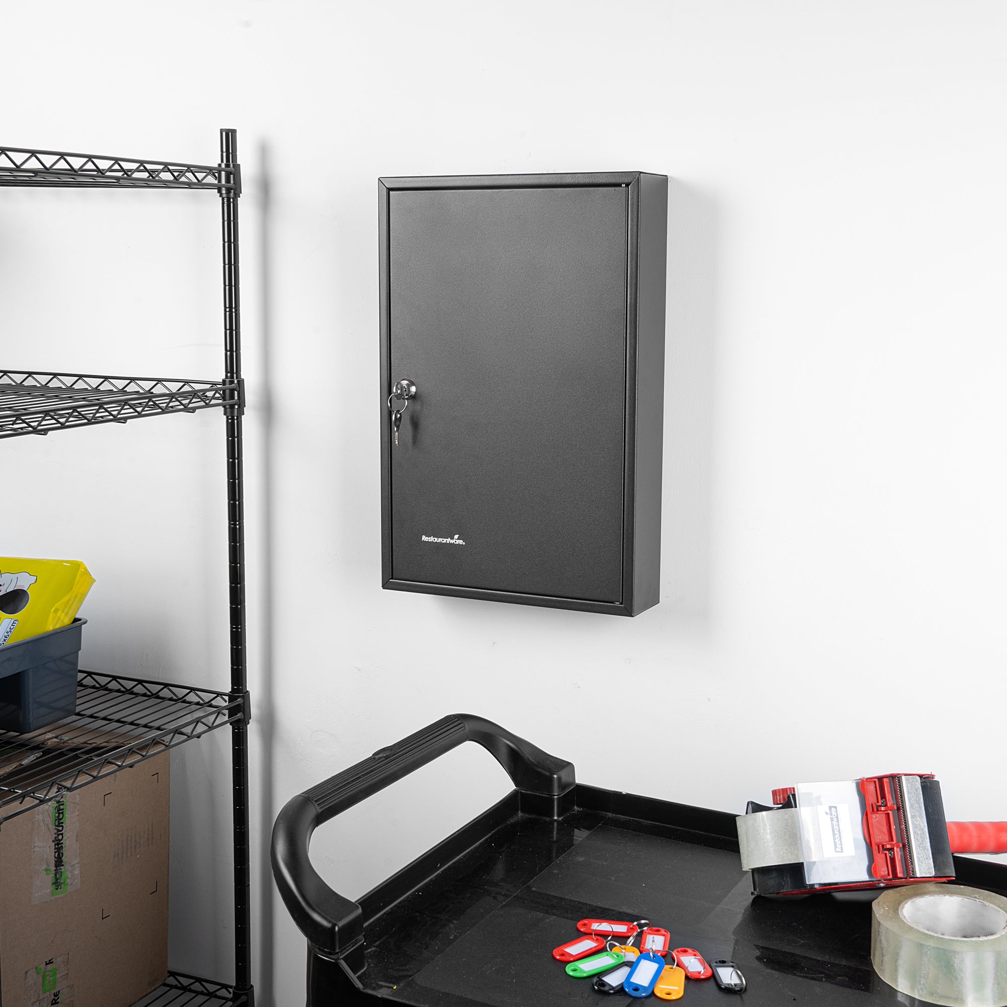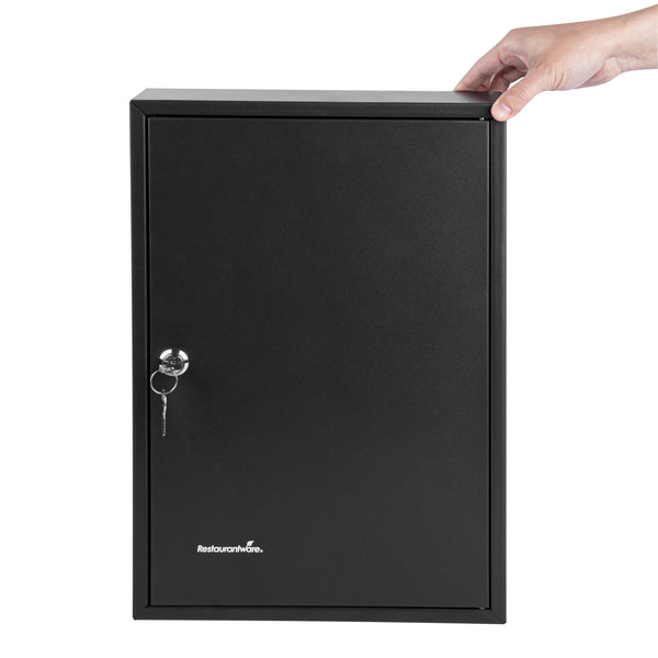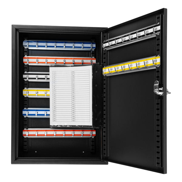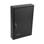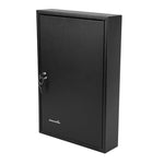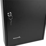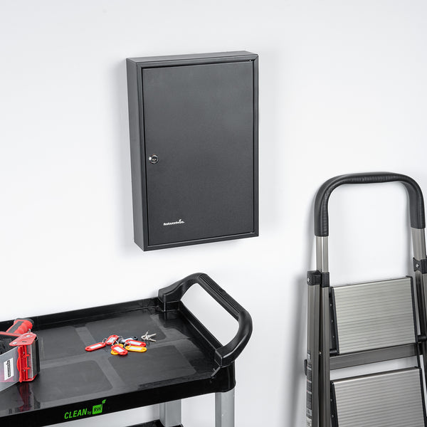 Secure key storage with our Be Safe Black Steel Wall Mount Key Cabinet Safe for streamlined organization in any setting. This steel key cabinet holds up to 64 keys, making it an ideal solution for offices, kitchens, or maintenance departments. Crafted from durable black steel, this wall mount key box offers long-lasting performance in high-traffic environments. Manage access effectively with the built-in key lock cabinet that ensures only authorized personnel can retrieve keys. Color-coded hooks and labels in this key organizer safe simplify identification and reduce retrieval time. Install this key cabinet wall mount easily with included hardware, creating a compact and efficient security station. Measuring 17.75 inches in length, 11.75 inches in width, and 3.15 inches in height, this black steel key cabinet saves space while boosting control. Sold in a 1 count box.