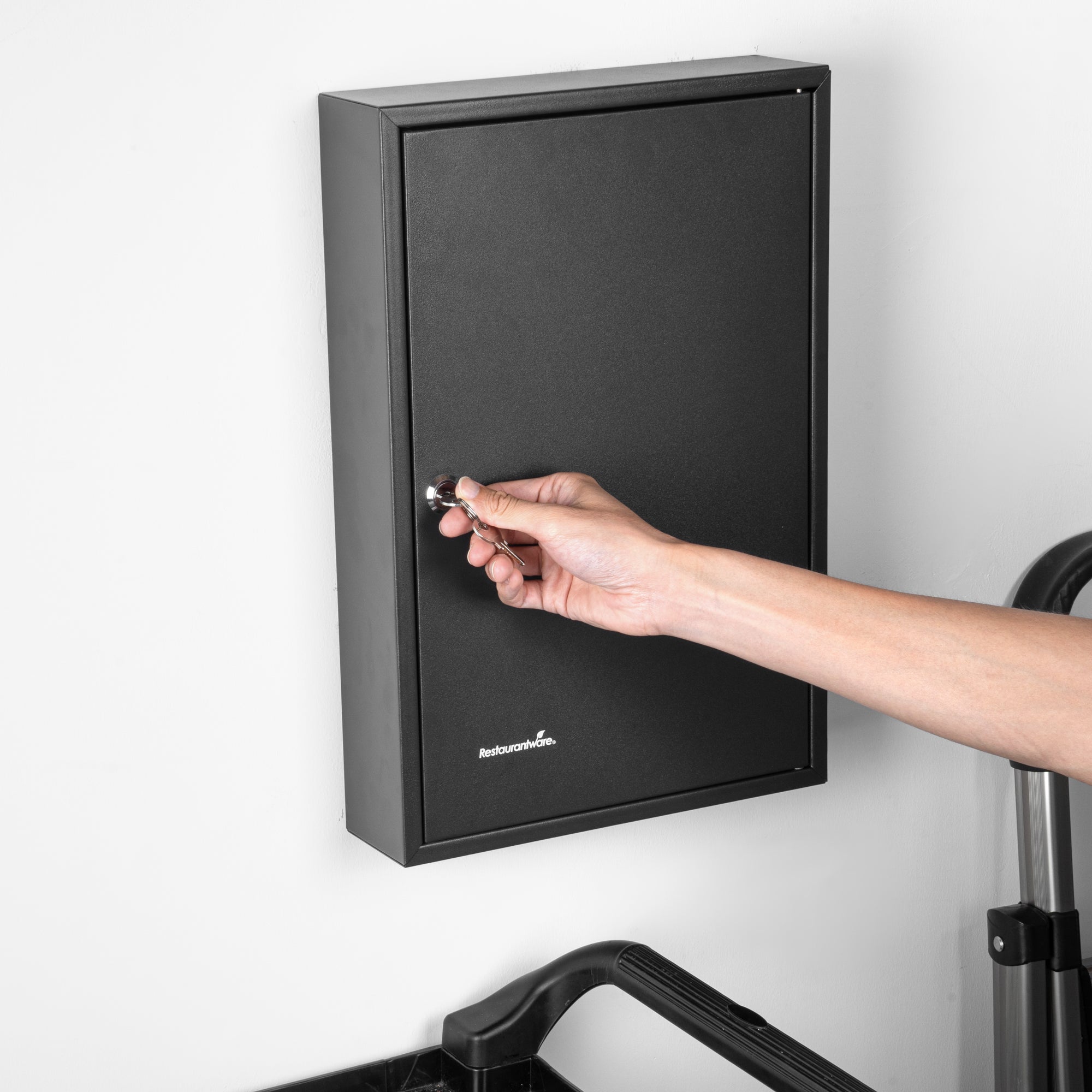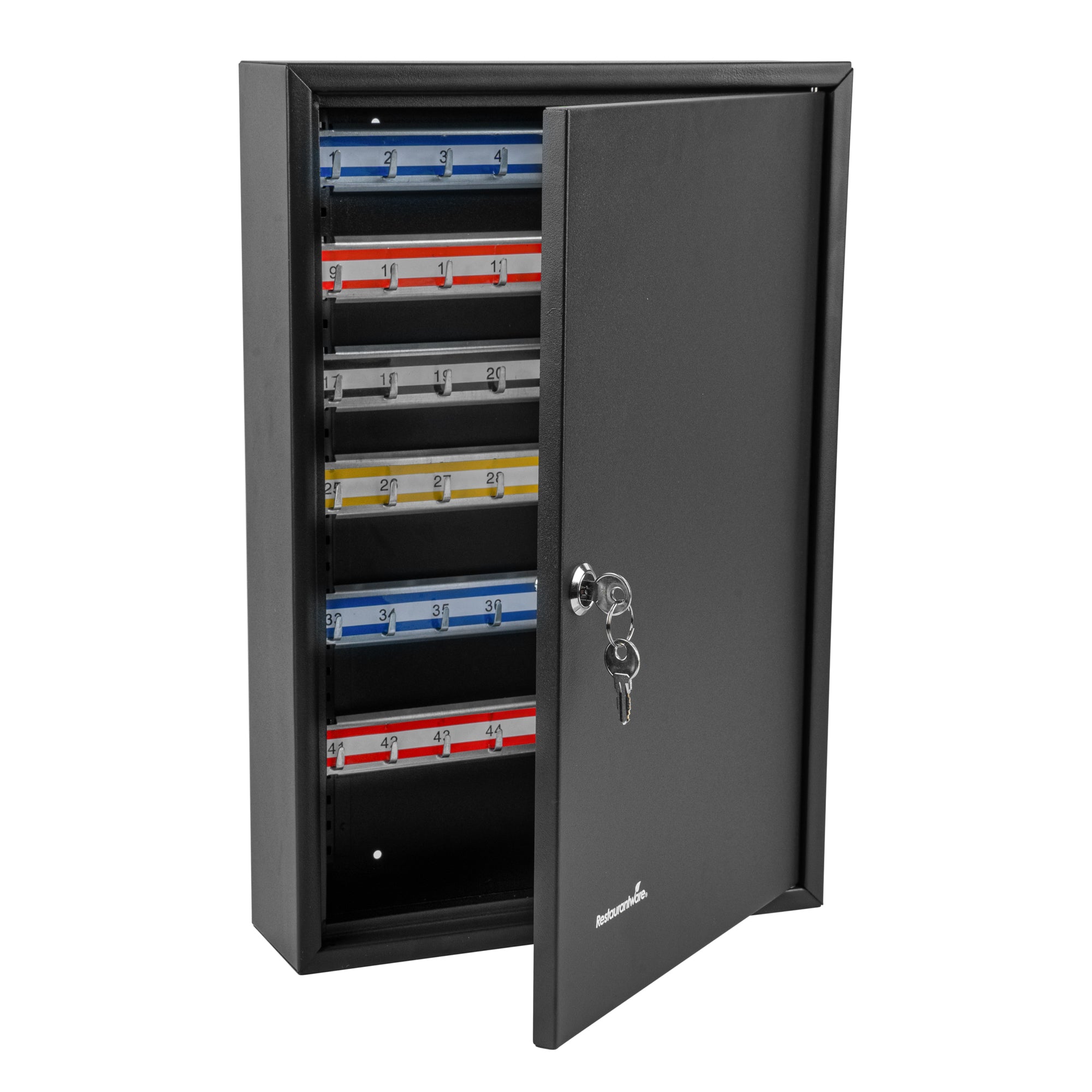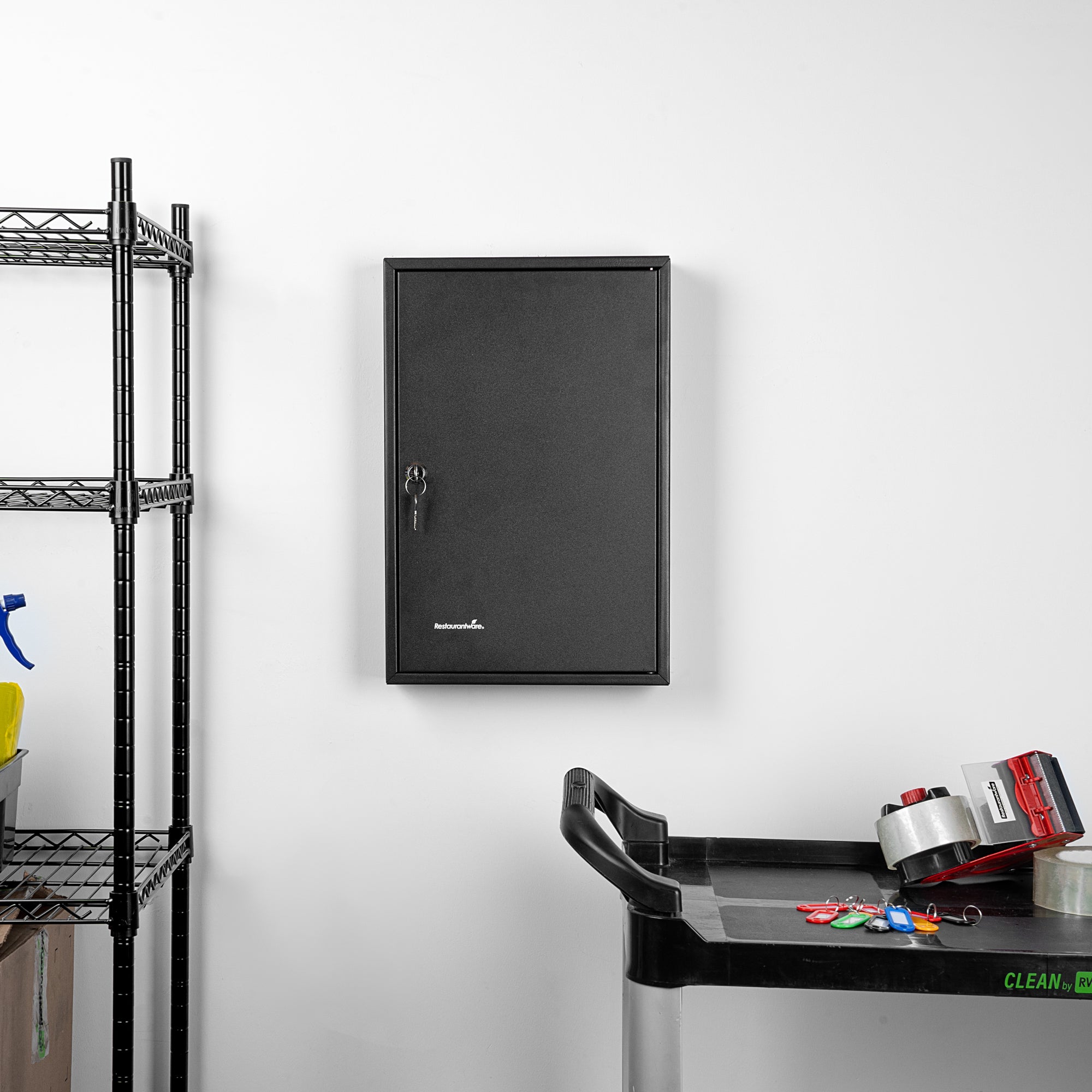 Secure key storage with our Be Safe Black Steel Wall Mount Key Cabinet Safe for streamlined organization in any setting. This steel key cabinet holds up to 64 keys, making it an ideal solution for offices, kitchens, or maintenance departments. Crafted from durable black steel, this wall mount key box offers long-lasting performance in high-traffic environments. Manage access effectively with the built-in key lock cabinet that ensures only authorized personnel can retrieve keys. Color-coded hooks and labels in this key organizer safe simplify identification and reduce retrieval time. Install this key cabinet wall mount easily with included hardware, creating a compact and efficient security station. Measuring 17.75 inches in length, 11.75 inches in width, and 3.15 inches in height, this black steel key cabinet saves space while boosting control. Sold in a 1 count box.