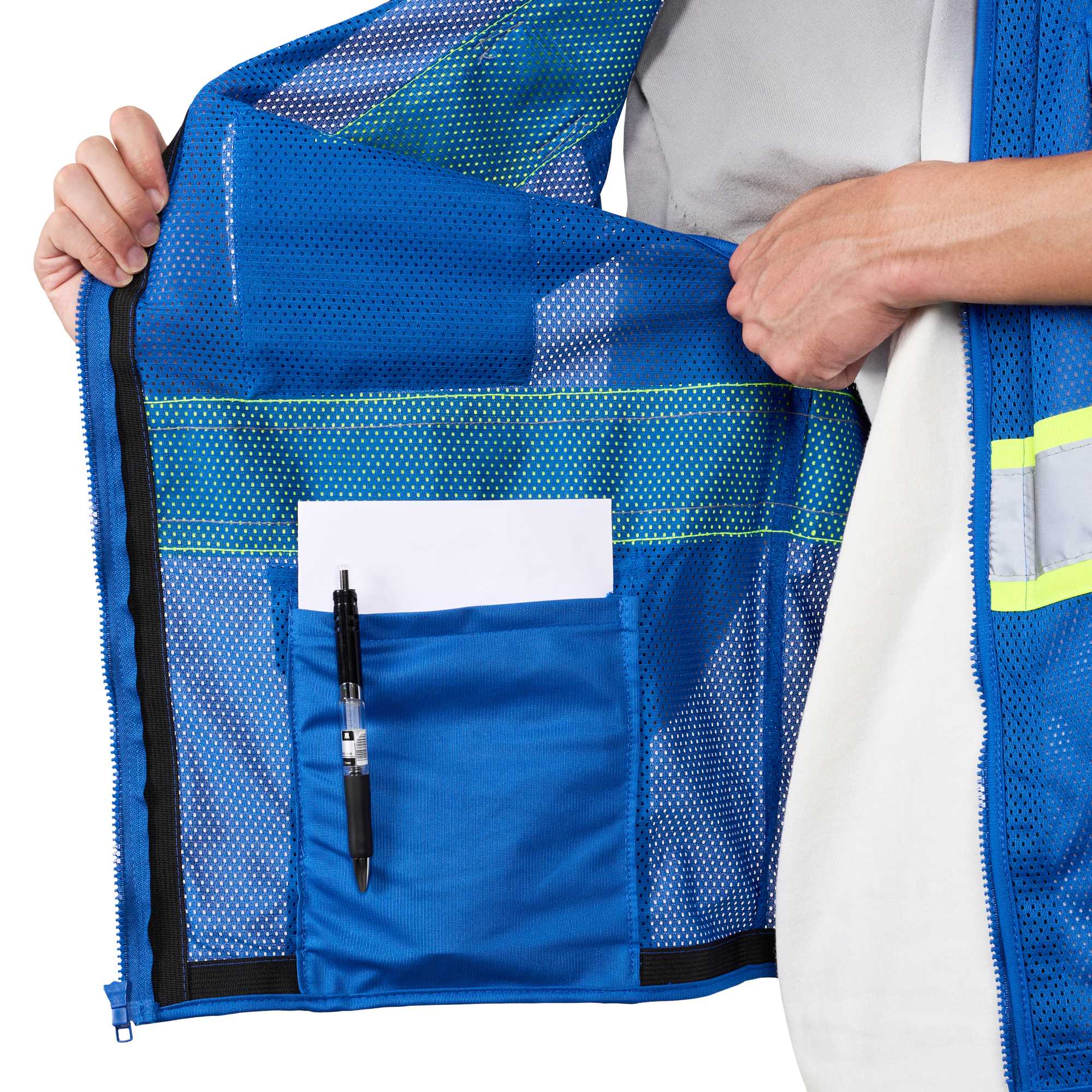 Enhance safety and efficiency with our versatile safety gear. The Be Safe Reflective Stripes High Visibility Vest features silver reflective tapes that significantly enhance visibility, ensuring safer environments in warehouse settings or for event staff requiring a high visibility vest. This reflective safety vest is equipped with multiple chest pockets that provide ample storage for tools and order pads, streamlining operations and maintaining organization. A zipper front closure allows for quick donning and removal, ideal for fast-paced environments and rush hours. Made from durable plastic, this polyester mesh safety vest is machine washable, promoting sustainability in your operations. With dimensions of 27.20 by 24.80 inches and a thickness of 0.20 inches, this vest combines comfort and functionality. Sold in a 20 count box.