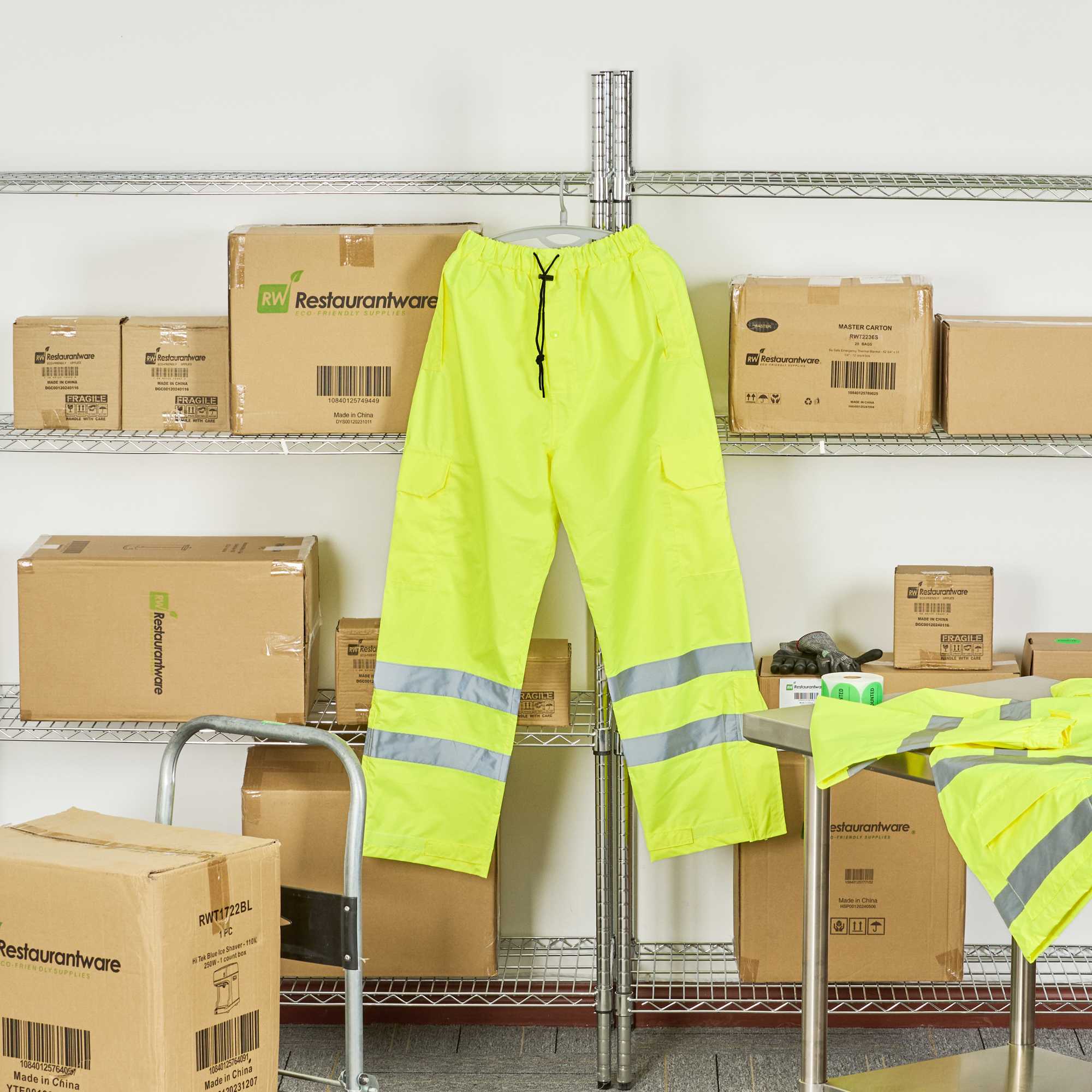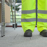 Enhance worker safety with high-visibility protective gear. The Be Safe Reflective Waterproof Work Pants in Lime, Plastic, Adjustable Fit, 29.02 inches x 12.79 inches x 0.39 inches are designed for optimal performance in high-risk environments, featuring hi-vis reflective tape that significantly boosts visibility in low light conditions. These waterproof work pants are crafted from durable plastic with stitched and taped seams, ensuring complete waterproof protection, making them indispensable for wet weather tasks. An adjustable drawcord waist delivers a secure, comfortable fit, while zippered leg openings facilitate quick on-the-go adjustments, perfect for busy workers needing reflective rain trousers. Additionally, these pants are machine washable, promoting easy maintenance and longevity. Invest in reliable safety gear with these recyclable pants. Sold in a 20 count box.