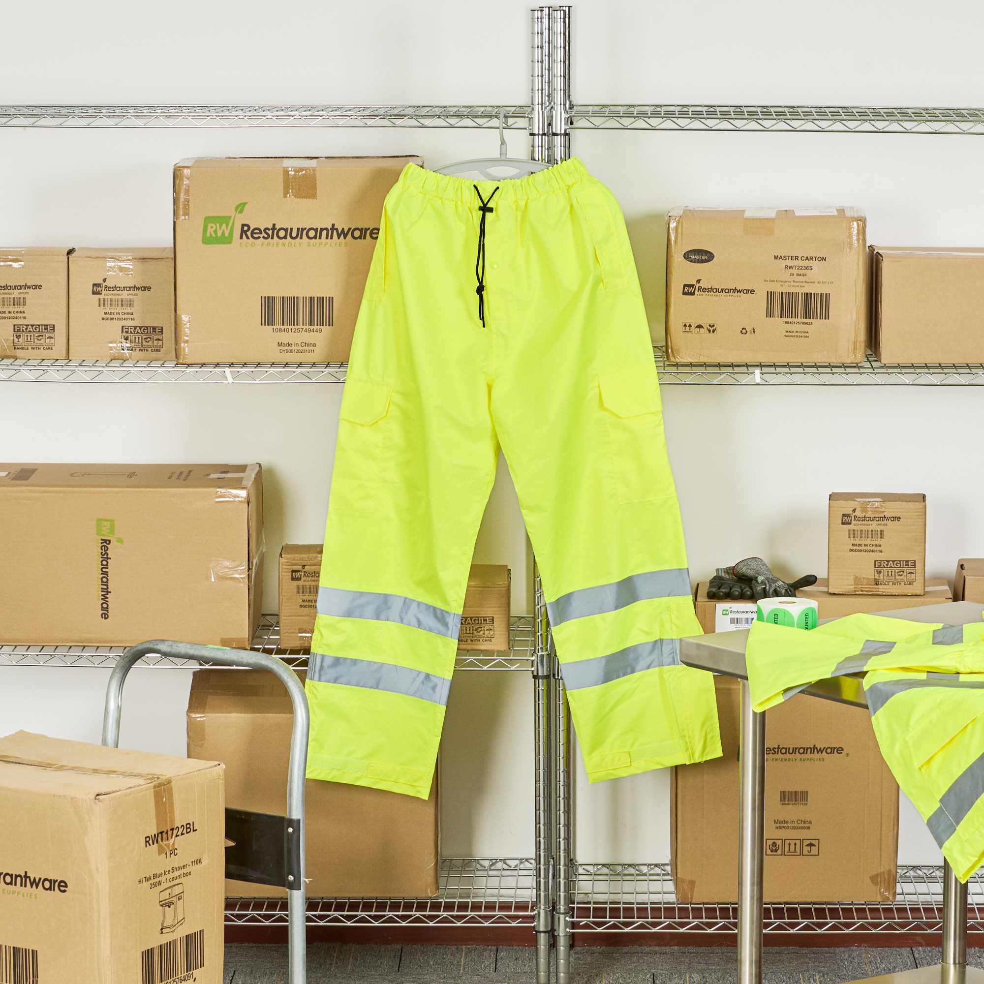 Enhance roadside safety with high visibility rain protection. The Be Safe Waterproof High Visibility Rain Pants offer unmatched visibility with hi-vis reflective tape that significantly enhances worker safety in high-risk environments. Designed with an adjustable waist, these reflective rain pants provide comfort during extended shifts, making them ideal for foodservice professionals who require dependable outdoor gear. Crafted from durable plastic, these waterproof rain pants feature stitched and taped seams, ensuring 100% waterproof protection against the elements, while zippered leg openings facilitate easy on/off over boots, accommodating busy schedules. With dimensions of 30.98 inches in length, 14.76 inches in width, these rain pants are machine washable, reflecting your commitment to sustainable practices. Sold in a 1 count box.
