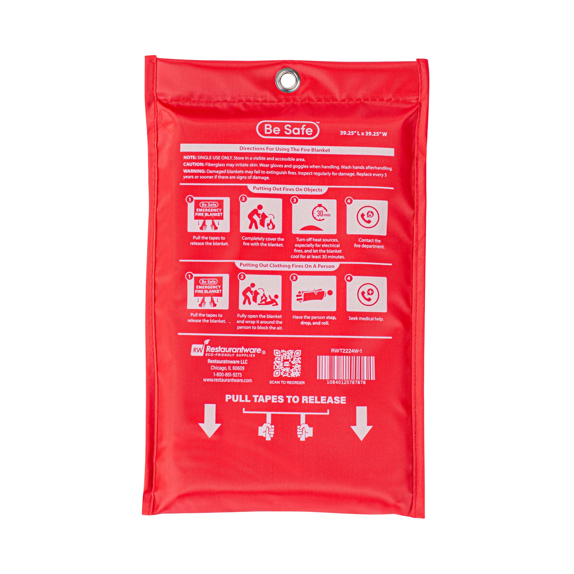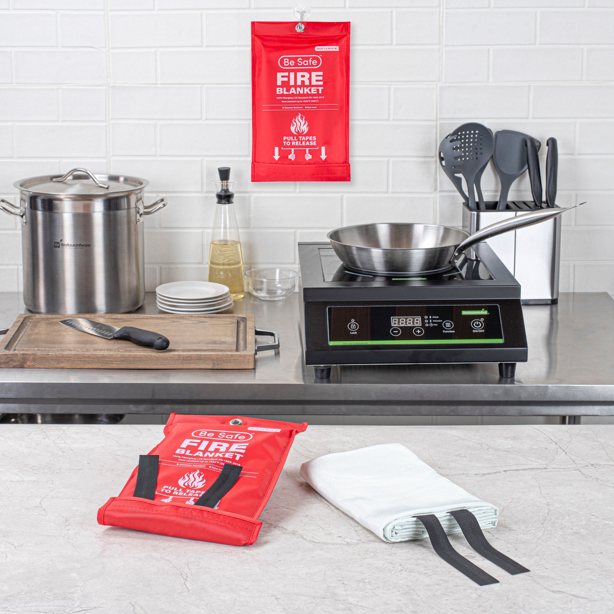 Ensure rapid response to small fires with this fire safety blanket. The Be Safe Flame-Retardant Fire Safety Blanket offers a compact size of 39.4 inches by 39.4 inches, providing convenient storage in kitchens for quick access during emergencies. This emergency fire blanket meets CE safety standards, delivering reliable fire protection for commercial kitchens and food trucks. Made from durable fiberglass, it withstands temperatures up to 1076 degrees Fahrenheit, ensuring kitchen safety without the mess of traditional extinguishers. The kitchen fire blanket is designed with a wall-mountable pouch, allowing staff to access it effortlessly in urgent situations. Lightweight and easy to handle, this blanket can be deployed by simply pulling down the tabs, making it an essential tool for any foodservice establishment. Equip your kitchen with this essential safety tool to enhance your fire safety measures today. Each order includes 20 Be Safe Flame-Retardant Fire Safety Blankets.