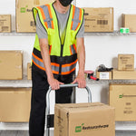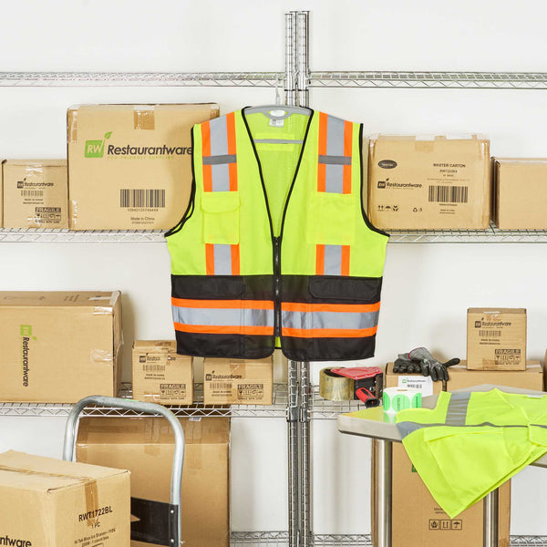 Ensure your staff remains visible and safe with our Be Safe Reflective Striping hi-vis safety vest. Crafted from durable plastic, this vest features a high-visibility lime color that enhances worker safety in bustling kitchens, ensuring they are easily seen. The reflective safety vest includes multiple pockets, perfect for organizing order forms and small tools, streamlining efficiency in fast-paced environments. Designed with a zipper closure vest style, it allows for quick and secure fit adjustments, keeping your team comfortable and focused on the task at hand. The vest's ample storage and contrasting reflective striping ensure day and night visibility, while the slot in the back accommodates a fall protection harness, adding an extra layer of safety. With dimensions of 29.21 inches in length, 30.32 inches in width, and 0.20 inches in height, this machine-washable vest is practical for daily use. Sold in a 1 count box.