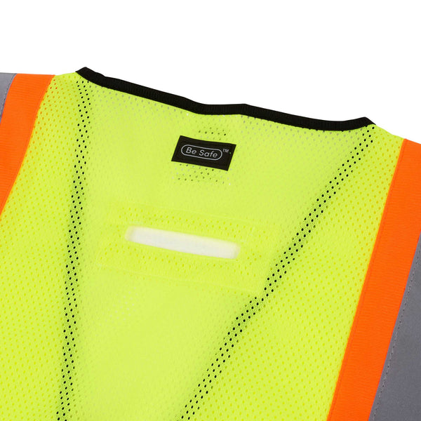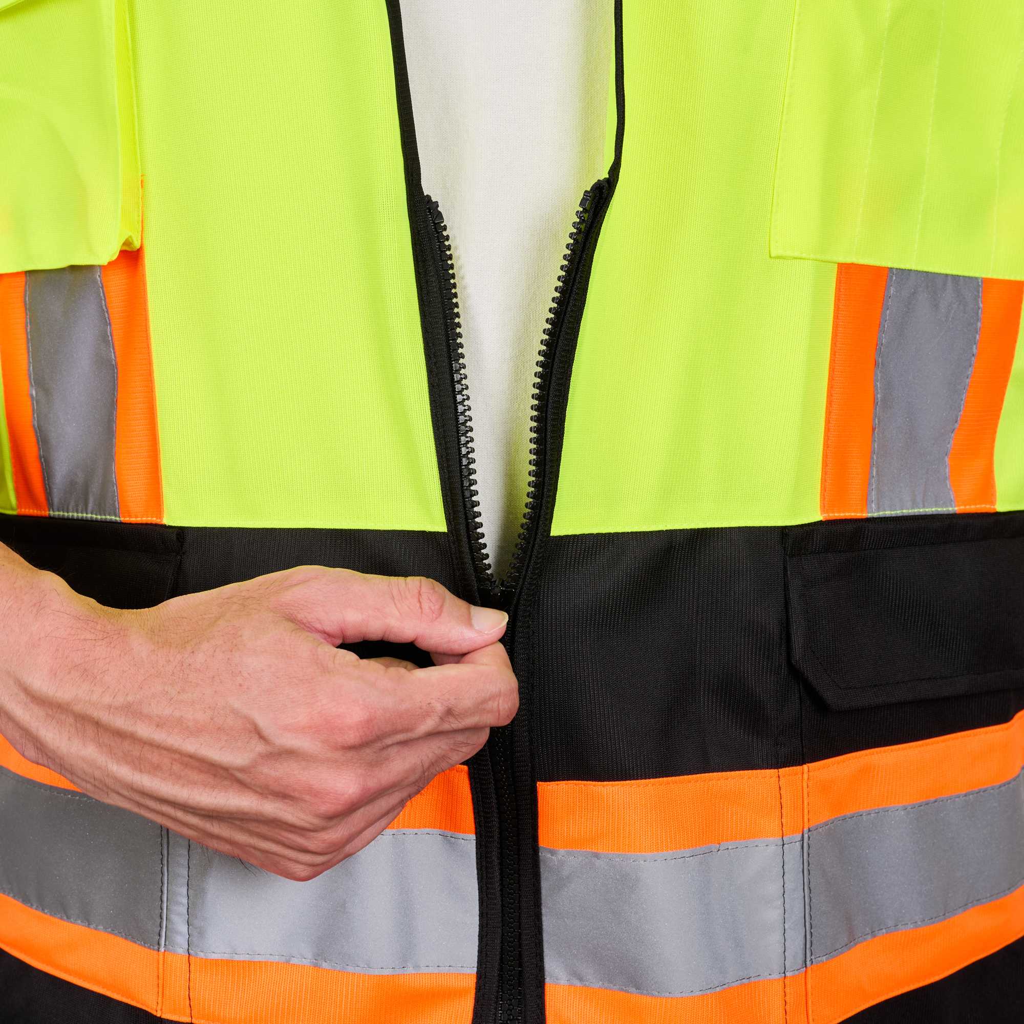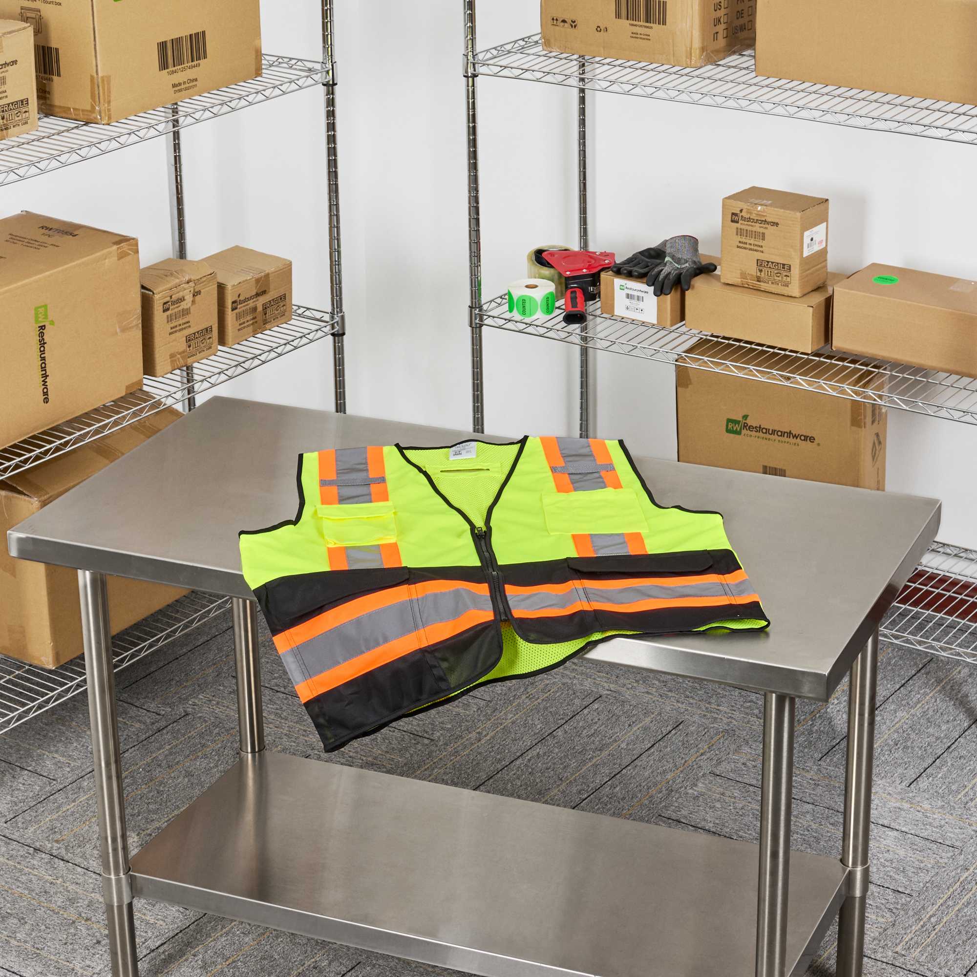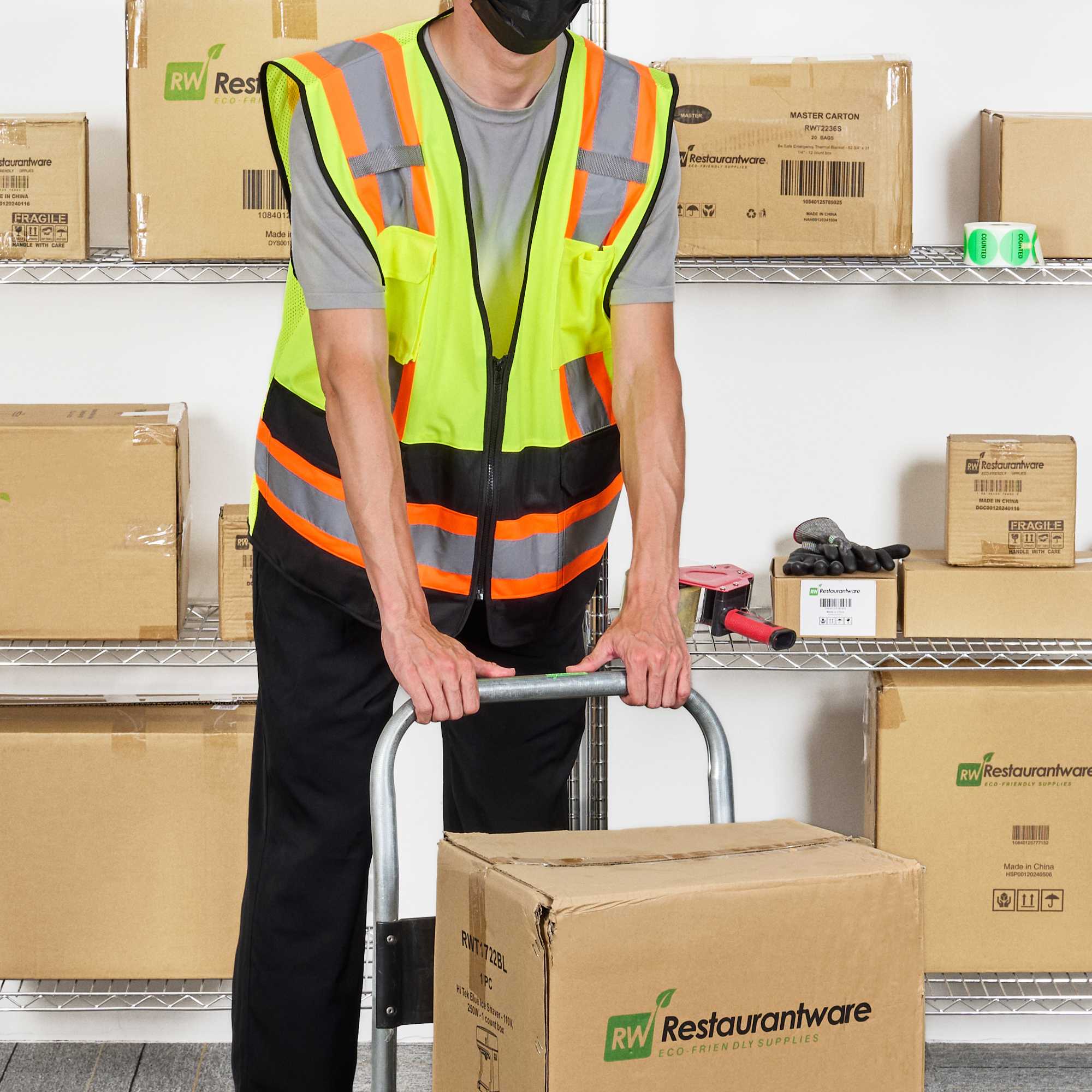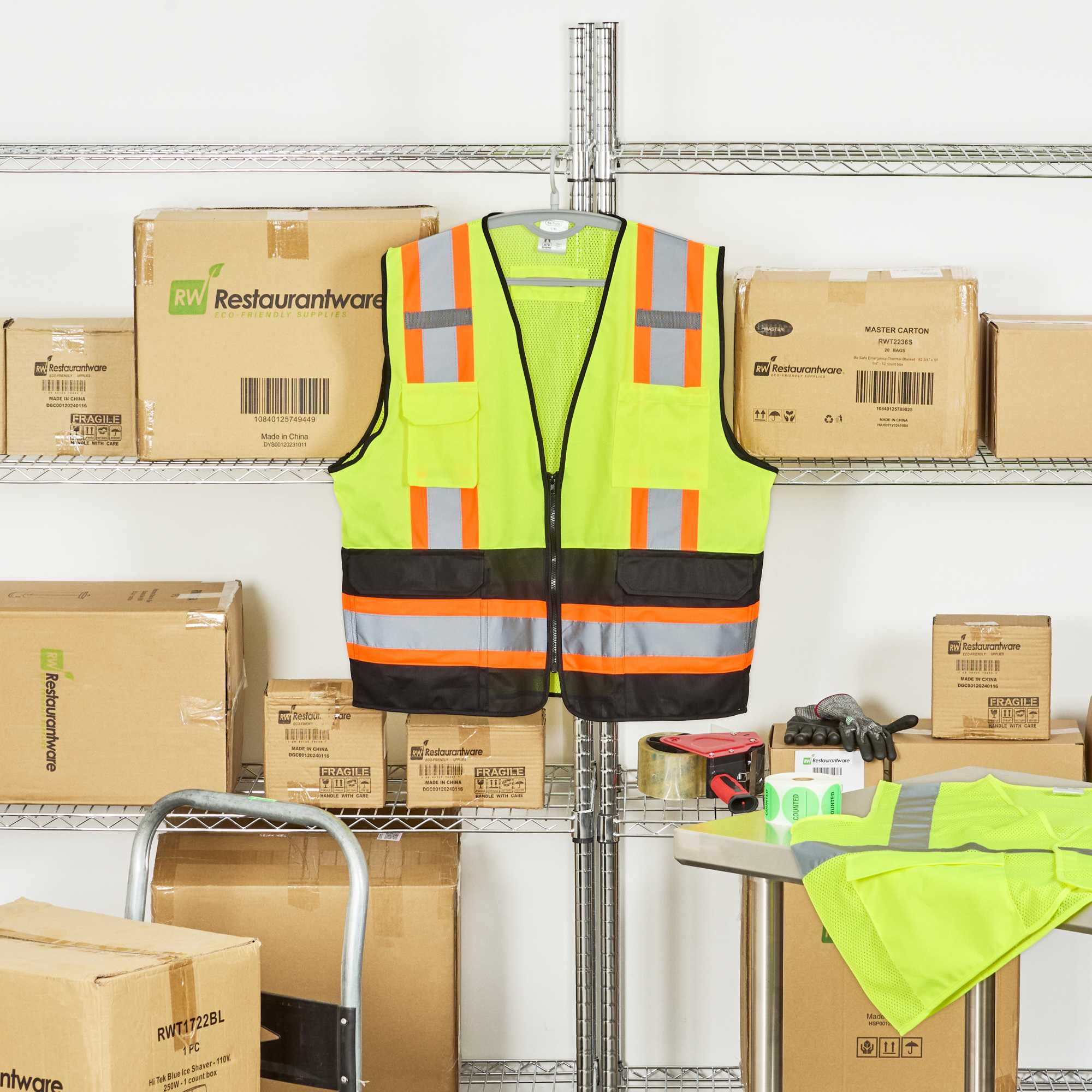 Ensure your staff remains visible and safe with our Be Safe Reflective Striping hi-vis safety vest. Crafted from durable plastic, this vest features a high-visibility lime color that enhances worker safety in bustling kitchens, ensuring they are easily seen. The reflective safety vest includes multiple pockets, perfect for organizing order forms and small tools, streamlining efficiency in fast-paced environments. Designed with a zipper closure vest style, it allows for quick and secure fit adjustments, keeping your team comfortable and focused on the task at hand. The vest's ample storage and contrasting reflective striping ensure day and night visibility, while the slot in the back accommodates a fall protection harness, adding an extra layer of safety. With dimensions of 29.21 inches in length, 30.32 inches in width, and 0.20 inches in height, this machine-washable vest is practical for daily use. Sold in a 20 count box.
