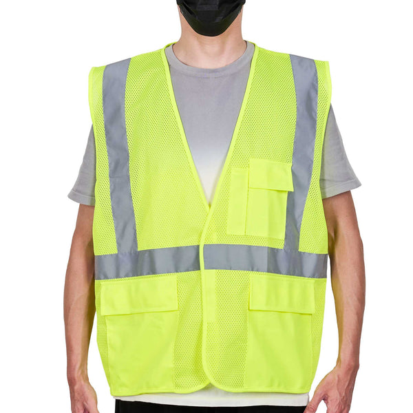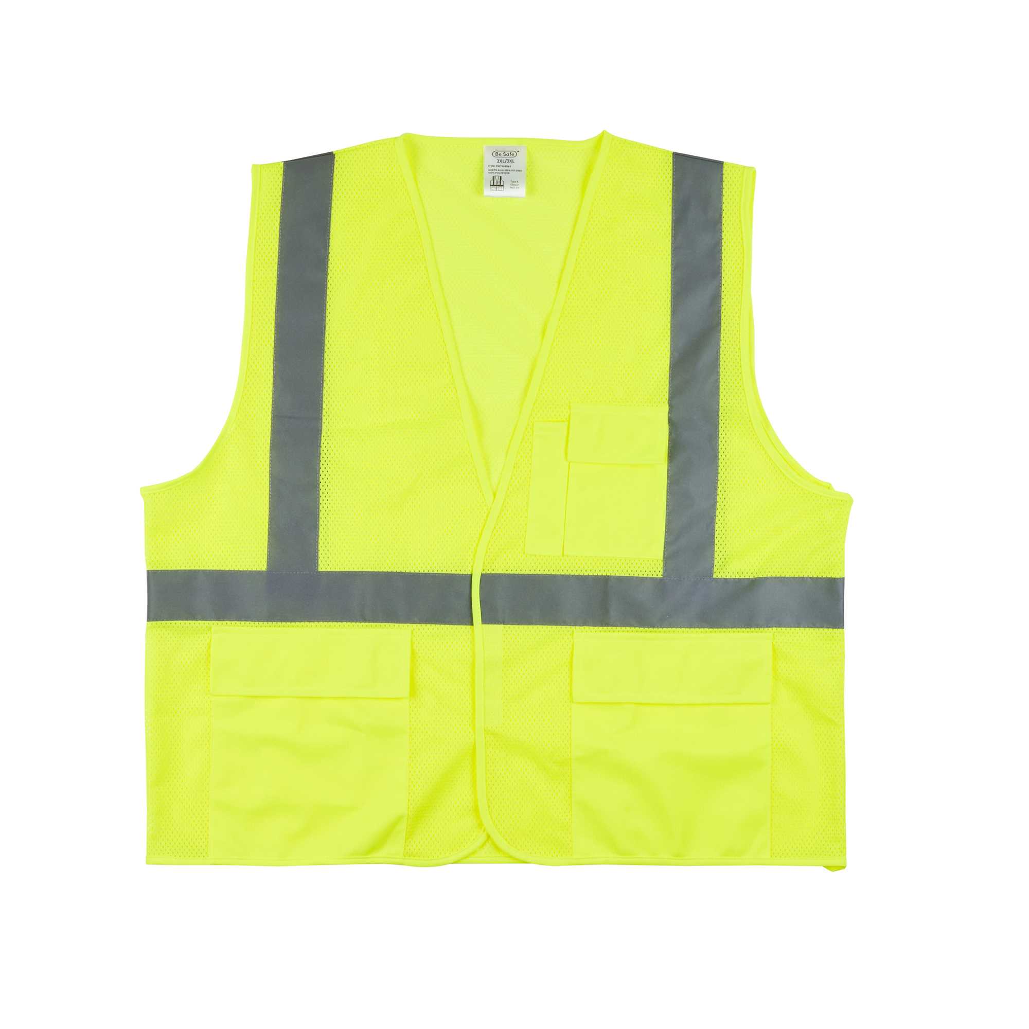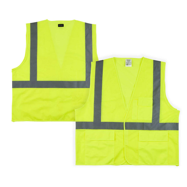 Optimize worker visibility with our Be Safe Type R Class 2 Lime 2XL/3XL High Visibility Mesh Safety Vests. Featuring a bright lime hue and reflective tape, these safety vests improve visibility in dim or hazardous jobsite conditions. Made from breathable polyester mesh, these vests keep wearers cool and comfortable during long work shifts. Outfitted with a hook-and-loop closure, these vests allow for quick, secure wear and removal to minimize downtime. Multiple front pockets make tool and notepad access easy, supporting on-the-go productivity. Machine washable and recyclable, these hi-vis vests offer both durability and eco-consciousness. Measuring 29.2 inches in length by 30.3 inches in width, these safety vests provide a relaxed fit for larger body types without sacrificing mobility. Sold in a 20 count box.