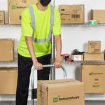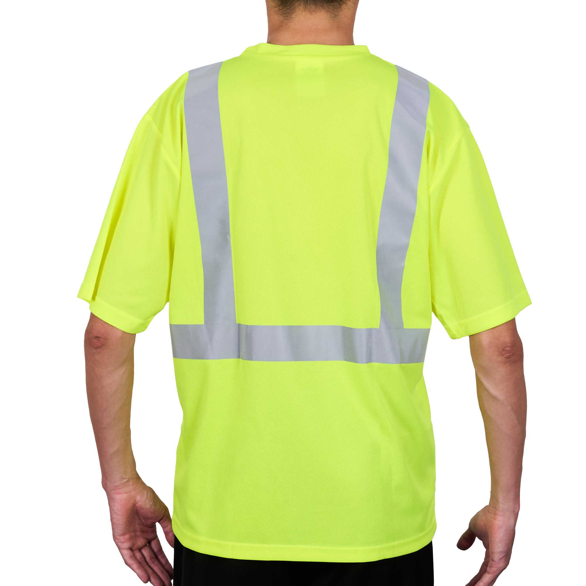 Enhance safety and visibility in bustling environments. The Be Safe Reflective Striping hi vis t-shirt offers a hi-vis lime color, maximizing worker visibility in busy kitchens and work zones. Constructed from moisture-wicking plastic, this reflective work shirt ensures comfort during long shifts, while its silver reflective stripes meet government Class 2 safety standards, providing enhanced safety during night operations. Measuring 33.27 inches in length and 30.08 inches in width, this class 2 safety t-shirt includes a convenient chest pocket for quick access to order pads or small tools, essential for efficient service. Machine washable, it supports sustainable practices and easy maintenance, making it ideal for high-turnover environments. Each order includes 20 vests.
