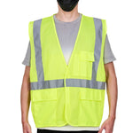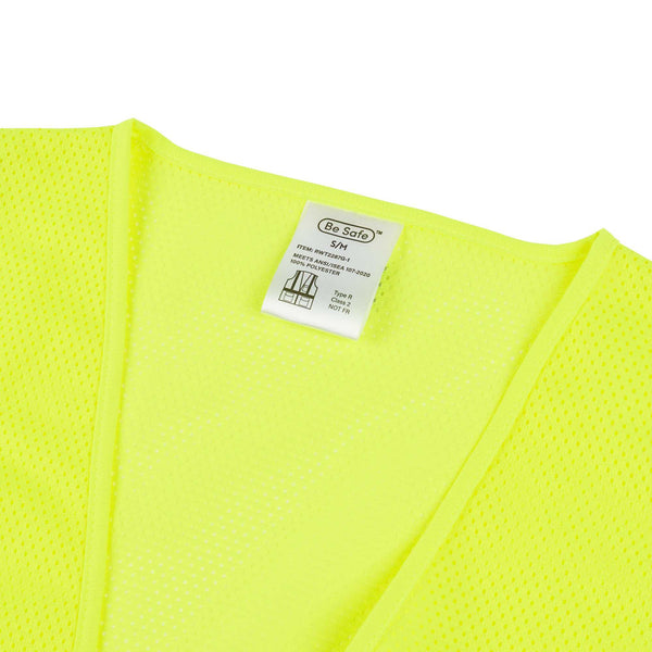 Enhance jobsite visibility with our Be Safe Type R Class 2 Lime S/M High Visibility Mesh Safety Vest. Designed in a vibrant lime color, this mesh safety vest features reflective tape that boosts visibility in low-light and high-risk environments. Built with breathable polyester mesh, this high-visibility vest ensures optimal airflow, keeping workers cool throughout extended shifts. Outfitted with a hook-and-loop closure, this reflective vest offers a quick and secure fit, minimizing delays during busy transitions. Multiple built-in pockets provide convenient access to tools, notepads, or small essentials. Made from machine-washable plastic, this construction vest is also recyclable to support sustainable work practices. Measuring 27.2 inches in length by 24.8 inches in width, this hi-vis vest meets the needs of commercial and industrial safety applications. Sold in a 20 count box.