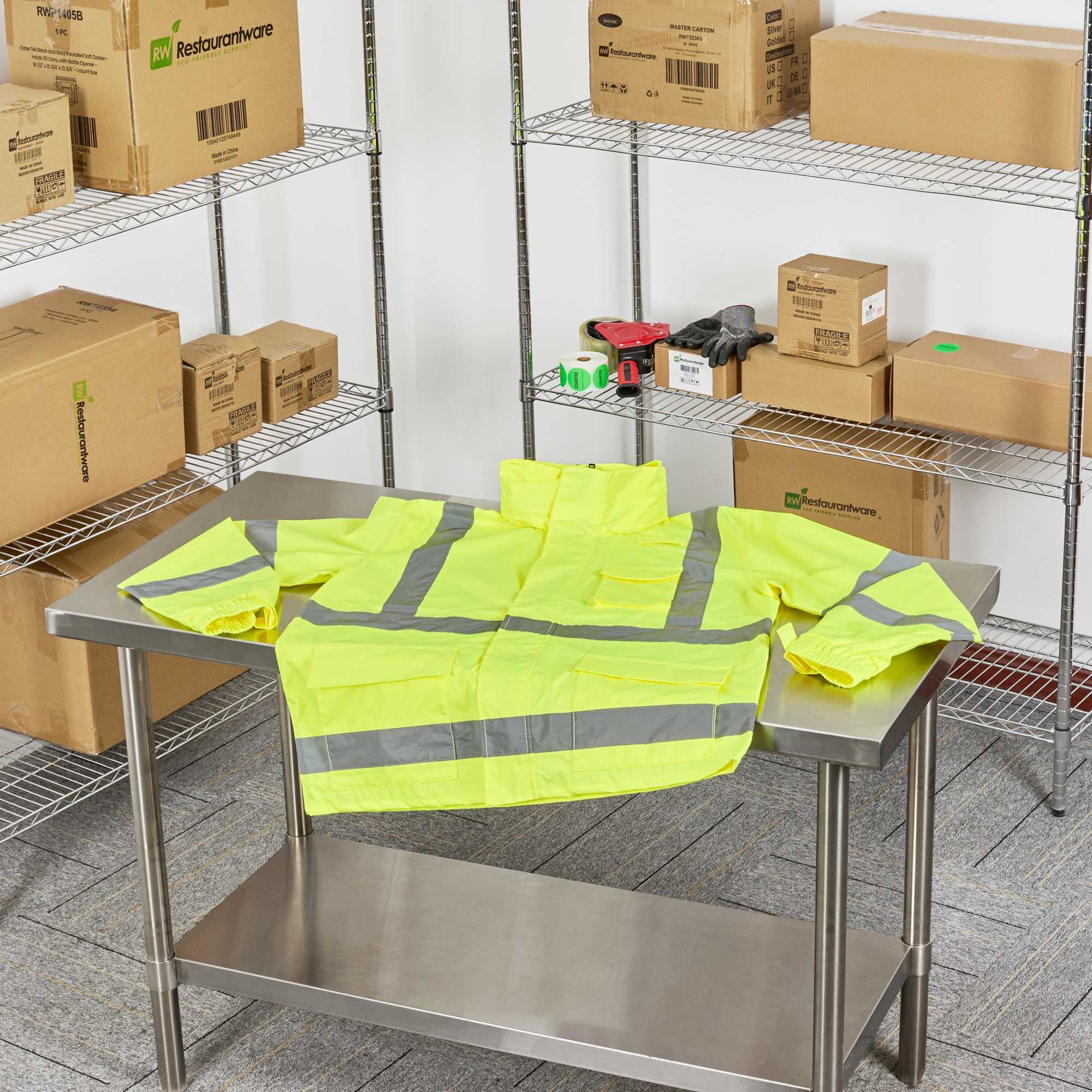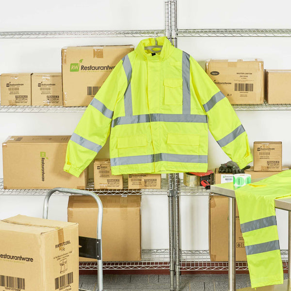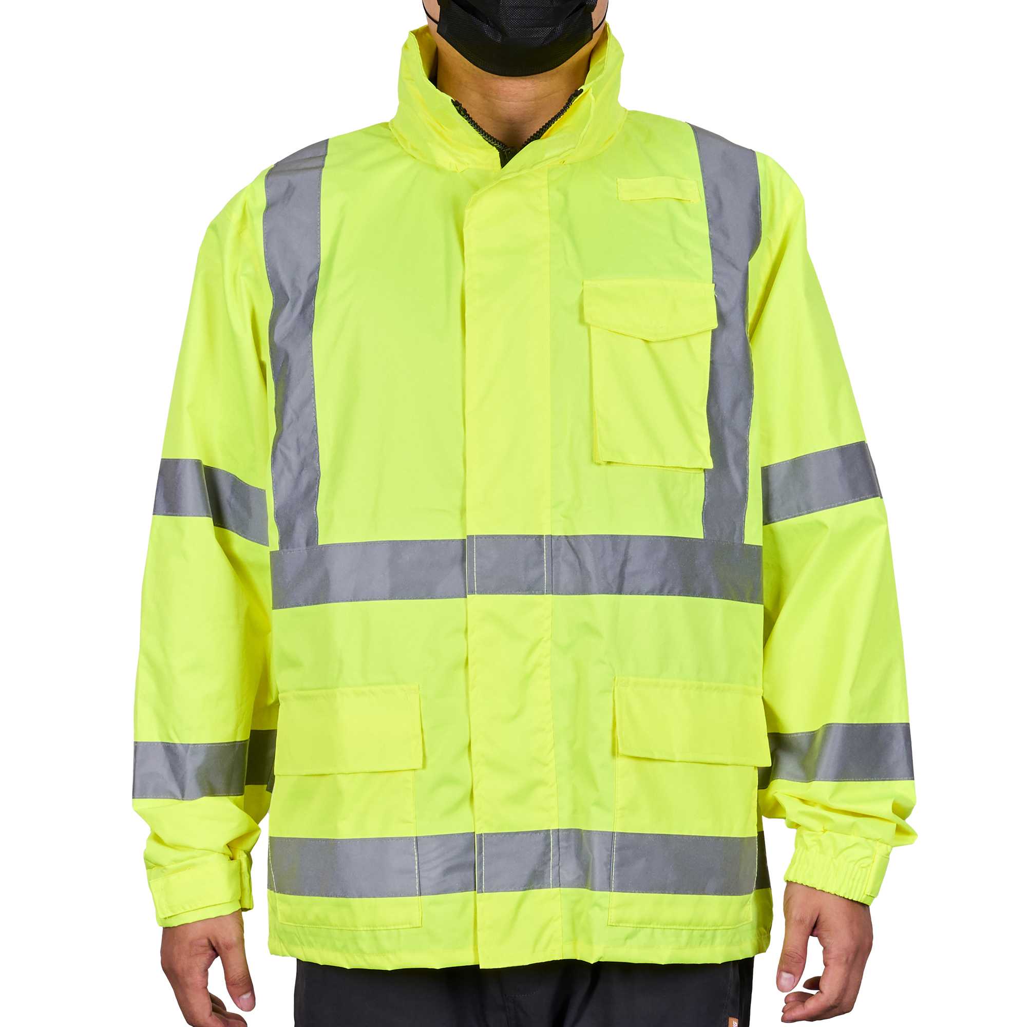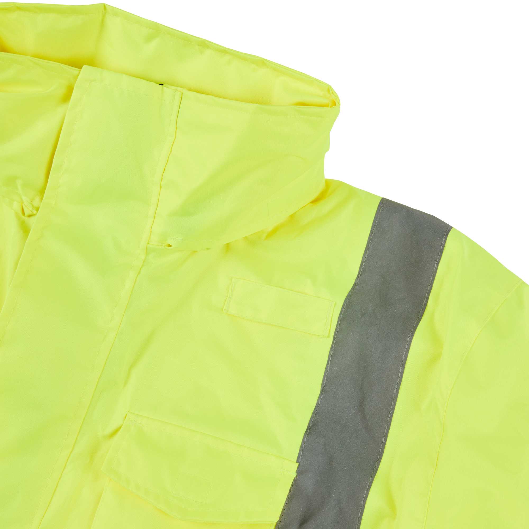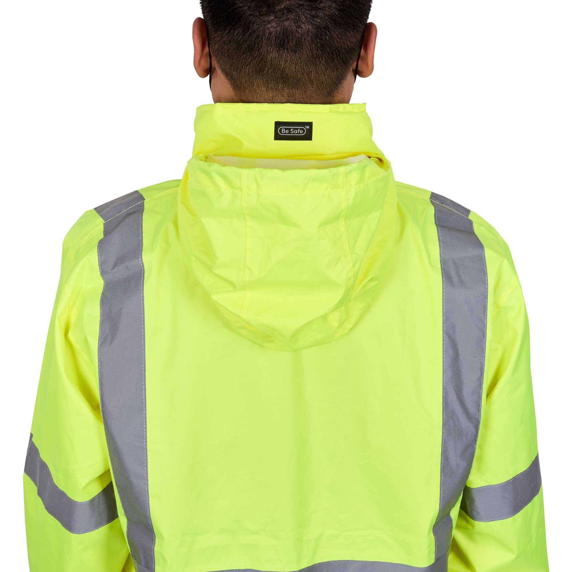 Enhance worker safety and visibility in challenging conditions. The Be Safe Reflective Rain Jacket's hi-vis reflective tape significantly improves worker safety in low-light environments, making it indispensable for high-risk settings. With its Class 3 reflective properties, this high visibility rain coat is crafted from recyclable plastic, offering breathable, hi-vis protection ideal for summer days. Featuring a detachable hoodie, it provides customizable weather protection, ensuring comfort and adaptability in various conditions. The 100% waterproof design, complete with stitched and taped seams, guarantees dry and secure wear, while the zipper front closure ensures quick and secure fastening. Measuring 30.98 inches in length and 25.98 inches in width, this waterproof safety jacket is machine washable, facilitating easy maintenance and longevity. Sold in a 1 count box.