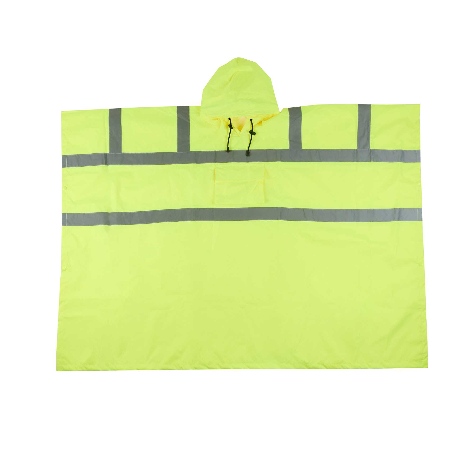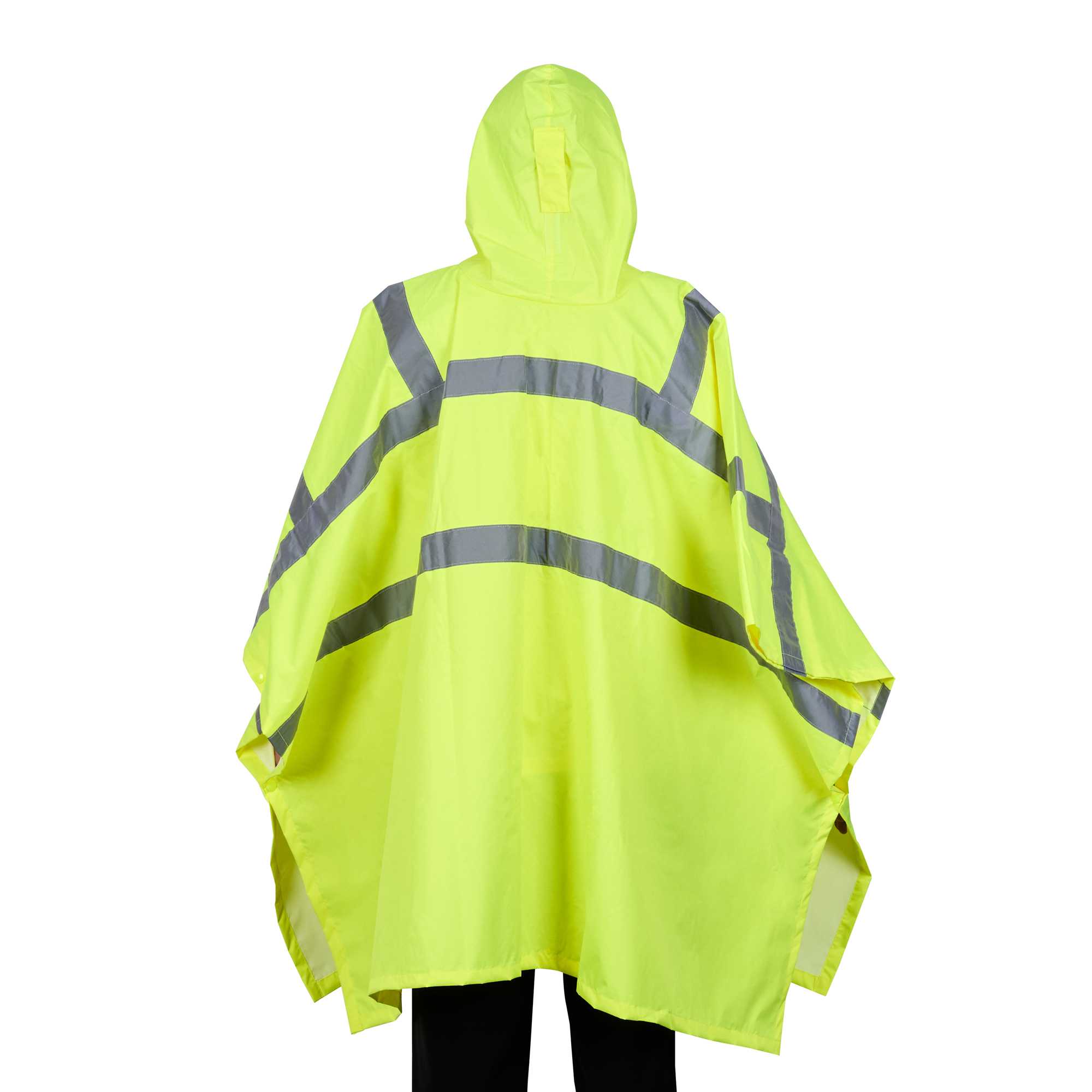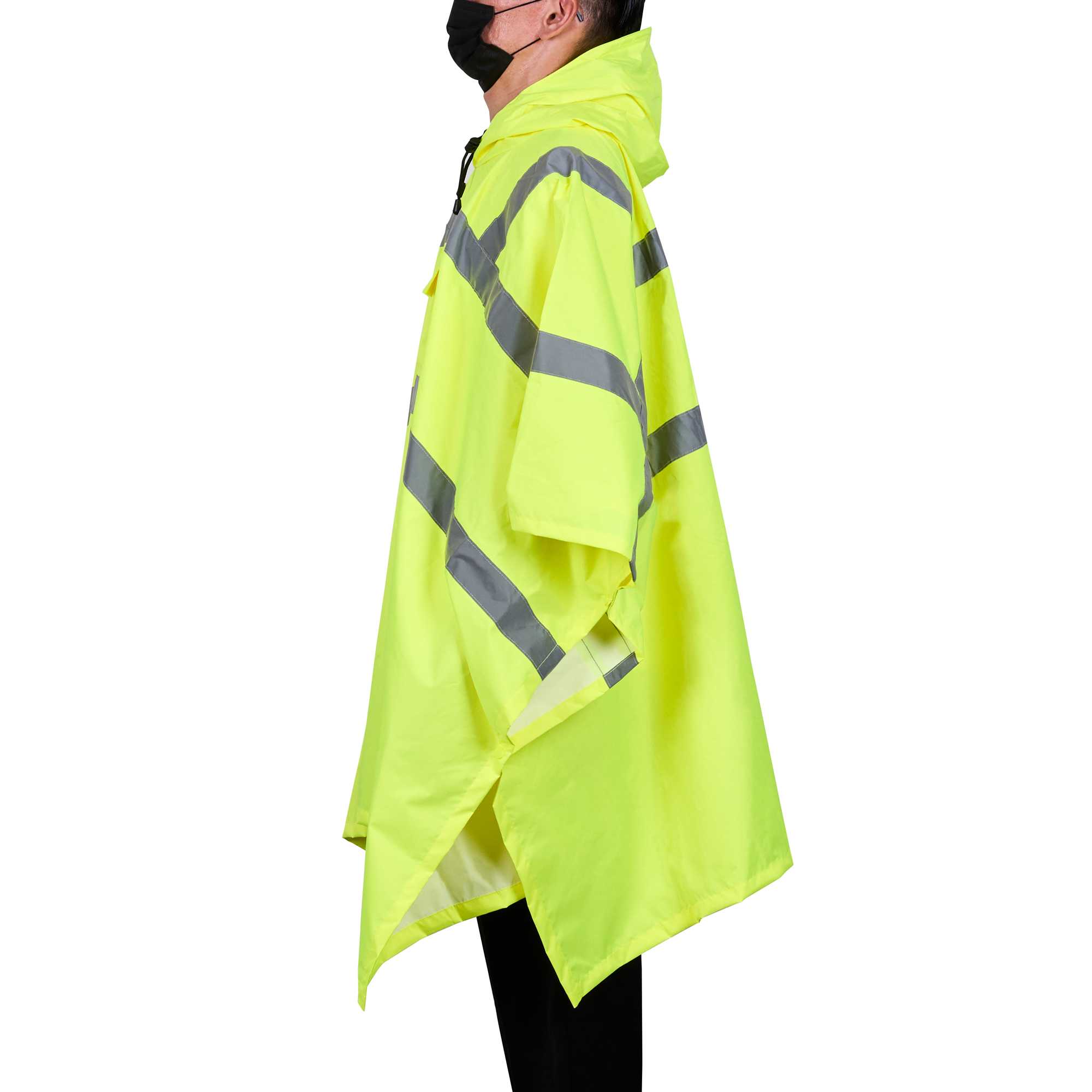 Enhance safety and visibility with this protective gear. The Be Safe Waterproof Waterproof Poncho - Lime, Plastic, Reflective, Windproof, 55.12 inches x 80 inches is designed with a hi-vis lime color to ensure staff visibility on-site, making it an essential waterproof poncho for outdoor workers. This reflective rain poncho features Class 3 reflective stripes, significantly enhancing safety in dim environments. Made from durable plastic, its 100% waterproof design with stitched and taped seams ensures reliable protection against the elements while remaining breathable for comfort on summer days. The hooded rain poncho's snap side closure allows for quick removal during emergencies, ensuring that your team can respond swiftly to any situation. Its machine-washable property adds convenience, making it easy to maintain cleanliness and hygiene. Equip your staff with this recyclable, windproof poncho to boost safety in high-risk environments. Sold in a 20 count box.