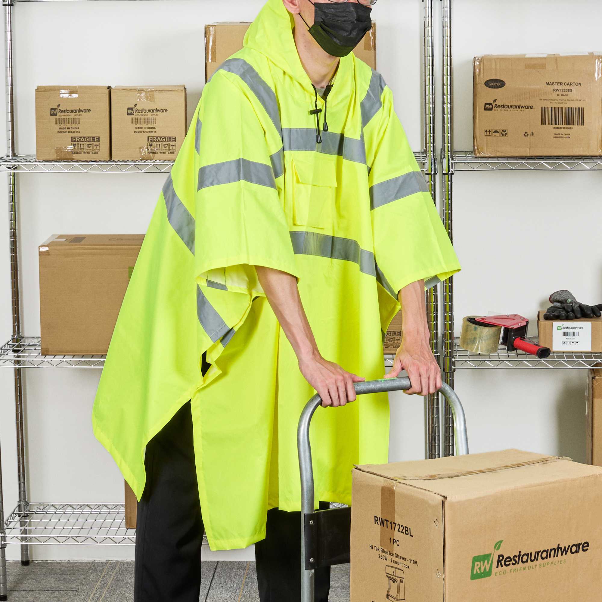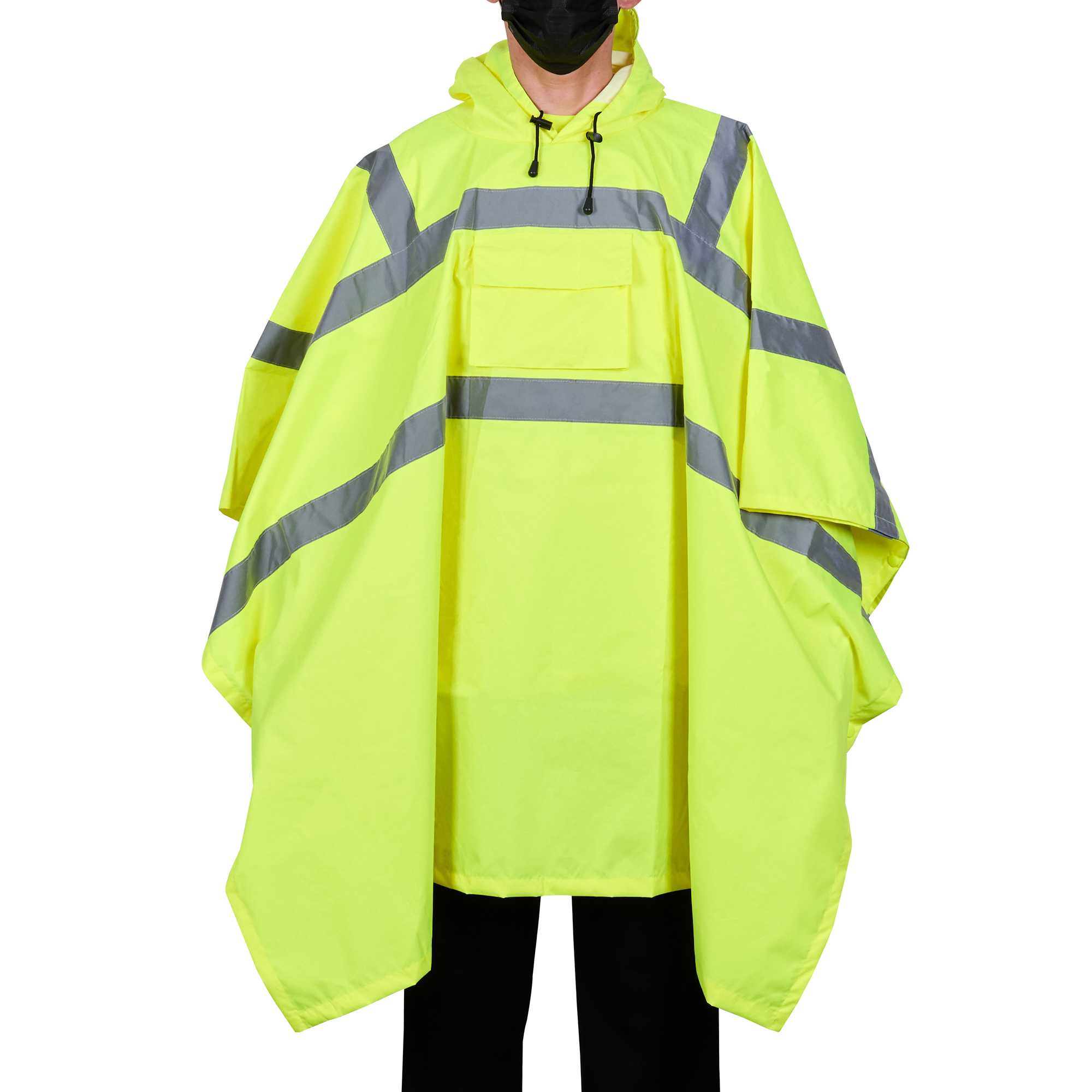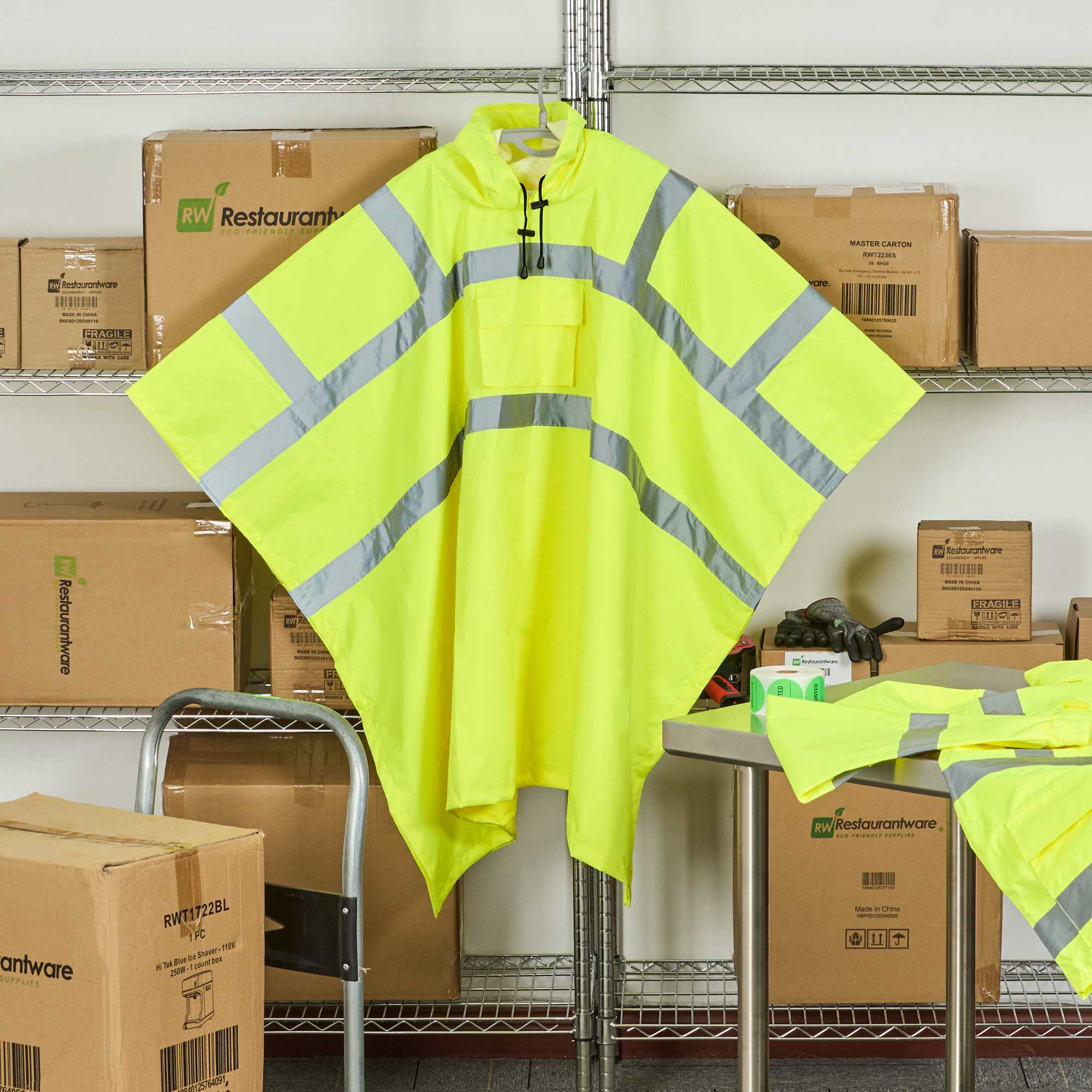 Enhance safety and visibility with this protective gear. The Be Safe Waterproof Waterproof Poncho - Lime, Plastic, Reflective, Windproof, 55.12 inches x 80 inches is designed with a hi-vis lime color to ensure staff visibility on-site, making it an essential waterproof poncho for outdoor workers. This reflective rain poncho features Class 3 reflective stripes, significantly enhancing safety in dim environments. Made from durable plastic, its 100% waterproof design with stitched and taped seams ensures reliable protection against the elements while remaining breathable for comfort on summer days. The hooded rain poncho's snap side closure allows for quick removal during emergencies, ensuring that your team can respond swiftly to any situation. Its machine-washable property adds convenience, making it easy to maintain cleanliness and hygiene. Equip your staff with this recyclable, windproof poncho to boost safety in high-risk environments. Sold in a 20 count box.
