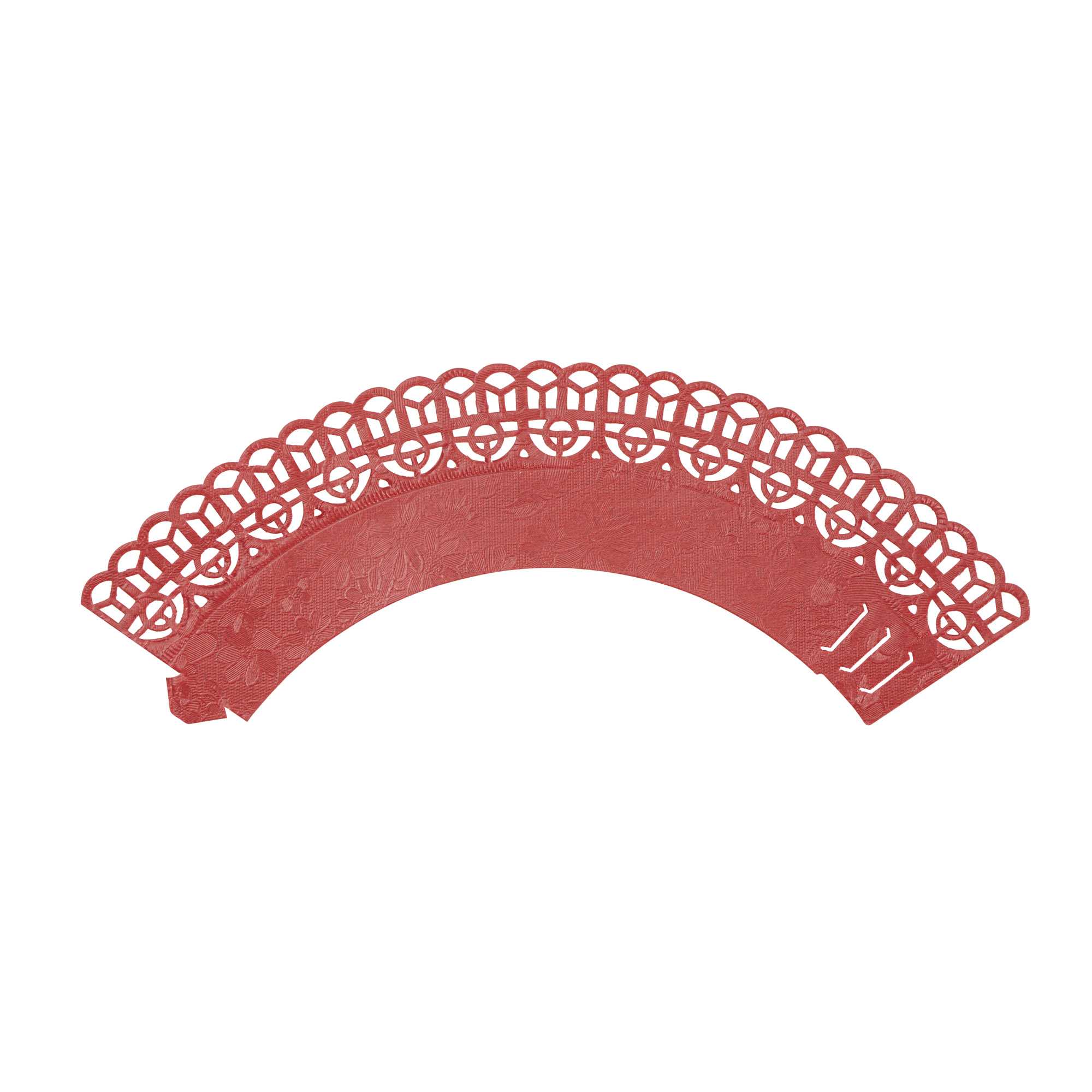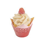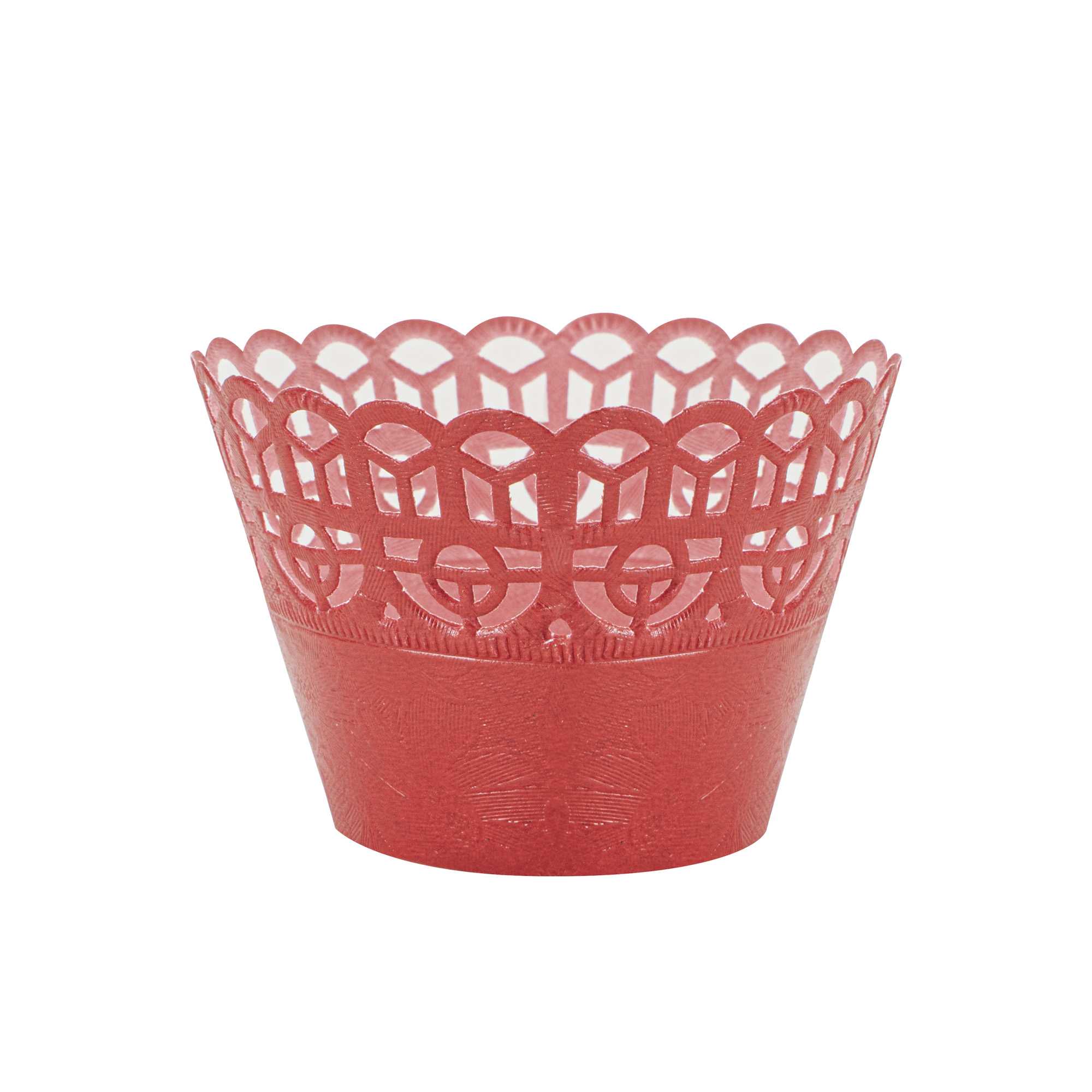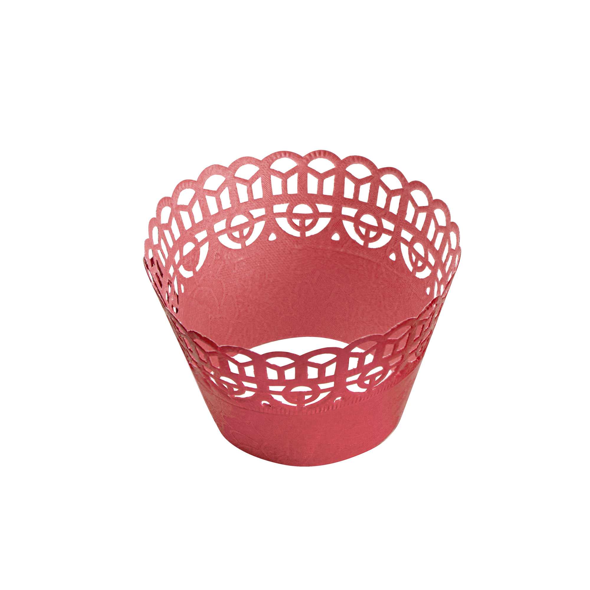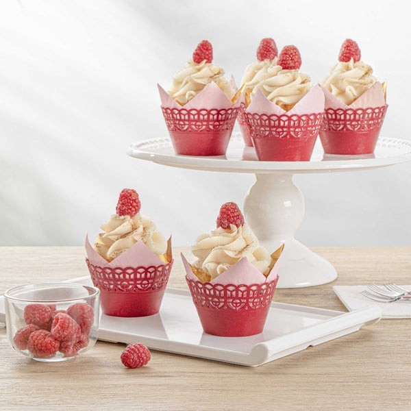 Dress cupcakes and muffins to impress your guests with our Bellissimo Round Cherry Red Paper Cupcake Wraps. Designed with trendsetting lace cutouts, these cupcake wrappers effortlessly enhance the presentation of buttercream-frosted chocolate cupcakes or blueberry-studded buttermilk muffins. Made from premium paper, these lace cupcake wrappers are sturdy to hold the cupcakes. These paper cupcake wrappers feature a tab and three adjustment lines to perfectly close the cupcakes for your desired size. Featuring a cherry red shade, these unique cupcake wrappers add a vibrant touch to a regular cupcake presentation. To minimize your carbon footprint, these disposable red cupcake wrappers are recyclable after large events. These paper cupcake wrappers are suitable for decorative use to elevate the presentation. Measuring 2.25 inches in diameter by 2 inches in height, these round cupcake wrappers are ideal for bakeries, cake shops, and catered events. Shipped in a 200 count box.