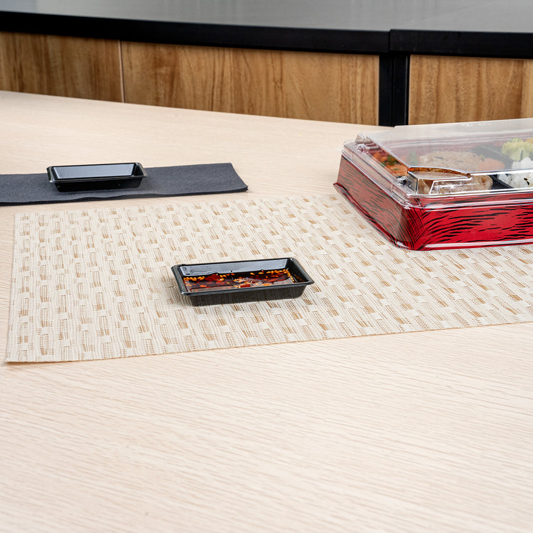 Enhance your presentation with versatile mini sauce dishes. Bento Tek Black Plastic Mini Sauce Dish offers a sleek design, perfect for showcasing sauces and dressings in a professional setting. This 3-inch by 2.2-inch dish is lightweight and portable, ensuring easy transport throughout bustling kitchens. Its disposable nature eliminates the need for washing, significantly reducing cleanup time in high-volume environments. This black plastic dipping bowl is not only practical but also hygienic, providing a safe option for serving condiments. With dimensions that complement any table setting, it is suitable for holding most liquids and sauces. Elevate your service with these disposable condiment cups and streamline your operations effortlessly. Each order includes 1000 Bento Tek Black Plastic Mini Sauce Dish.