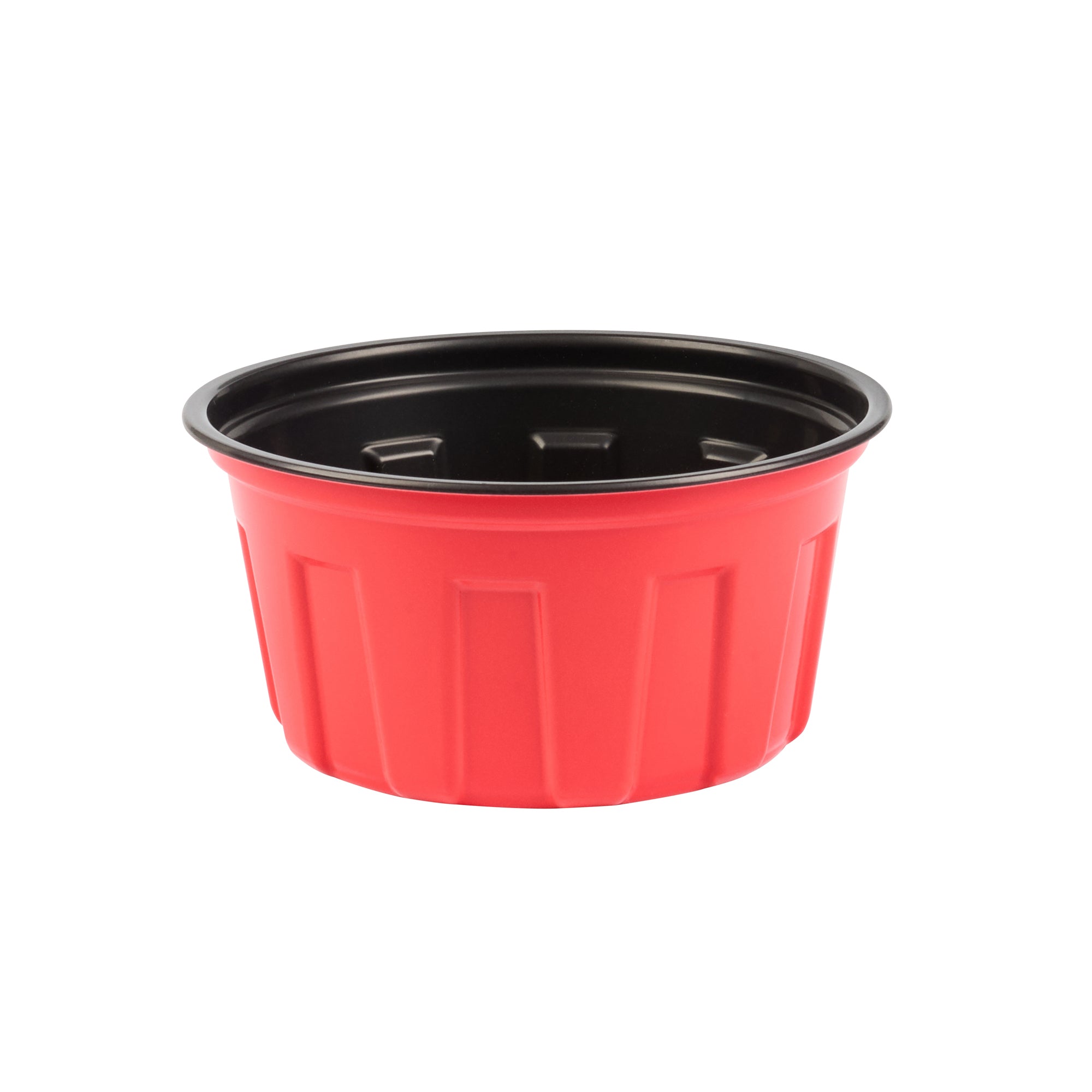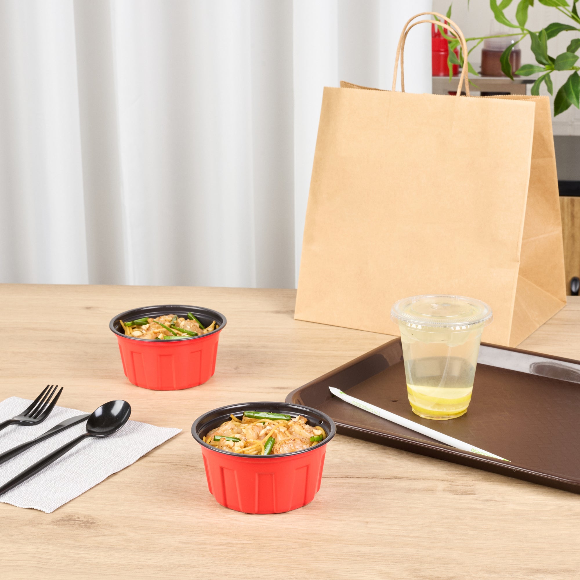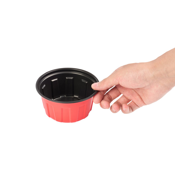 Elevate the way you package sides, snacks, and small portions with our Bento Tek 12-ounce Round Red Plastic To Go Boxes. Designed for strength and reliability, these containers are made from BPA-free, crack-resistant plastic that holds up under the pressures of fast-paced foodservice. Their microwave-safe design makes reheating convenient, ensuring meals are served warm and ready. The bold red exterior with a contrasting black interior delivers eye-catching presentation and reinforces a clean, professional image. For added security during transport, use with our clear plastic lids (SKU: RWP1915C-50) to help lock in freshness and minimize spills. Their compact, stackable shape maximizes storage space and keeps deliveries neatly organized. Measuring 4.72 inches in diameter by 2.24 inches in height, these containers hold up to 12 ounces. Sold in a 50 count box.