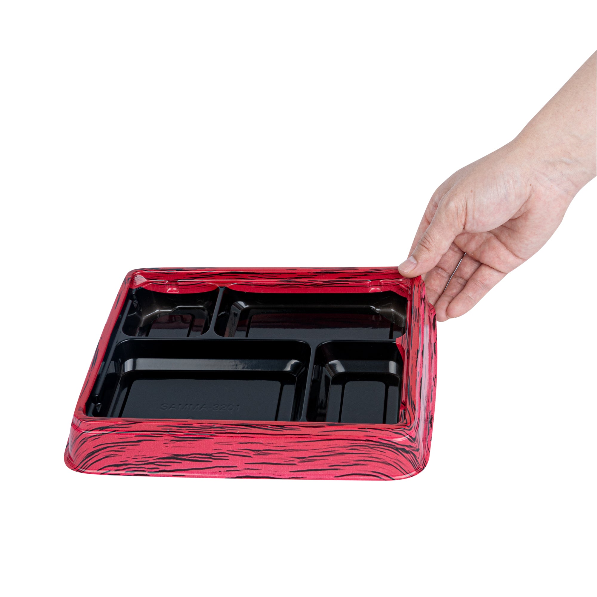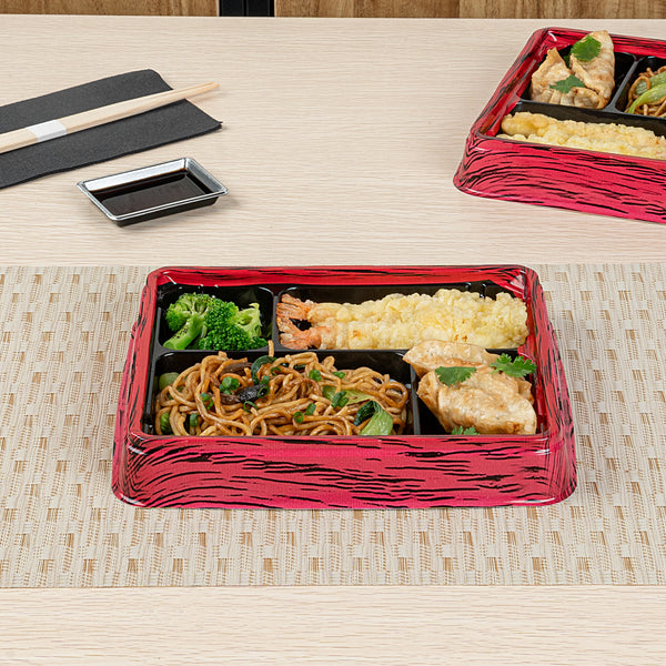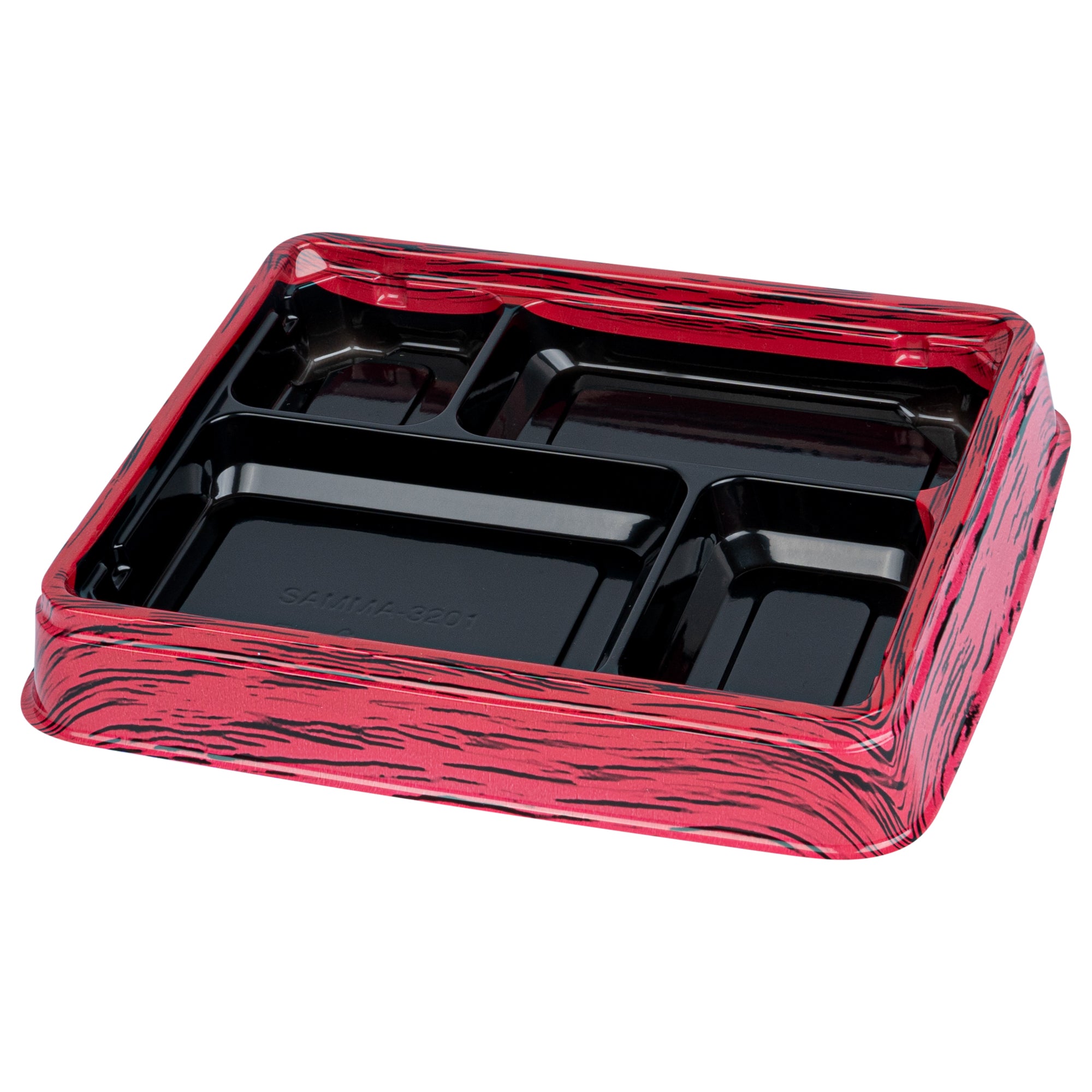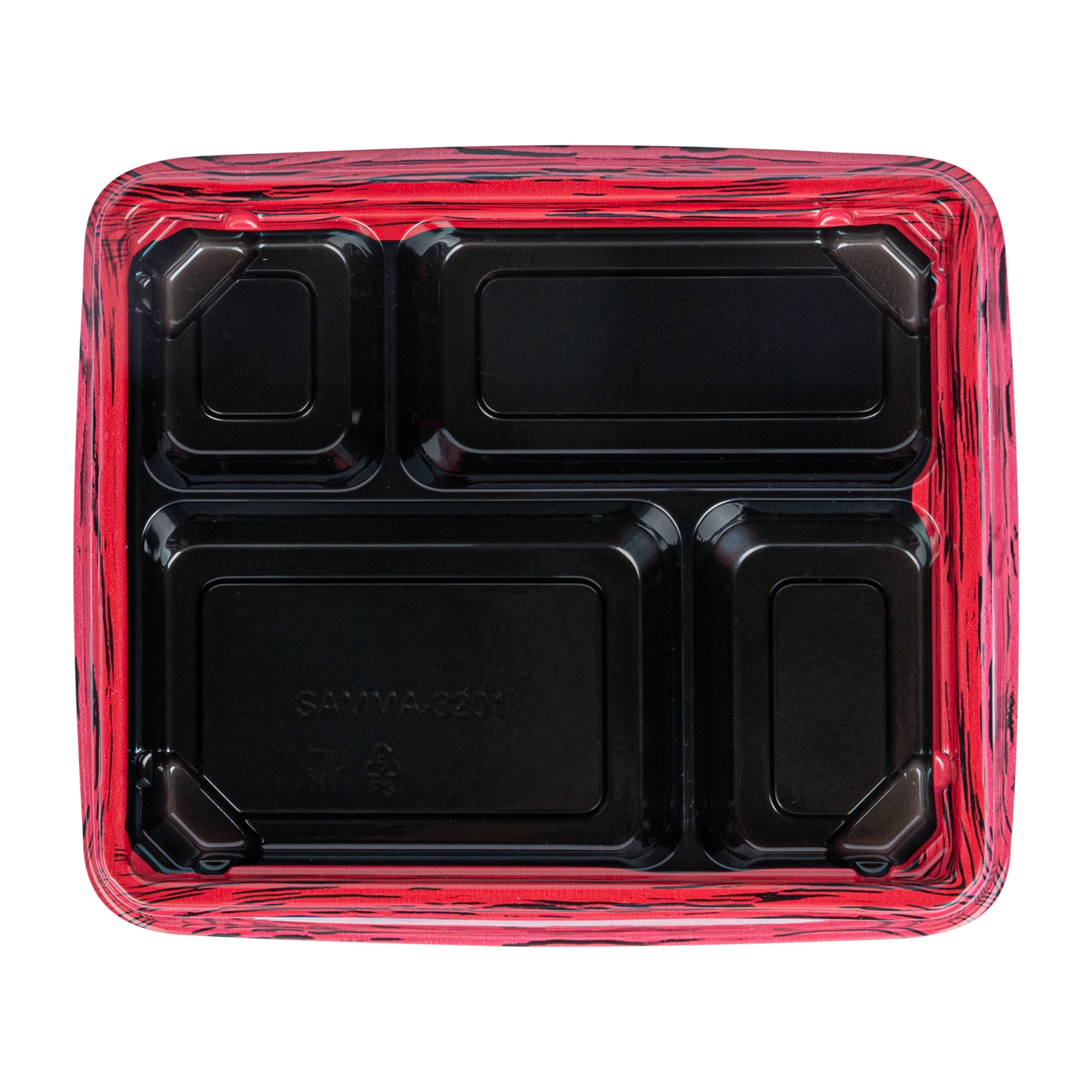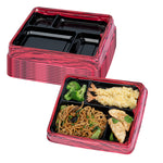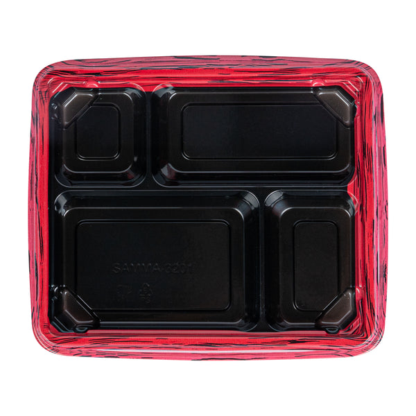 15 OZ RECTANGLE RED AND BLACK PLASTIC BENTO BOX - 4 COMPARTMENTS