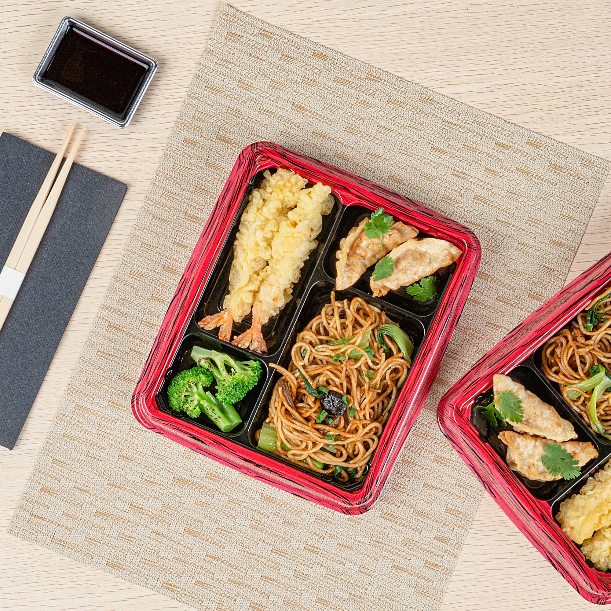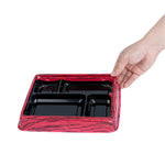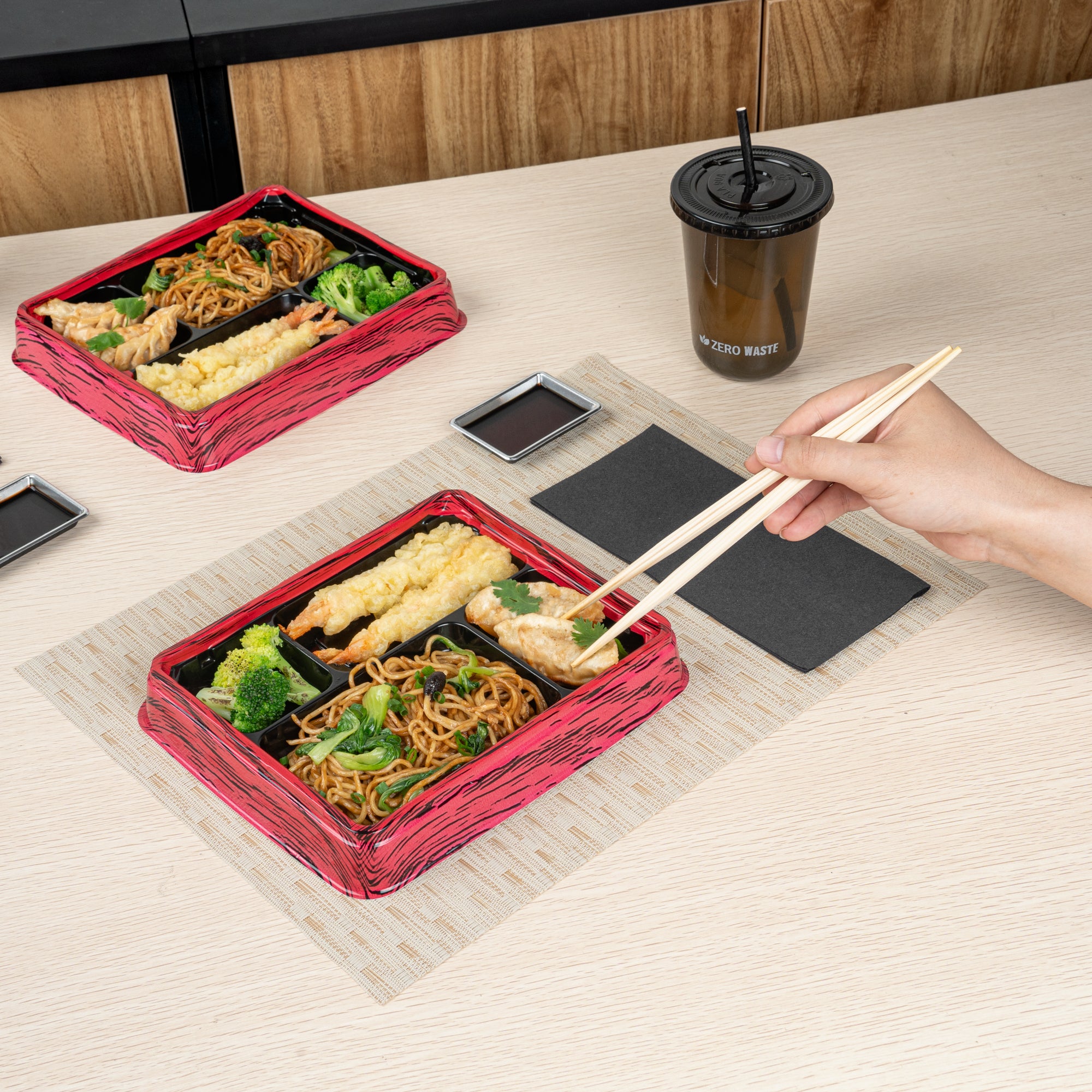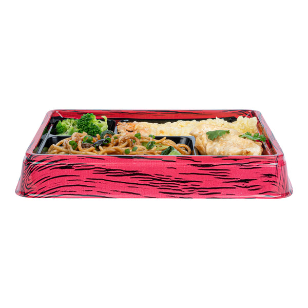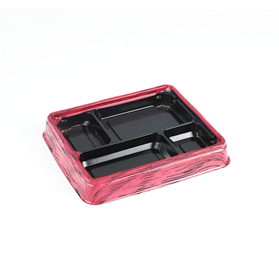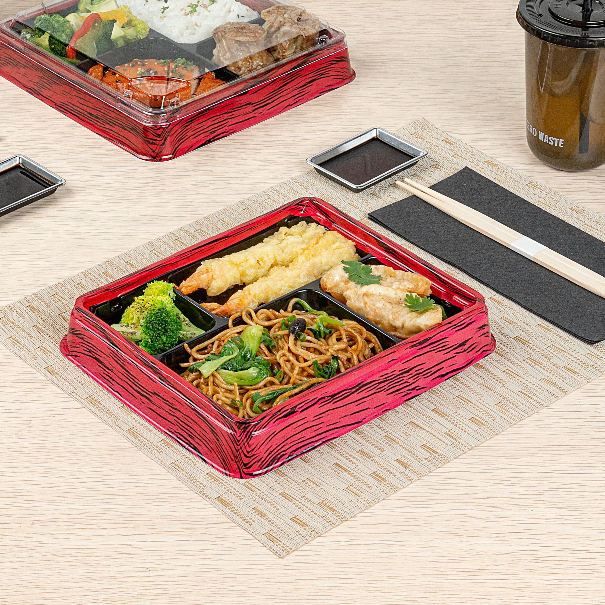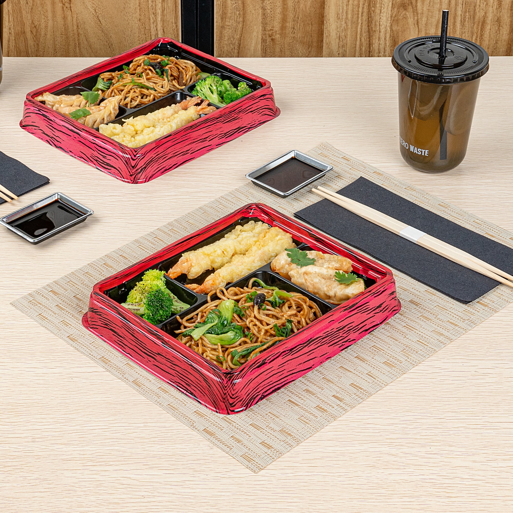 15 OZ RECTANGLE RED AND BLACK PLASTIC BENTO BOX - 4 COMPARTMENTS