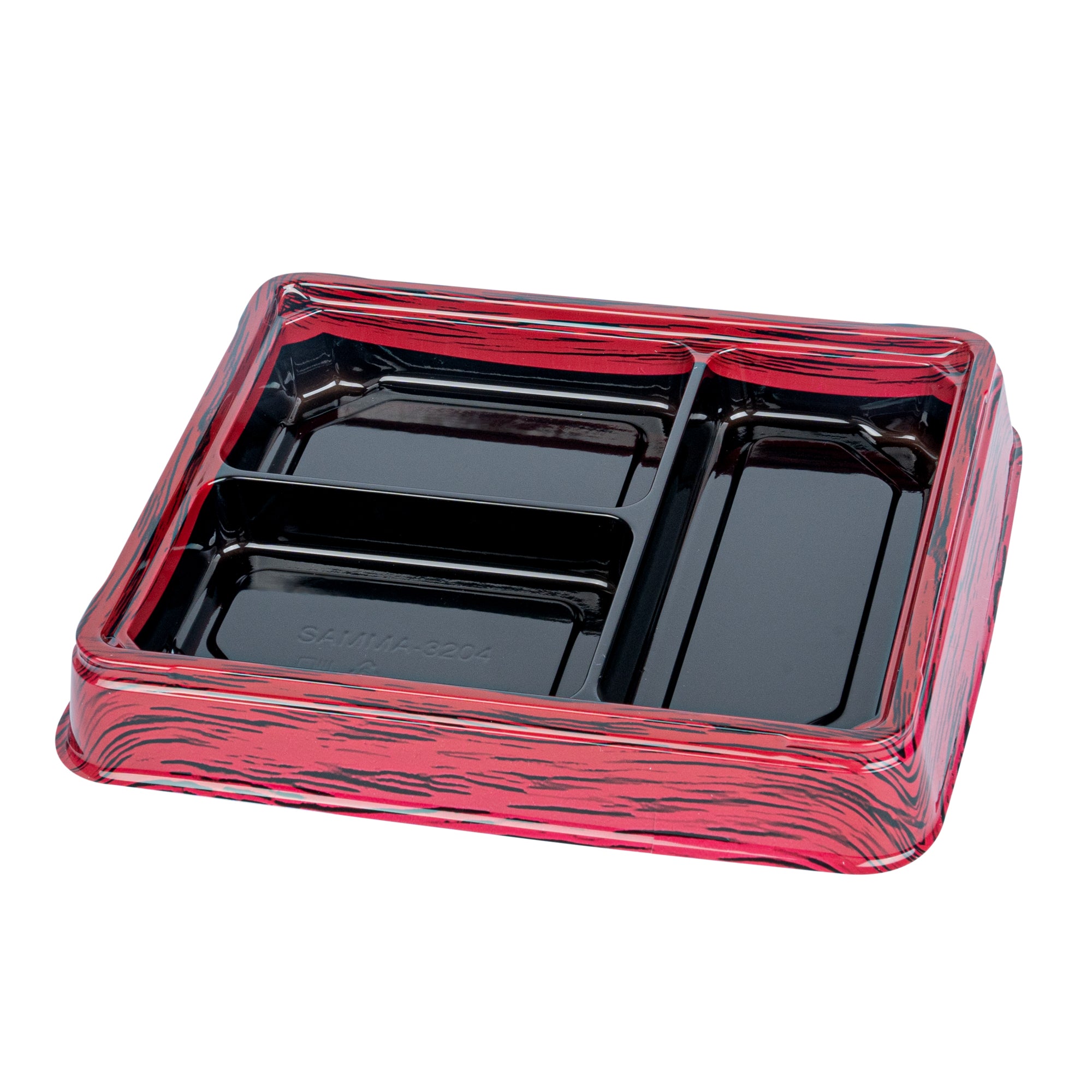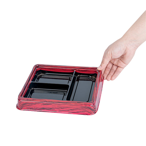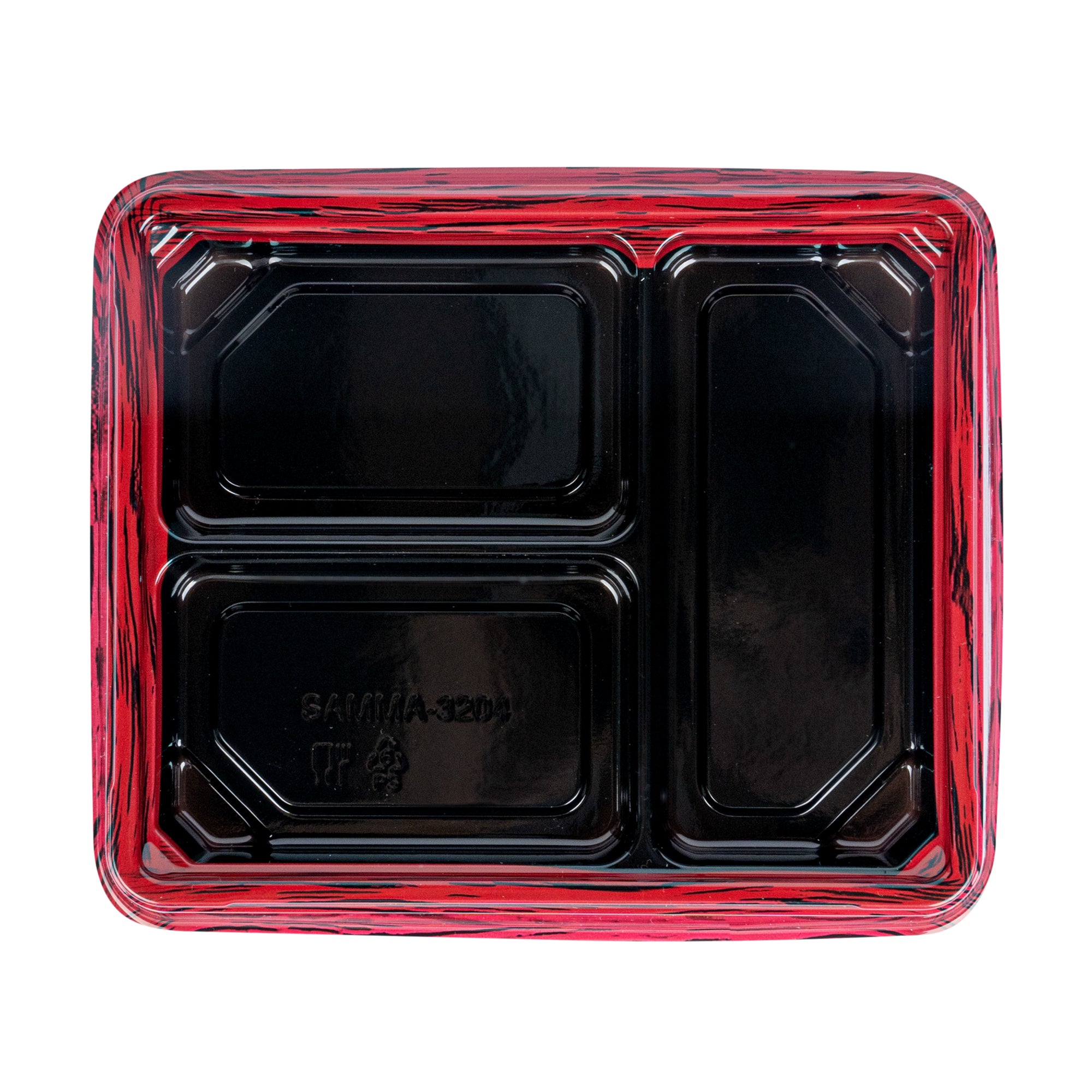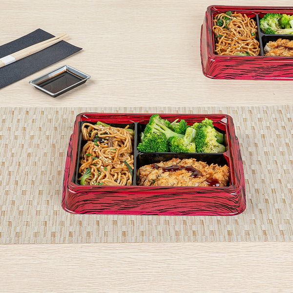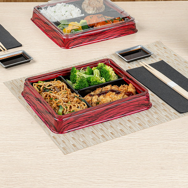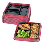 16 OZ RECTANGLE RED AND BLACK PLASTIC BENTO BOX - 3 COMPARTMENTS