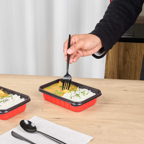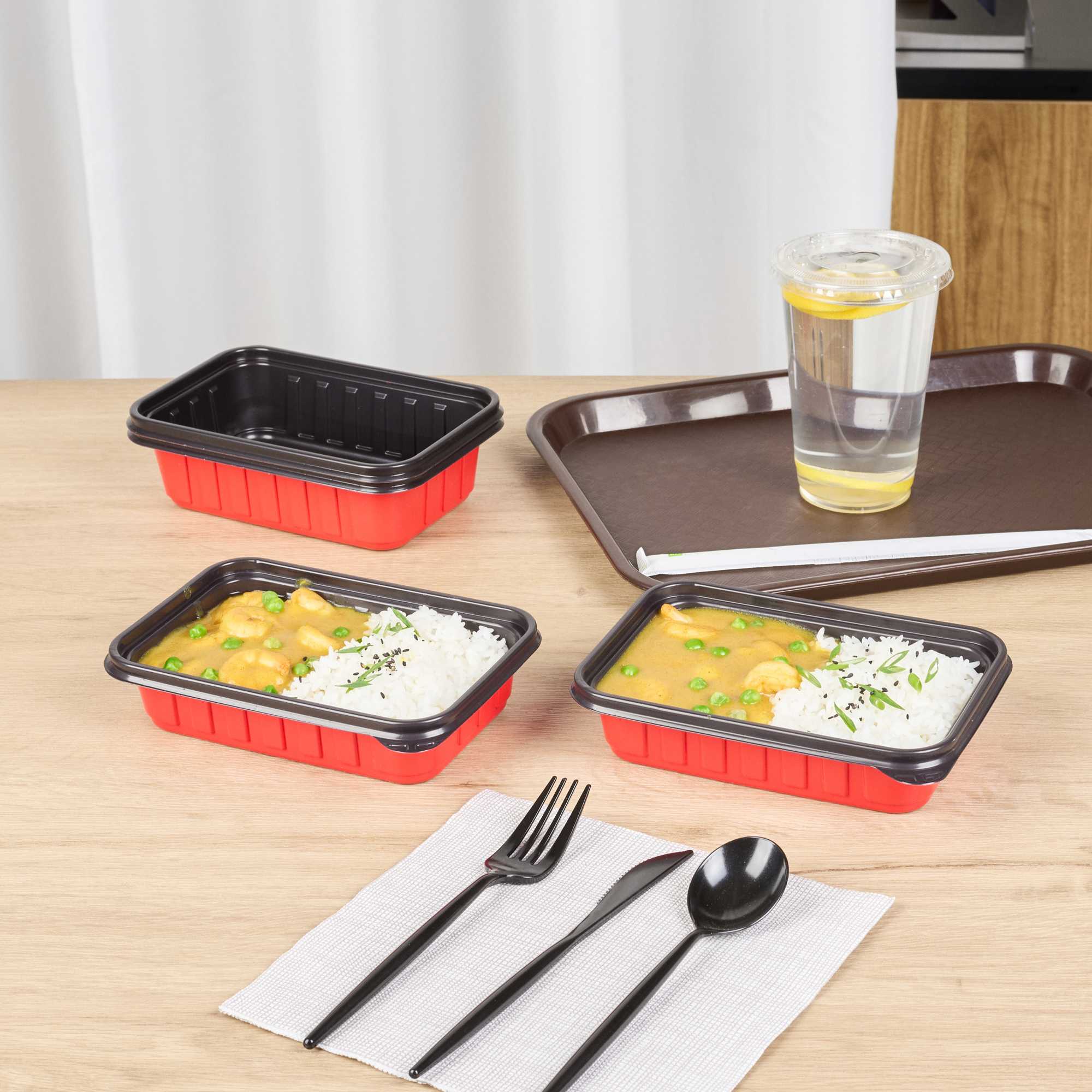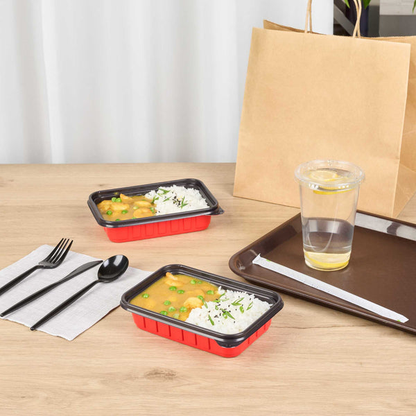 Ensure smooth transportation of your culinary creations with our Bento Tek 16-ounce Rectangle Red Plastic To Go Boxes. These containers are microwave-safe for quick reheating of meals. Made from crack-resistant plastic, these lunch containers ensure durability in the kitchen while being BPA-free, reaffirming their suitability for a variety of foodservice needs. Pair these take out containers with our compatible clear plastic lids (SKU: RWP1924C) for a secure seal. The two-color design in red and black improves brand visibility and gives your take out orders a professional look, helping you stand out in a competitive market. These stackable and disposable containers fit neatly into delivery bags, optimizing space and organization. Measuring 7.17 inches in length by 4.84 inches in width by 1.58 inches in height, these to go boxes feature a 16-ounce capacity for compact and efficient food storage. Sold in a 200 count box.