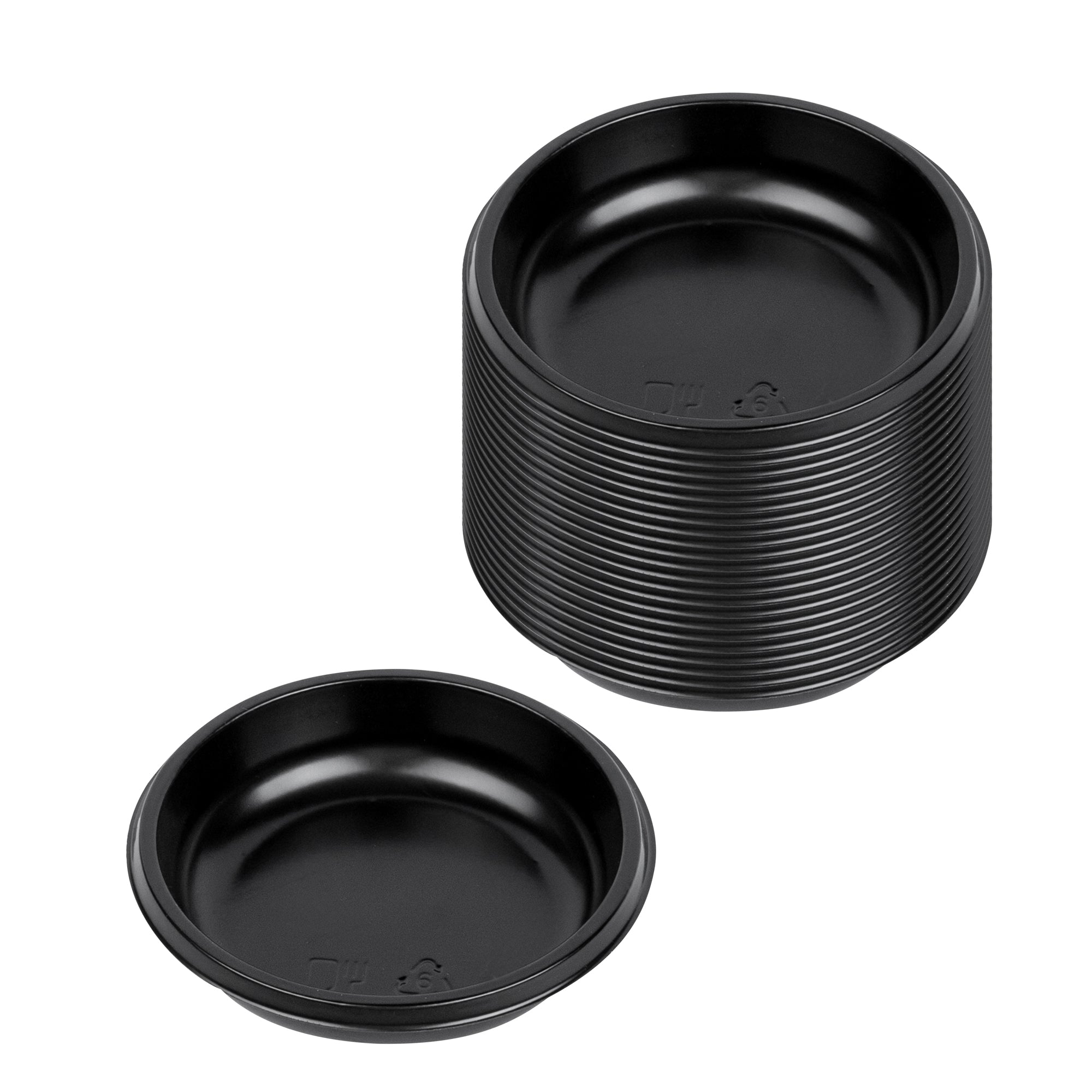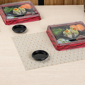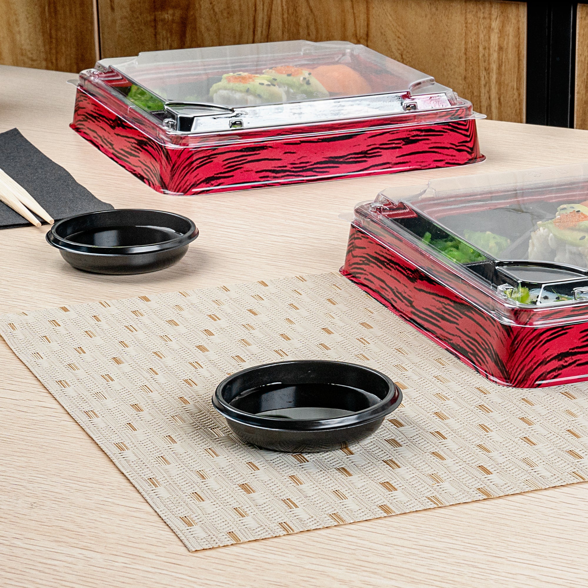 Serve soy sauce with our Bento Tek 2-ounce Round Black Plastic Sauce Dishes. Created from premium plastic, these sauce dishes are durable and sturdy, making them ideal for holding sauces, dip, and condiments. These dip dishes are versatile and excellently display your soy sauce with exquisite sushi at a buffet or serve tangy ketchup with crispy onion rings at foodservice establishments. The classic round shape of these sauce plates provides a timeless and elegant look, suitable for any dining experience. With an elegant black finish, these sauce bowls complement a wide variety of table settings. These soy sauce bowls are disposable and can be discarded after use for an easy cleaning experience. Ideal for eco-conscious restaurants, these disposable sauce bowls are recyclable. Measuring 3 inches in diameter by 0.75 inches in height, these black sauce plates can hold up to 2 ounces. Sold in a 100 count box.