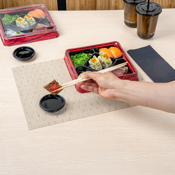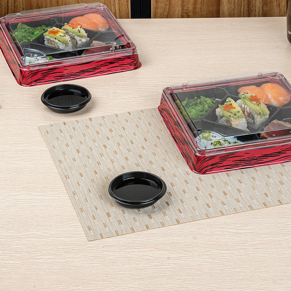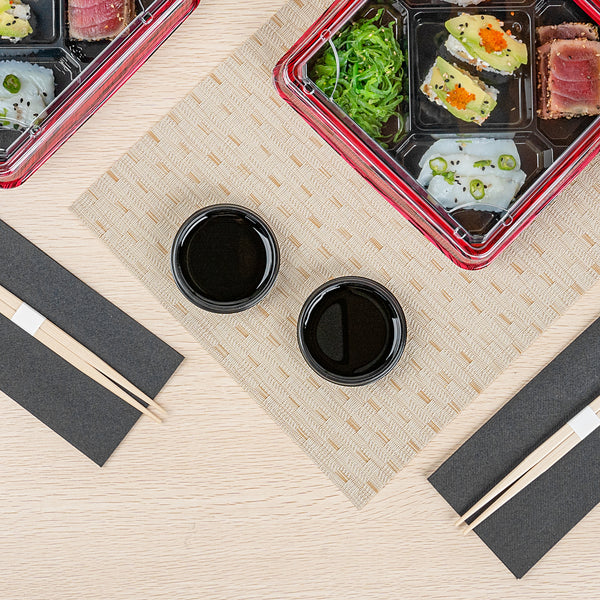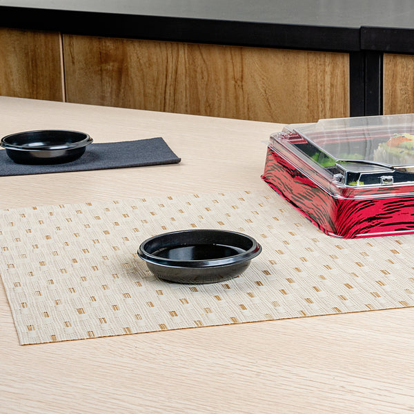 Serve soy sauce with our Bento Tek 2-ounce Round Black Plastic Sauce Dishes. Created from premium plastic, these sauce dishes are durable and sturdy, making them ideal for holding sauces, dip, and condiments. These dip dishes are versatile and excellently display your soy sauce with exquisite sushi at a buffet or serve tangy ketchup with crispy onion rings at foodservice establishments. The classic round shape of these sauce plates provides a timeless and elegant look, suitable for any dining experience. With an elegant black finish, these sauce bowls complement a wide variety of table settings. These soy sauce bowls are disposable and can be discarded after use for an easy cleaning experience. Ideal for eco-conscious restaurants, these disposable sauce bowls are recyclable. Measuring 3 inches in diameter by 0.75 inches in height, these black sauce plates can hold up to 2 ounces. Sold in a 1,000 count box.