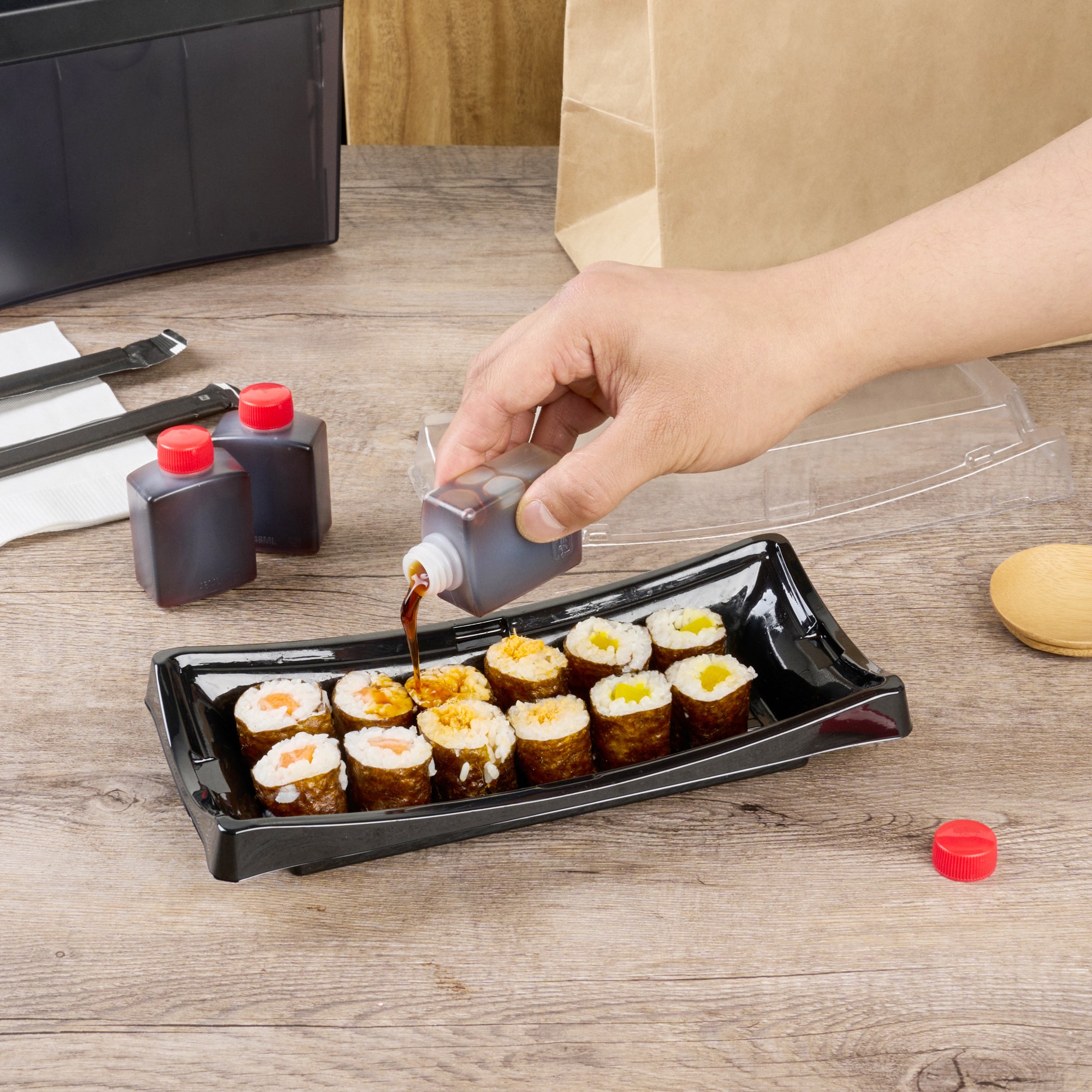 Optimize your sauce presentation with effortless cleanup. Bento Tek Translucent Plastic Disposable Soy Sauce Bottles are crafted from food-grade plastic, ensuring safety and hygiene for all your flavorful sauces. These lightweight containers simplify transport, making them ideal for catering events and on-the-go dining experiences. As a disposable soy sauce bottle, they eliminate the need to wash after use, streamlining your post-service routine. The translucent design allows for effortless identification of contents, enhancing the efficiency of your kitchen staff. Perfectly suited as a plastic sauce container, these bottles are freezer-safe and recyclable, supporting sustainable practices in foodservice operations. Invest in these versatile sauce dispenser bottles to enhance your condiment service and maintain operational efficiency. Each order includes 100 Bento Tek 2 oz Translucent Plastic Disposable Soy Sauce Bottles.