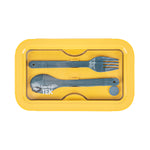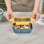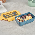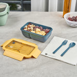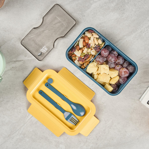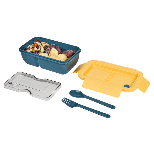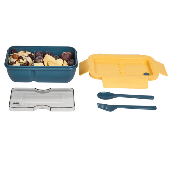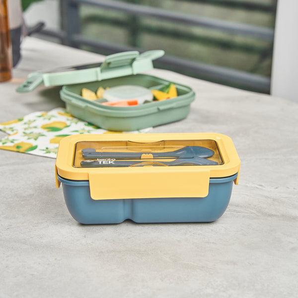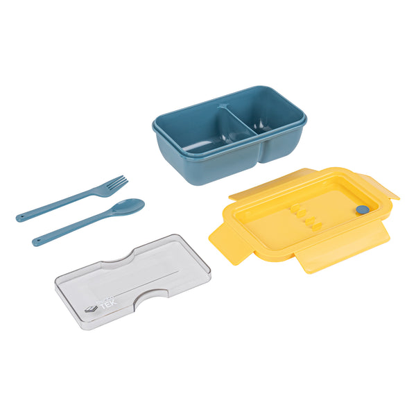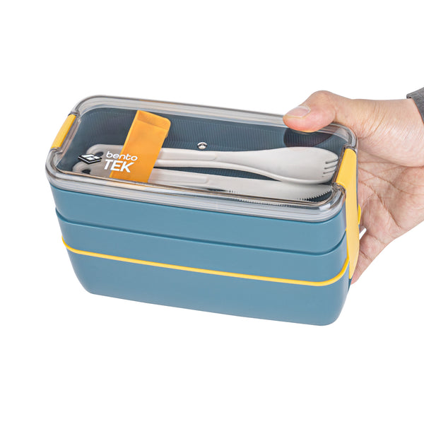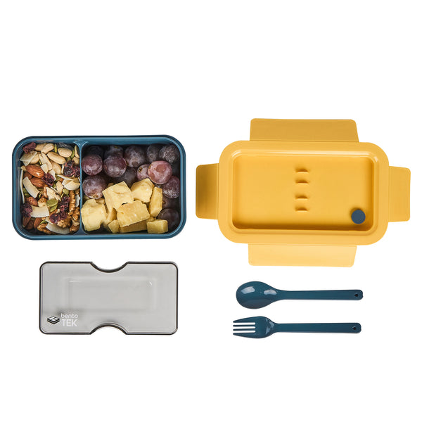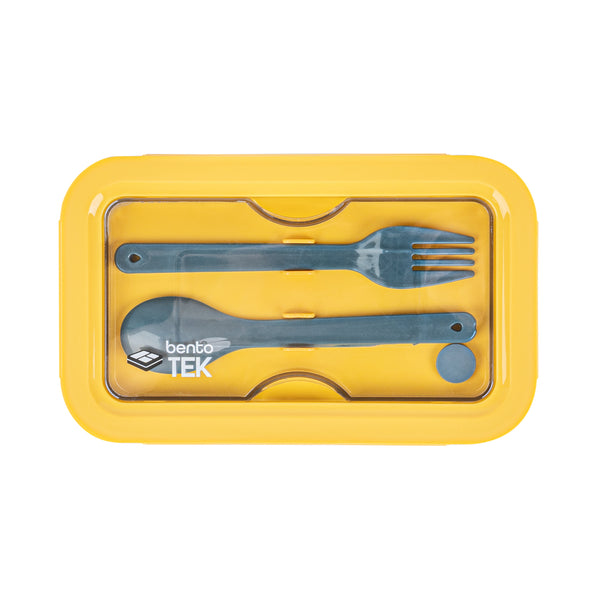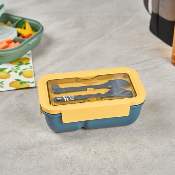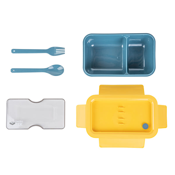 Bento Tek 29 oz Blue and Yellow Lunch Box - BPA-Free, Microwave-Safe, with Fork and Spoon - 7 3/4