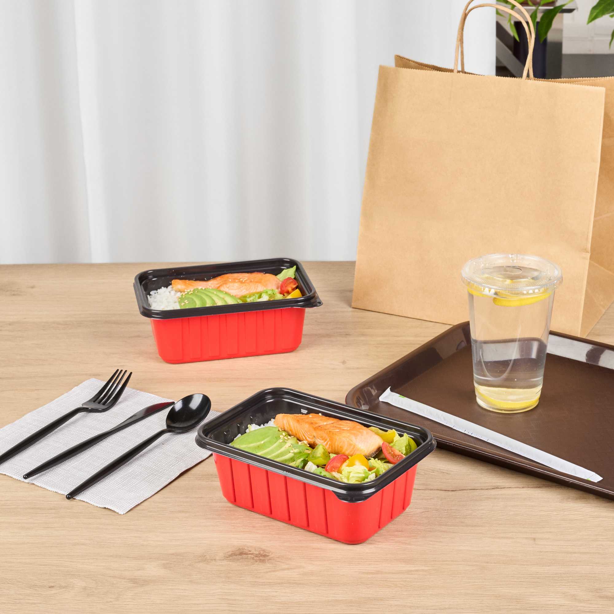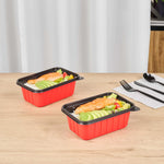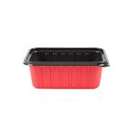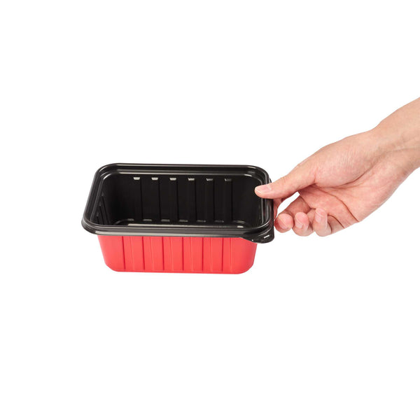 Deliver meals with style and reliability using our Bento Tek 30-ounce Rectangle Red Plastic To Go Boxes. Made from sturdy, crack-resistant, BPA-free plastic, these containers offer exceptional durability for busy foodservice operations. They are microwave-safe, allowing for convenient reheating of meals without compromising quality. Featuring a bold red and black two-tone design, these take out boxes elevate presentation and add a professional touch to your packaging. Pair them with our clear plastic lids (SKU: RWP1924C) for a secure, spill-resistant seal that keeps food intact during transport. Stackable and space-efficient, they fit neatly into delivery bags and streamline organization. Each container measures 7.17 inches in length by 4.84 inches in width by 2.64 inches in height, and holds up to 30 ounces. Sold in a 200 count box.