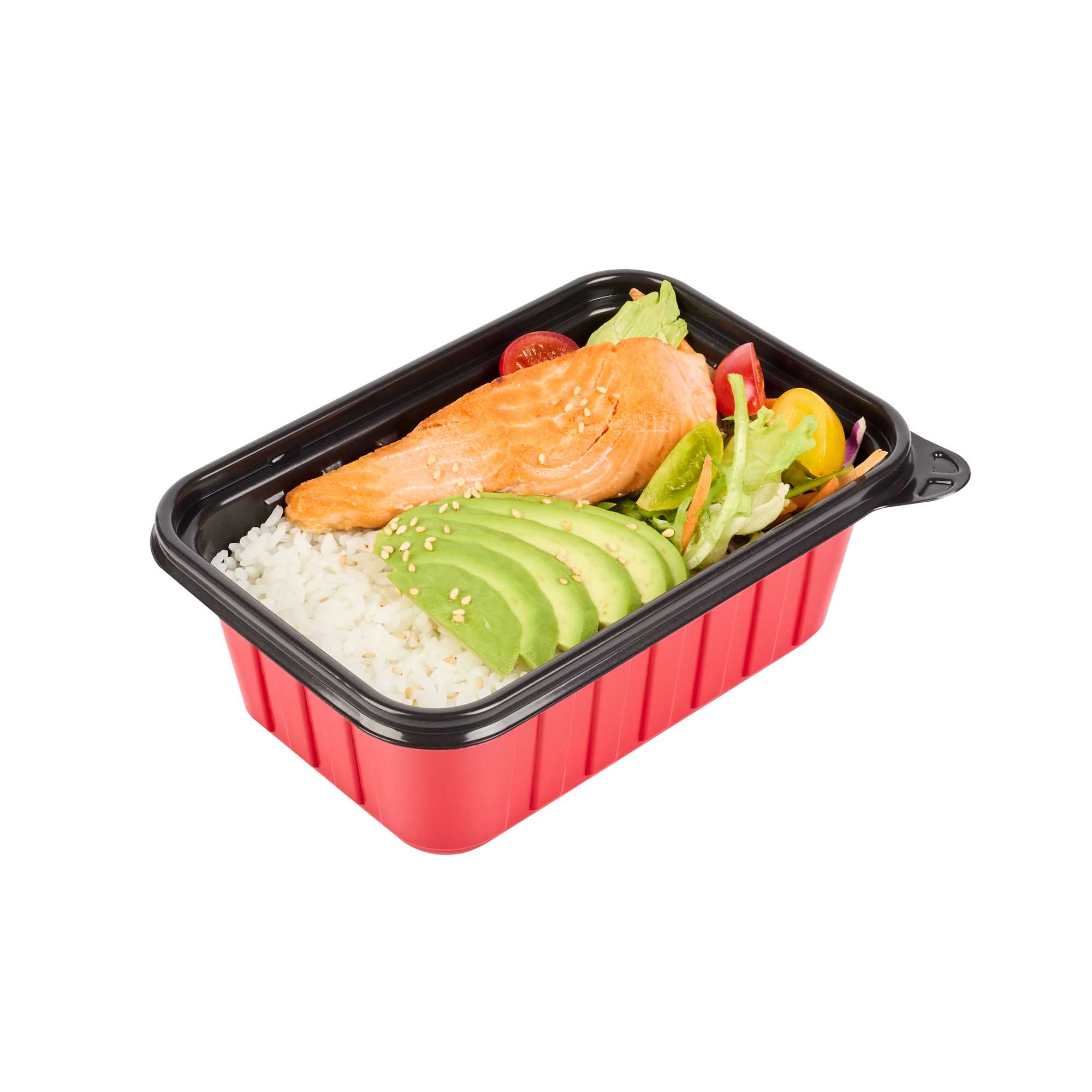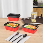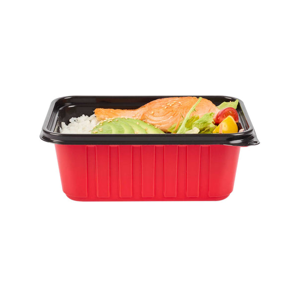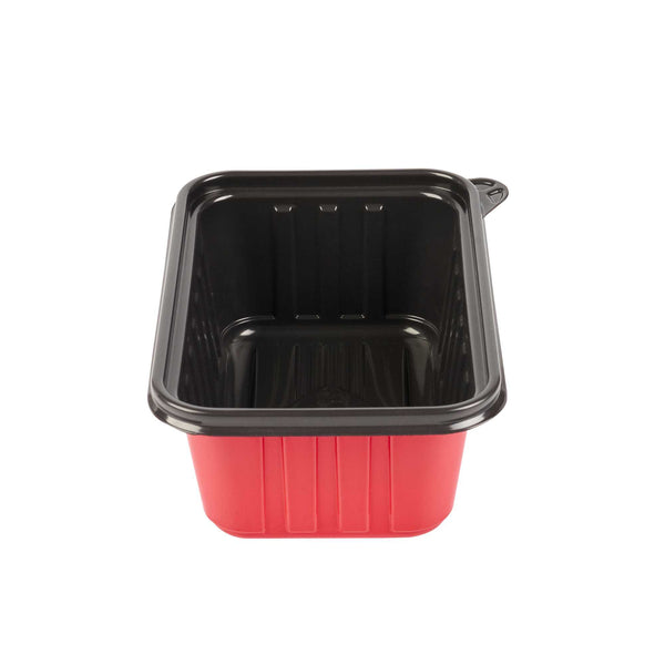 Deliver meals with style and reliability using our Bento Tek 30-ounce Rectangle Red Plastic To Go Boxes. Made from sturdy, crack-resistant, BPA-free plastic, these containers offer exceptional durability for busy foodservice operations. They are microwave-safe, allowing for convenient reheating of meals without compromising quality. Featuring a bold red and black two-tone design, these take out boxes elevate presentation and add a professional touch to your packaging. Pair them with our clear plastic lids (SKU: RWP1924C-50) for a secure, spill-resistant seal that keeps food intact during transport. Stackable and space-efficient, they fit neatly into delivery bags and streamline organization. Each container measures 7.17 inches in length by 4.84 inches in width by 2.64 inches in height, and holds up to 30 ounces. Sold in a 50 count box.